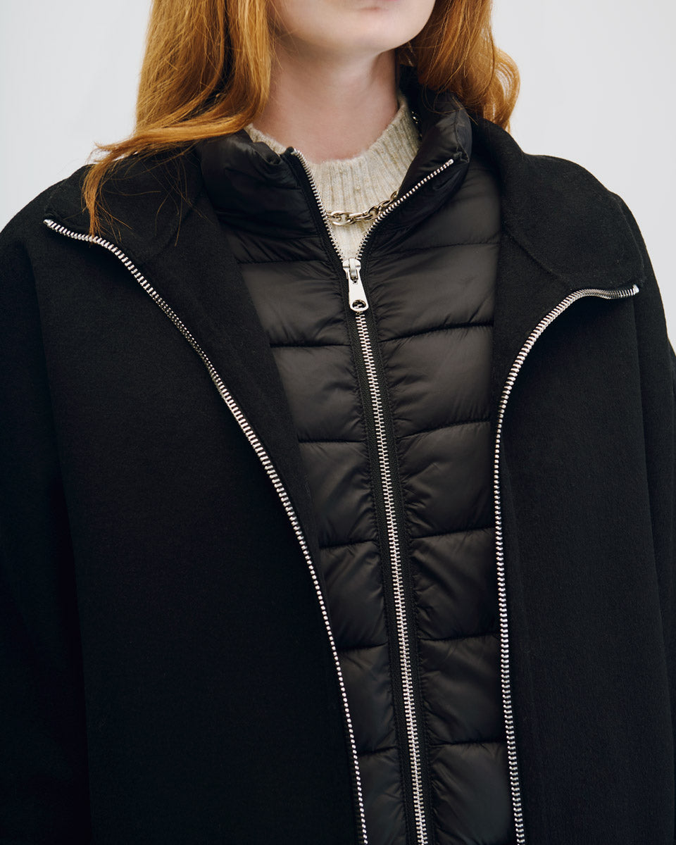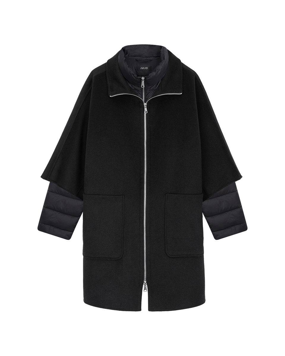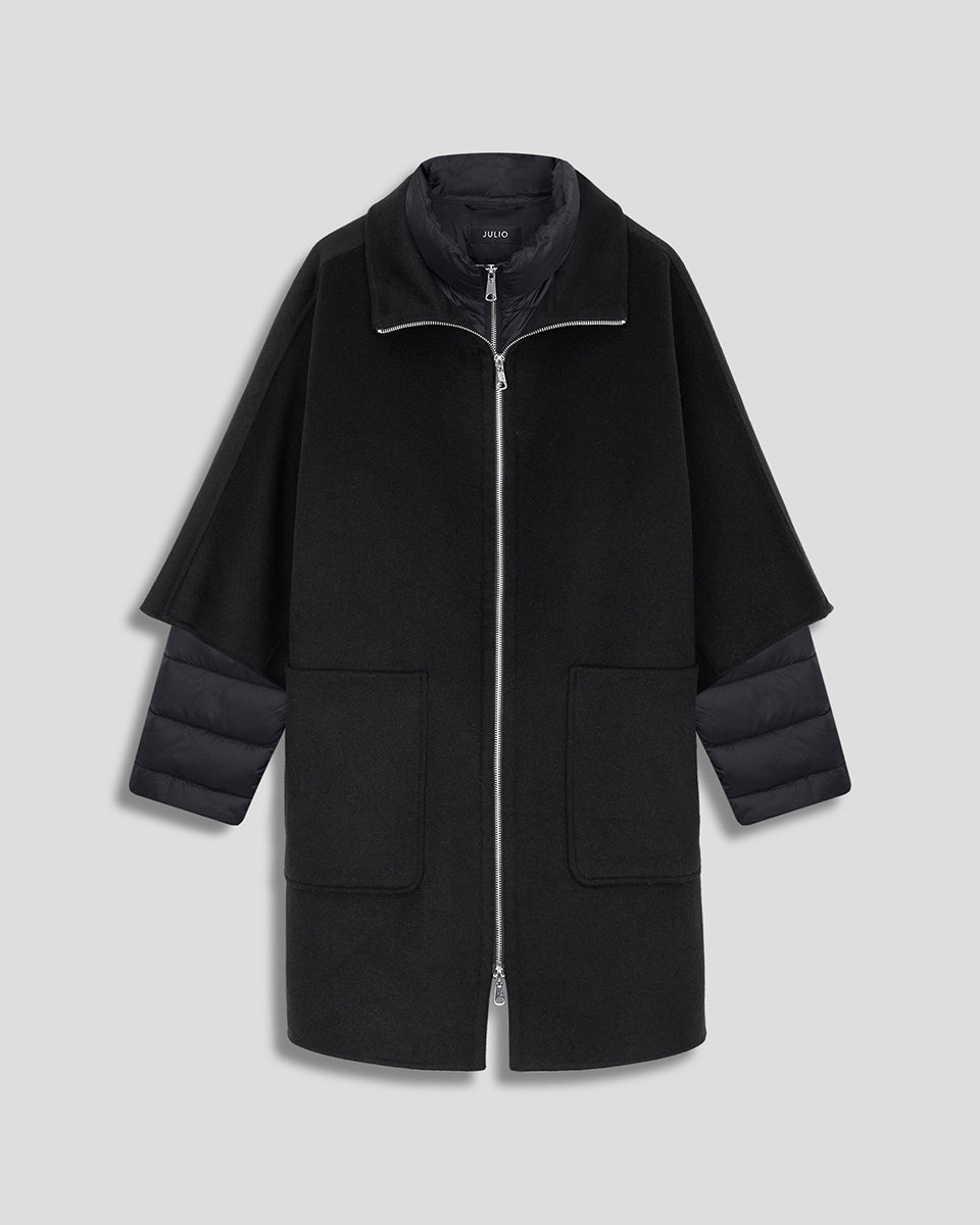 El abrigo negro con chamarra capitonada integrada ofrece estilo y funcionalidad en una sola pieza. Los maxibolsillos aportan un aire contemporáneo y práctico, mientras el diseño bicolor lo hace destacar. Ideal para días fríos o looks urbanos. Combínalo con jeans oscuros JULIO y una blusa de punto para un outfit casual con elegancia.