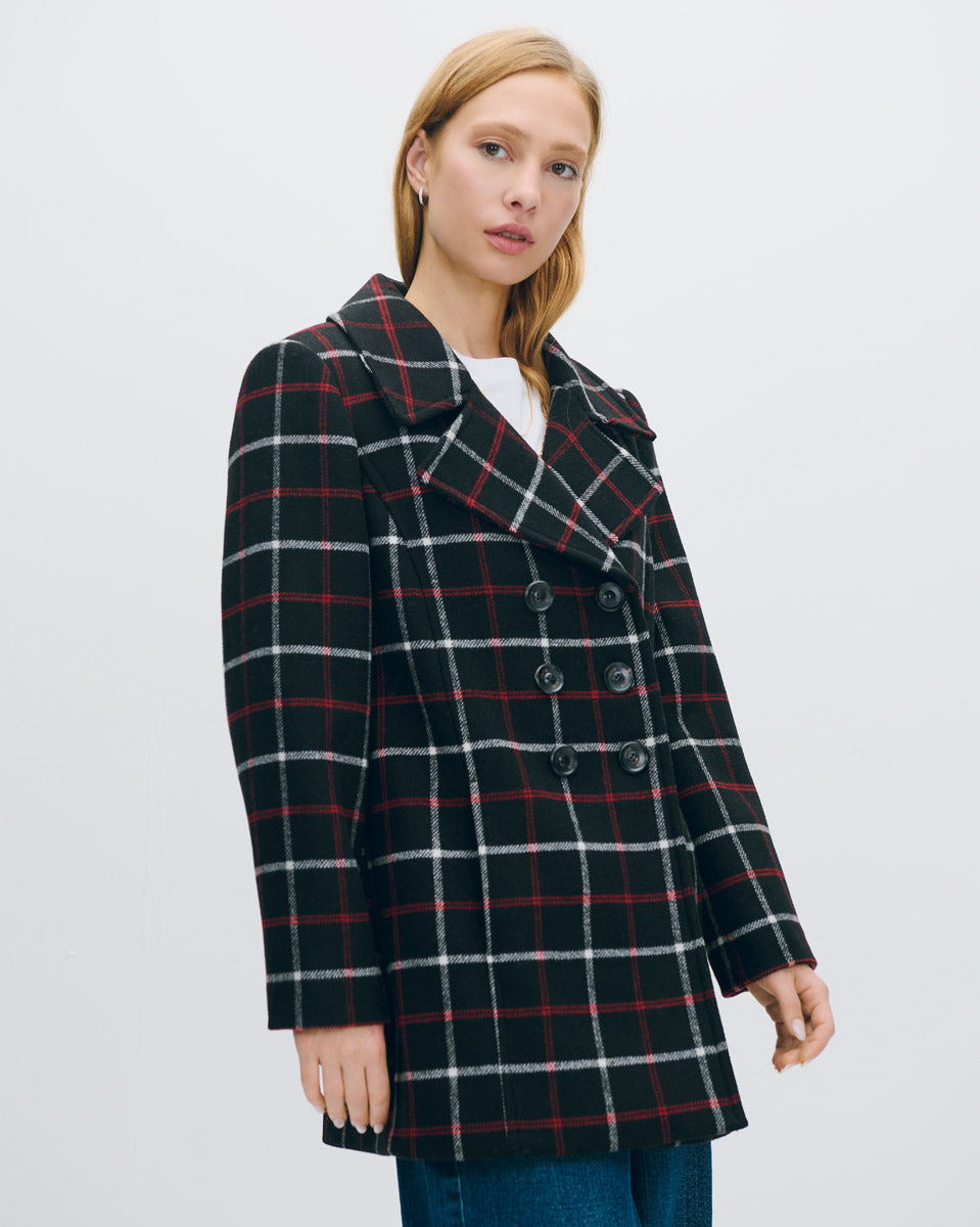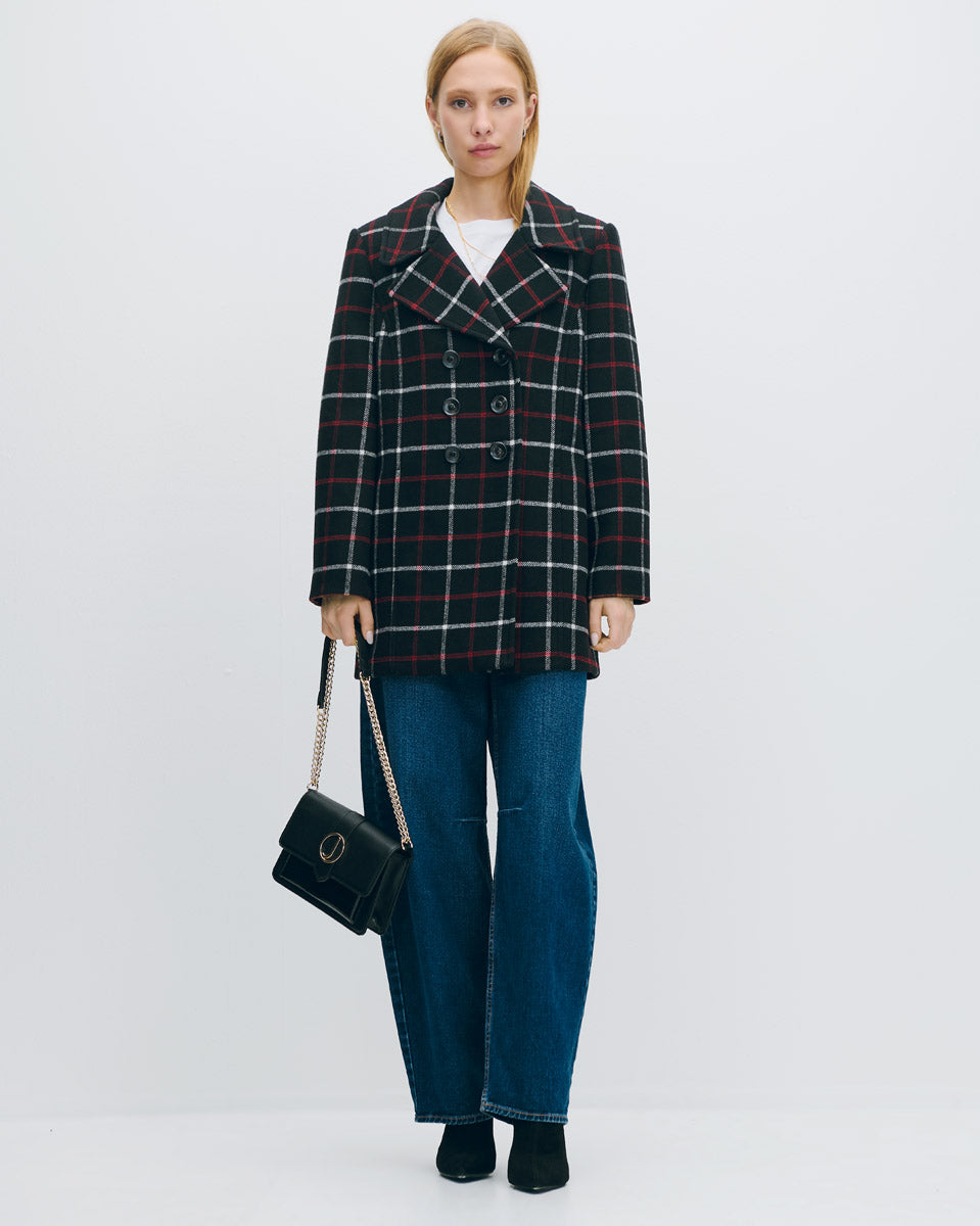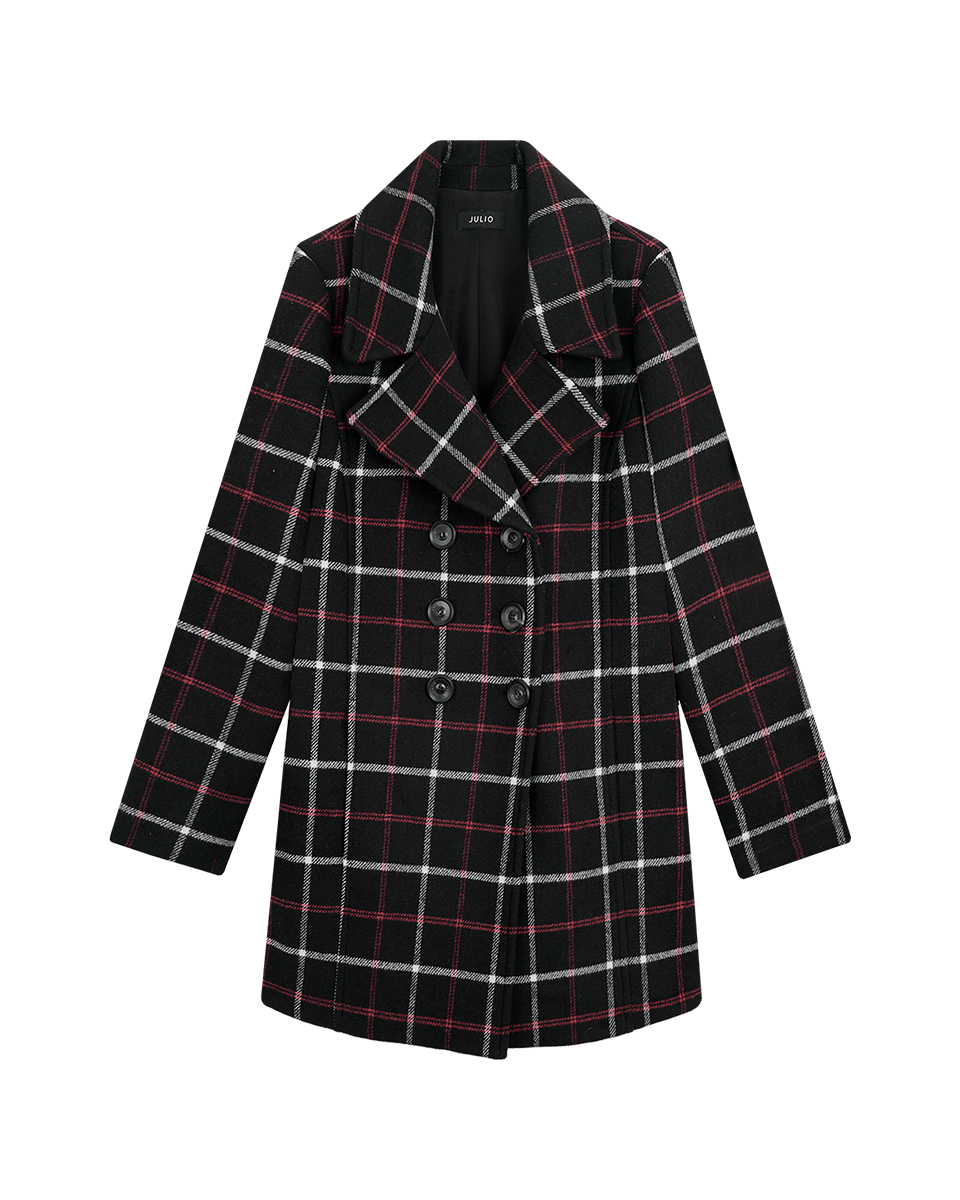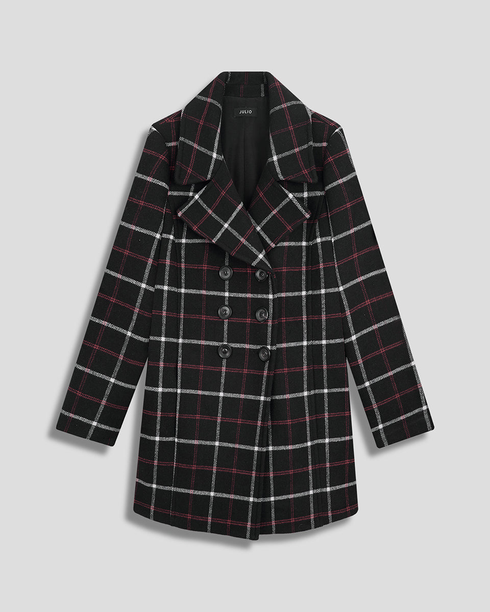 Un abrigo largo negro con cuadros rojos combina estilo y funcionalidad. Su estructura cruzada brinda un ajuste favorecedor y su tejido cálido lo convierte en la opción perfecta para los días de invierno. Úsalo sobre una blusa de punto color vino y unos pantalones rectos JULIO. Ideal para llevar al trabajo o a una cita nocturna.