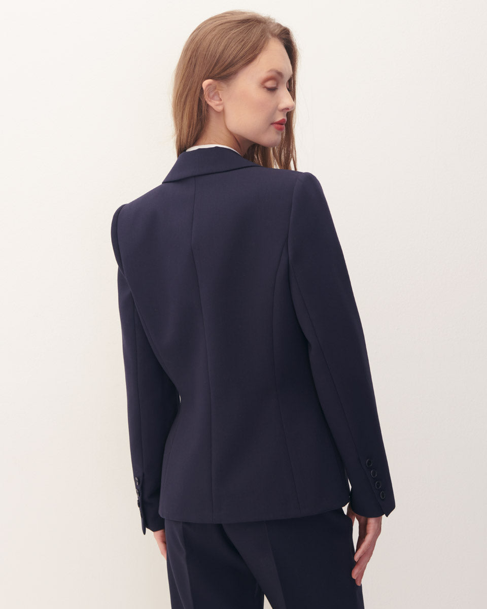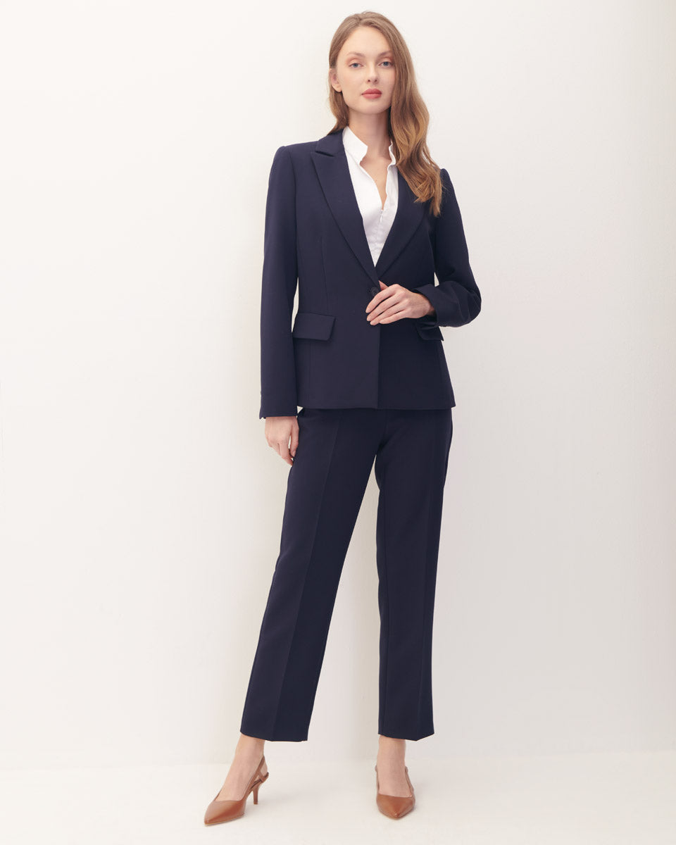 El blazer azul marino con solapa es una opción versátil y estilizada para el ámbito laboral, una apuesta segura para cualquier ocasión.