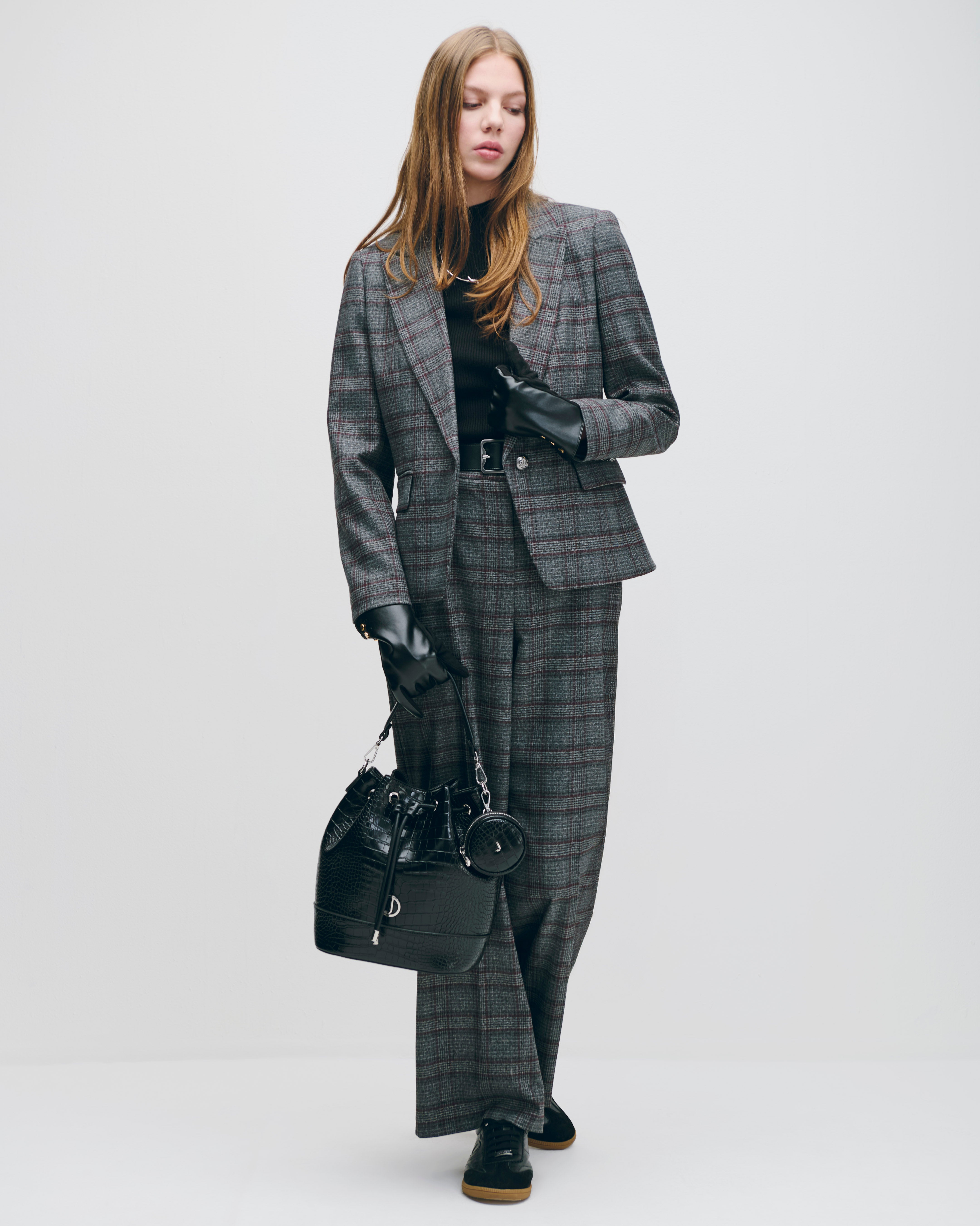 El estampado Príncipe de Gales en tono burdeos actualiza el clásico británico. Este blazer con solapa de pico añade elegancia y fuerza visual. Perfecto con jeans claros o pantalones neutros. Un must-have para lograr estilo sin esfuerzo.