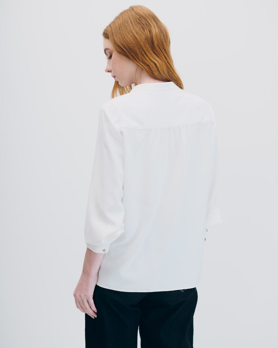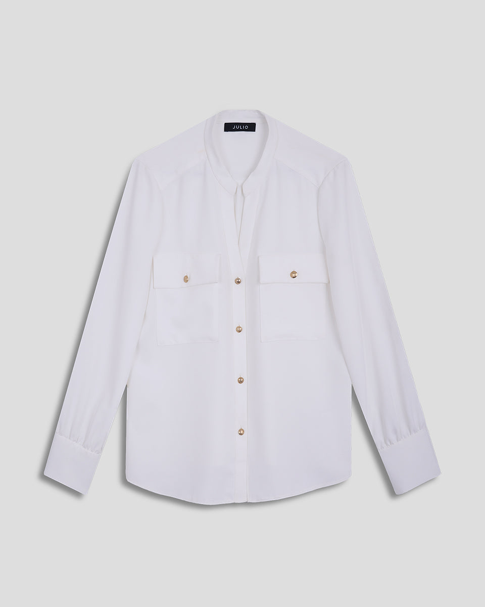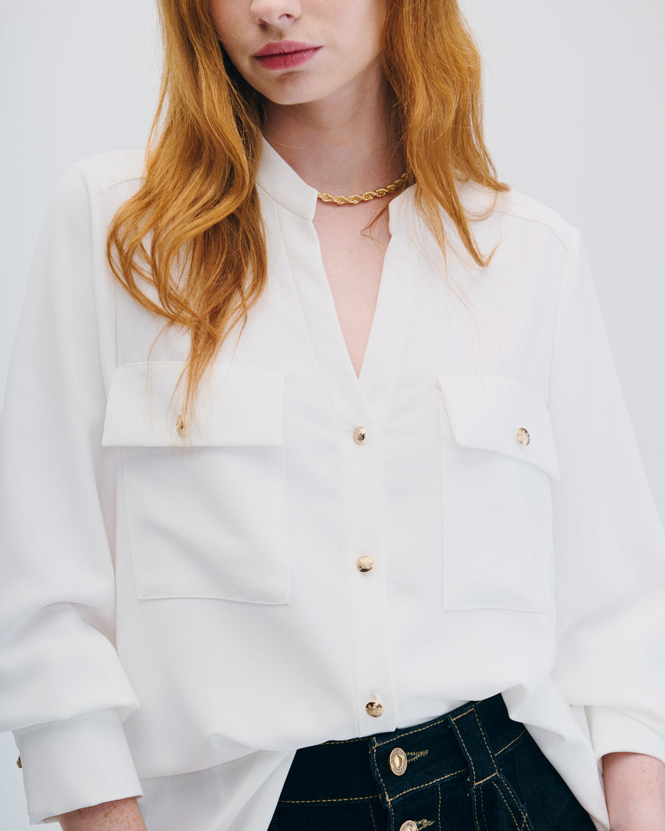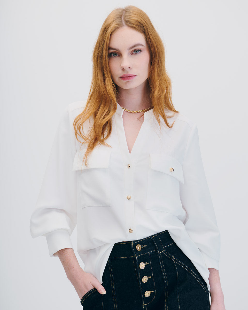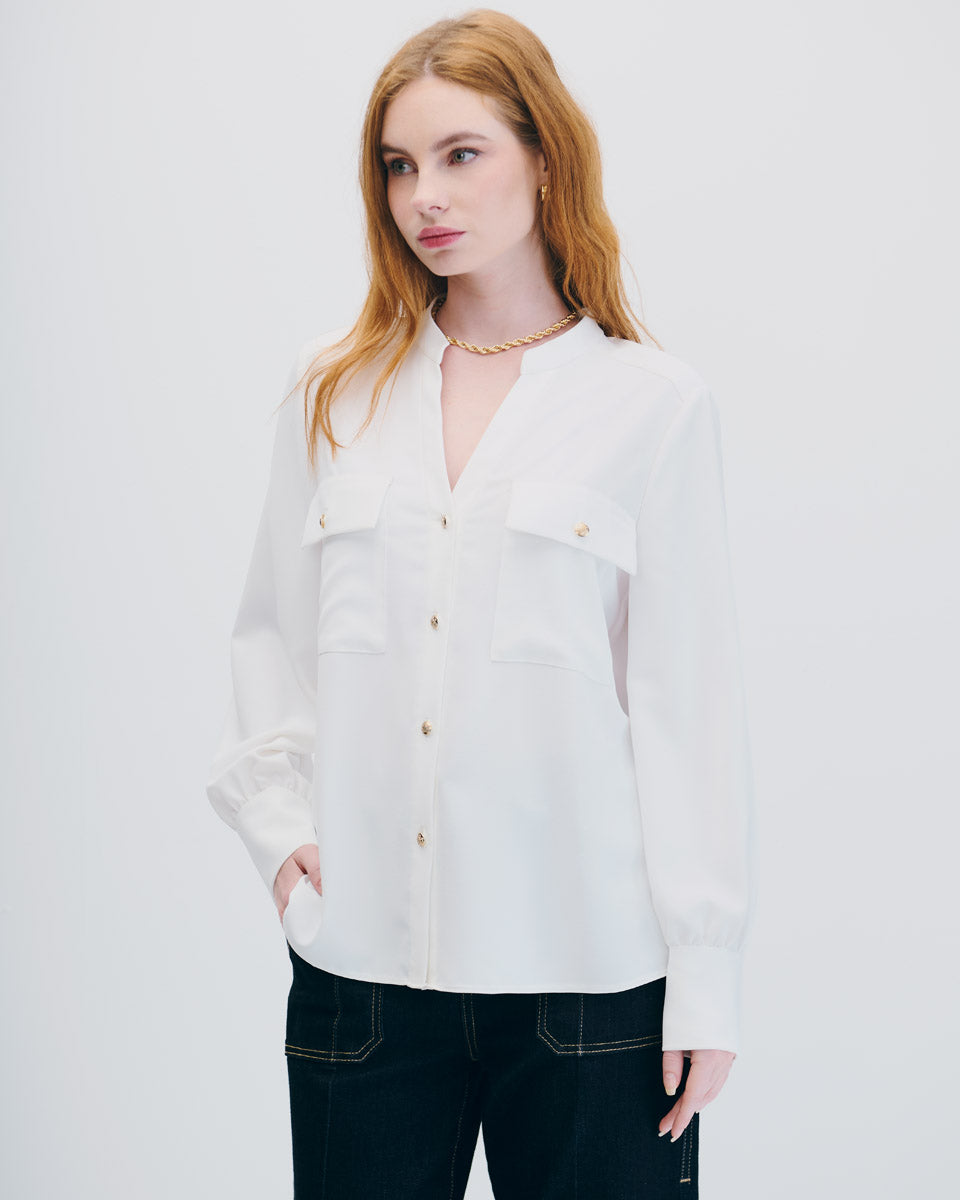 Blusa Blanca Cuello Mao Escote V Con Bolsillos