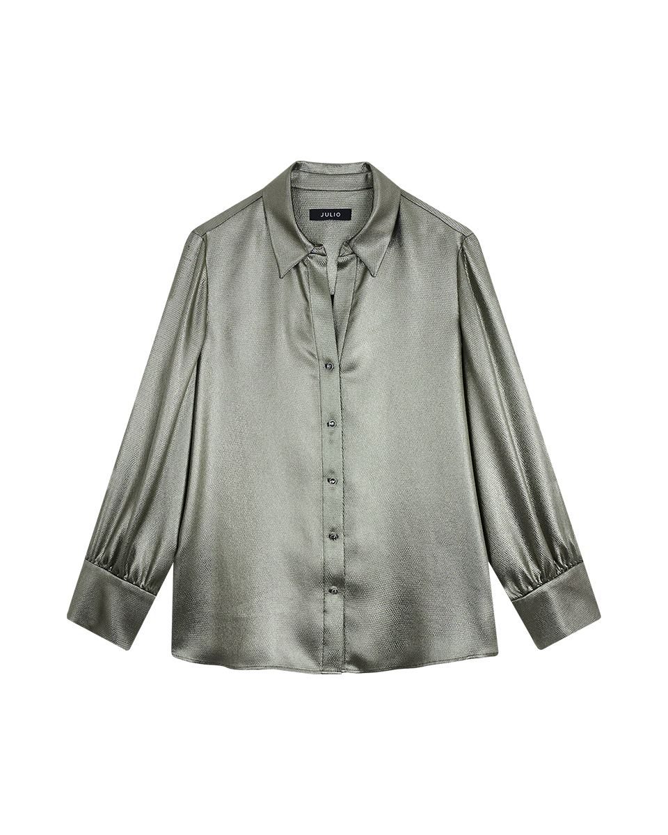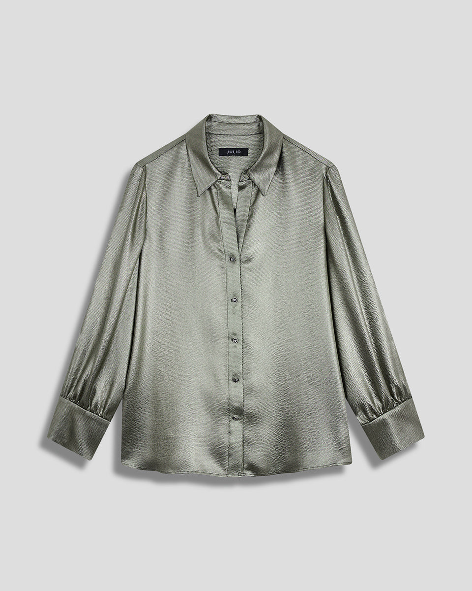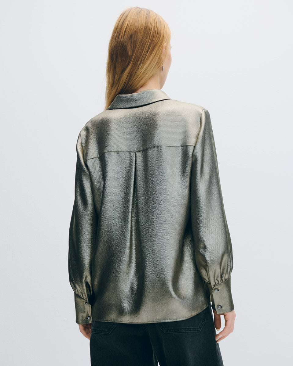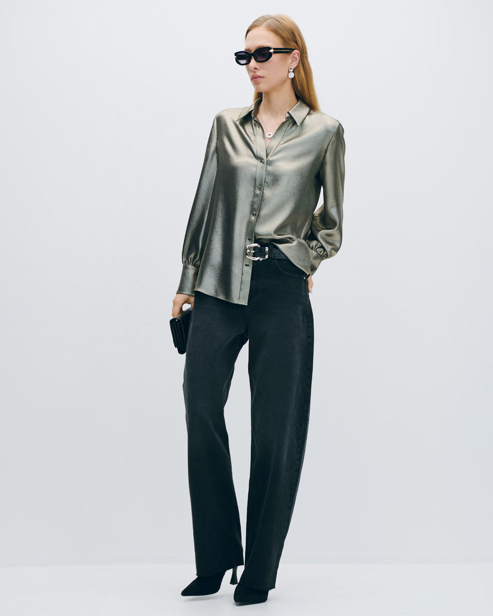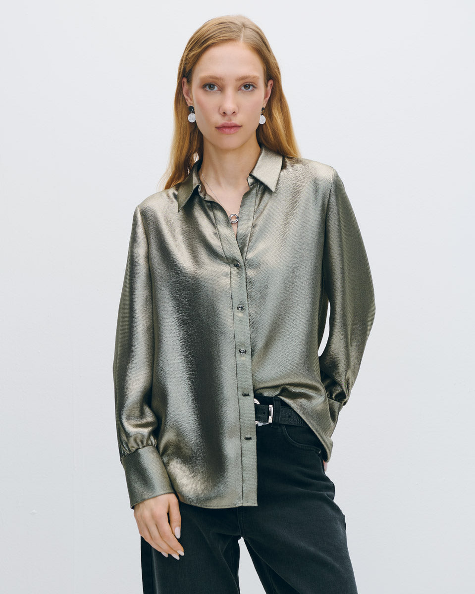 Ligera y luminosa, esta blusa camisera en chifón corrugado dorado es ideal para looks festivos de temporada. Combina con jeans oscuros o pantalones de pinzas.