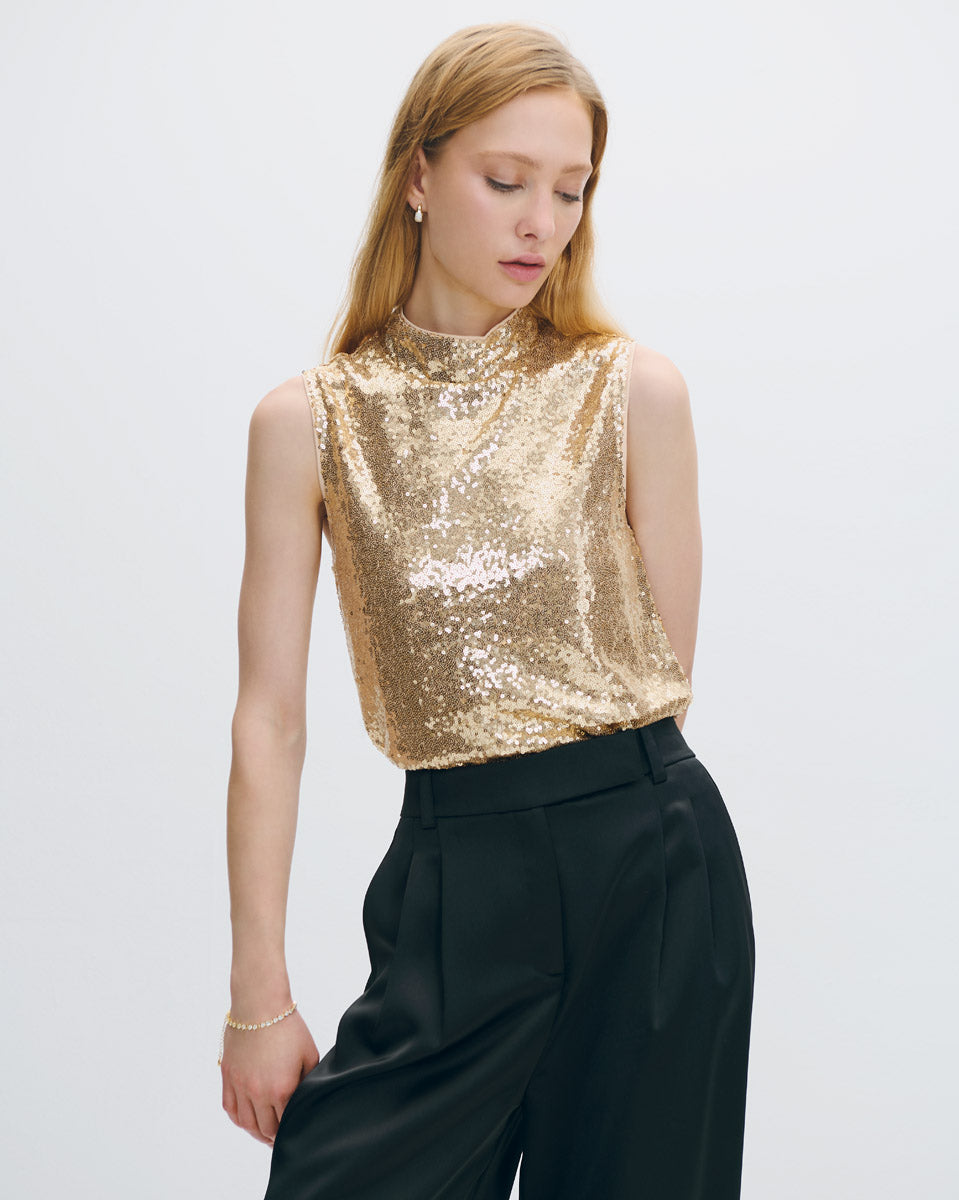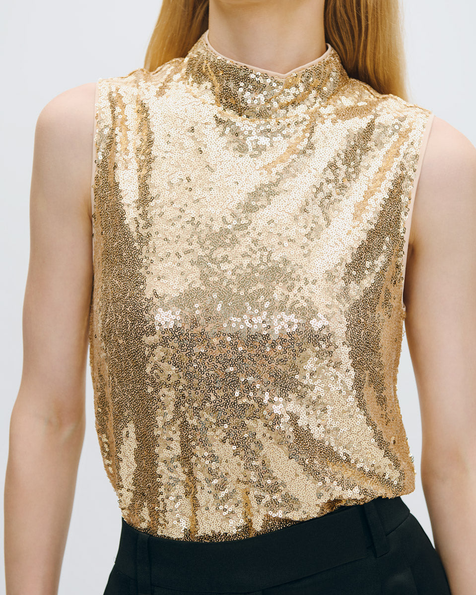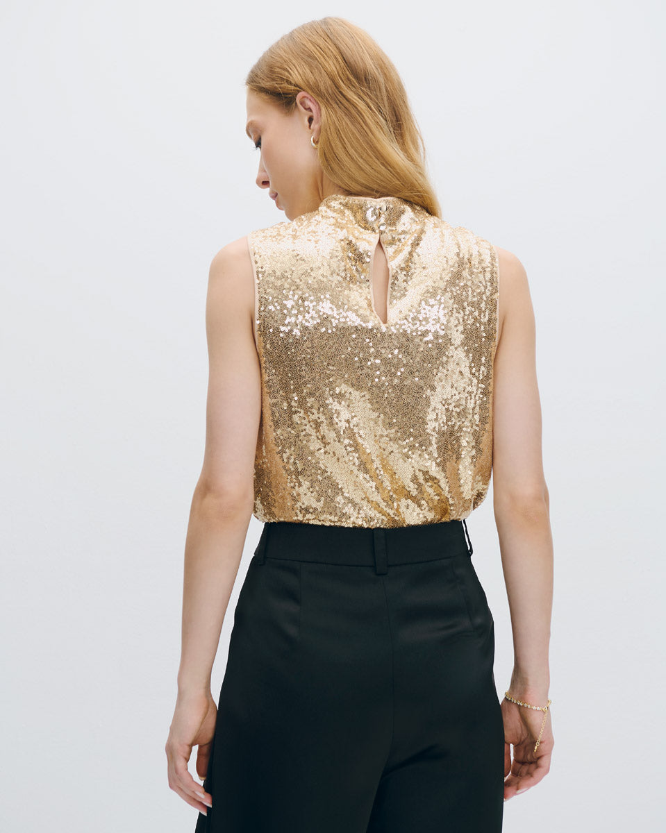 El brillo absoluto llega con esta blusa de punto cubierta de lentejuelas doradas y cuello alto. Una prenda para marcar tendencia en conjuntos con pantalones negros de satín o terciopelo.