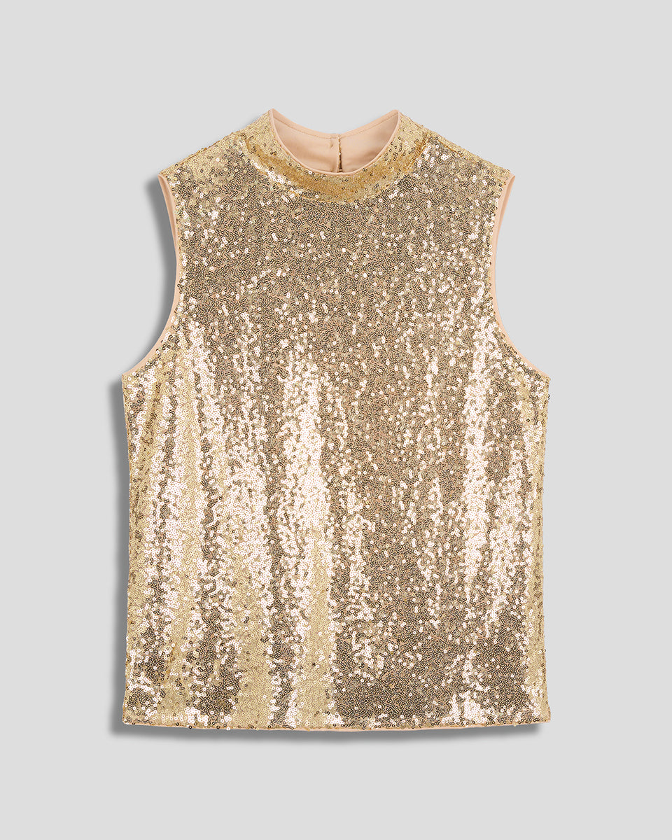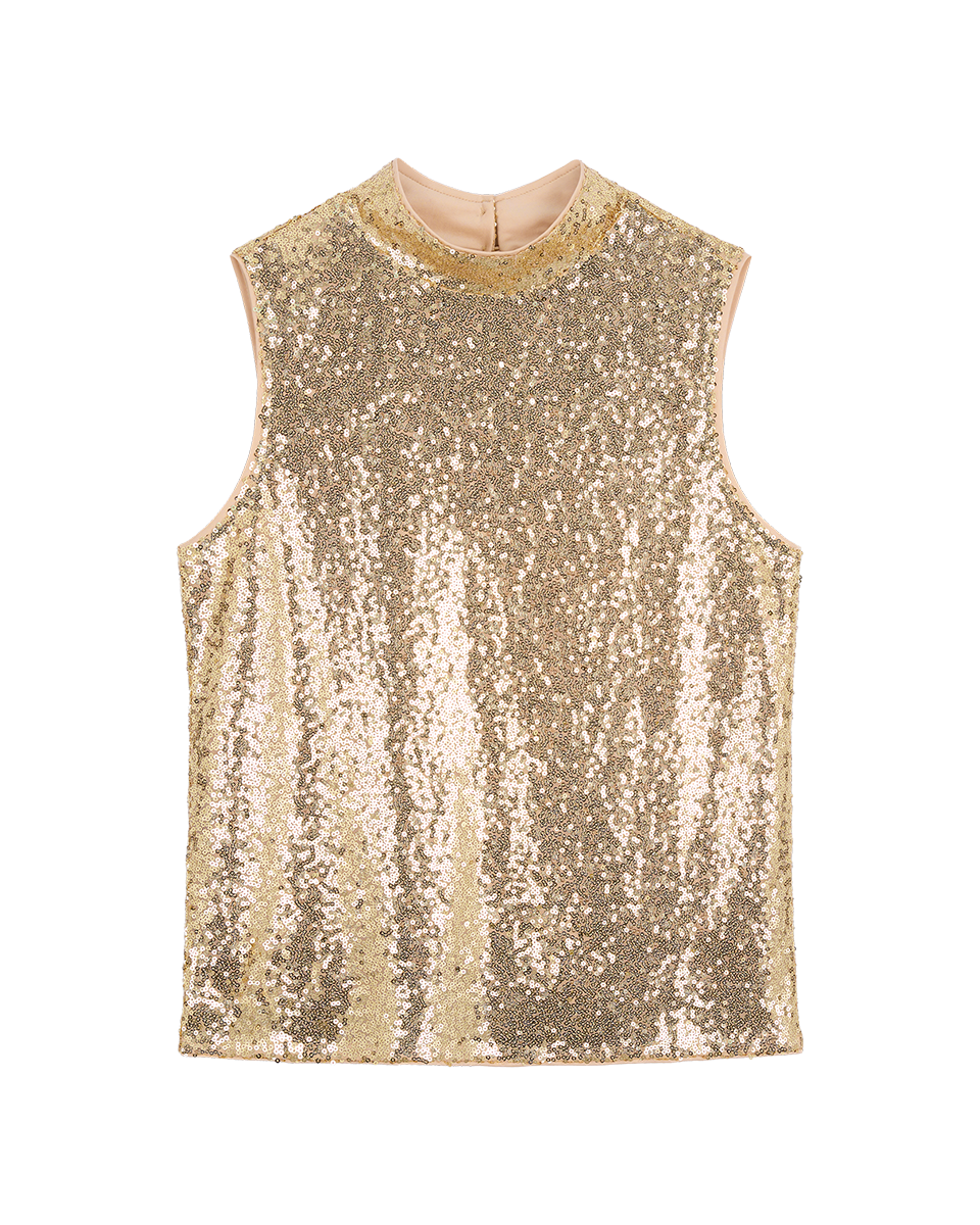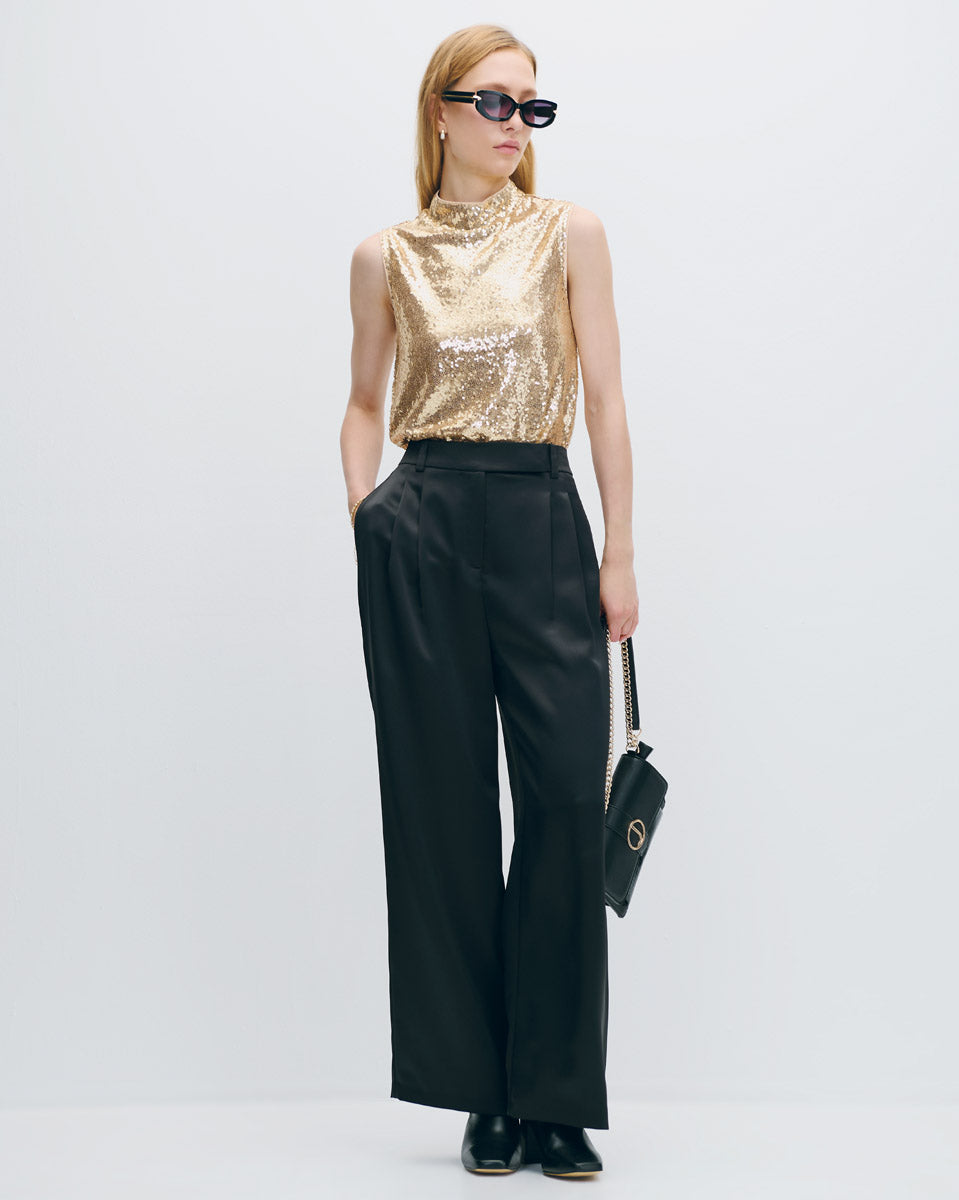 El brillo absoluto llega con esta blusa de punto cubierta de lentejuelas doradas y cuello alto. Una prenda para marcar tendencia en conjuntos con pantalones negros de satín o terciopelo.