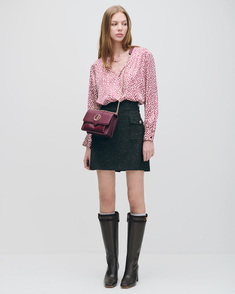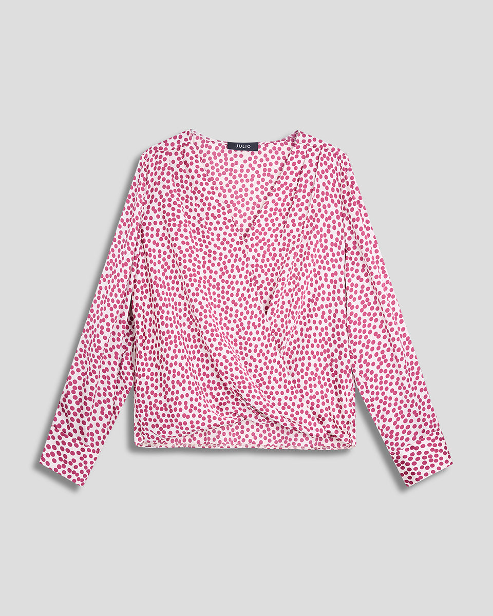 Esta blusa envolvente en satín con lunares y alforzas en el frente aporta volumen sutil y silueta definida. Su textura brillante y diseño cruzado estilizan la figura. Ideal con pantalones rectos o faldas.