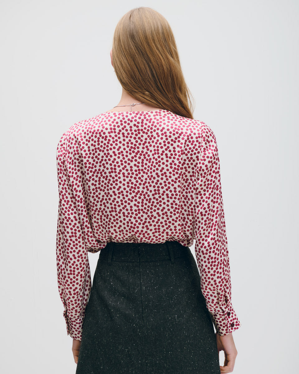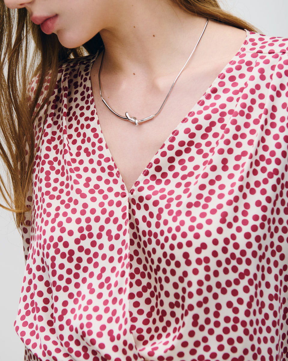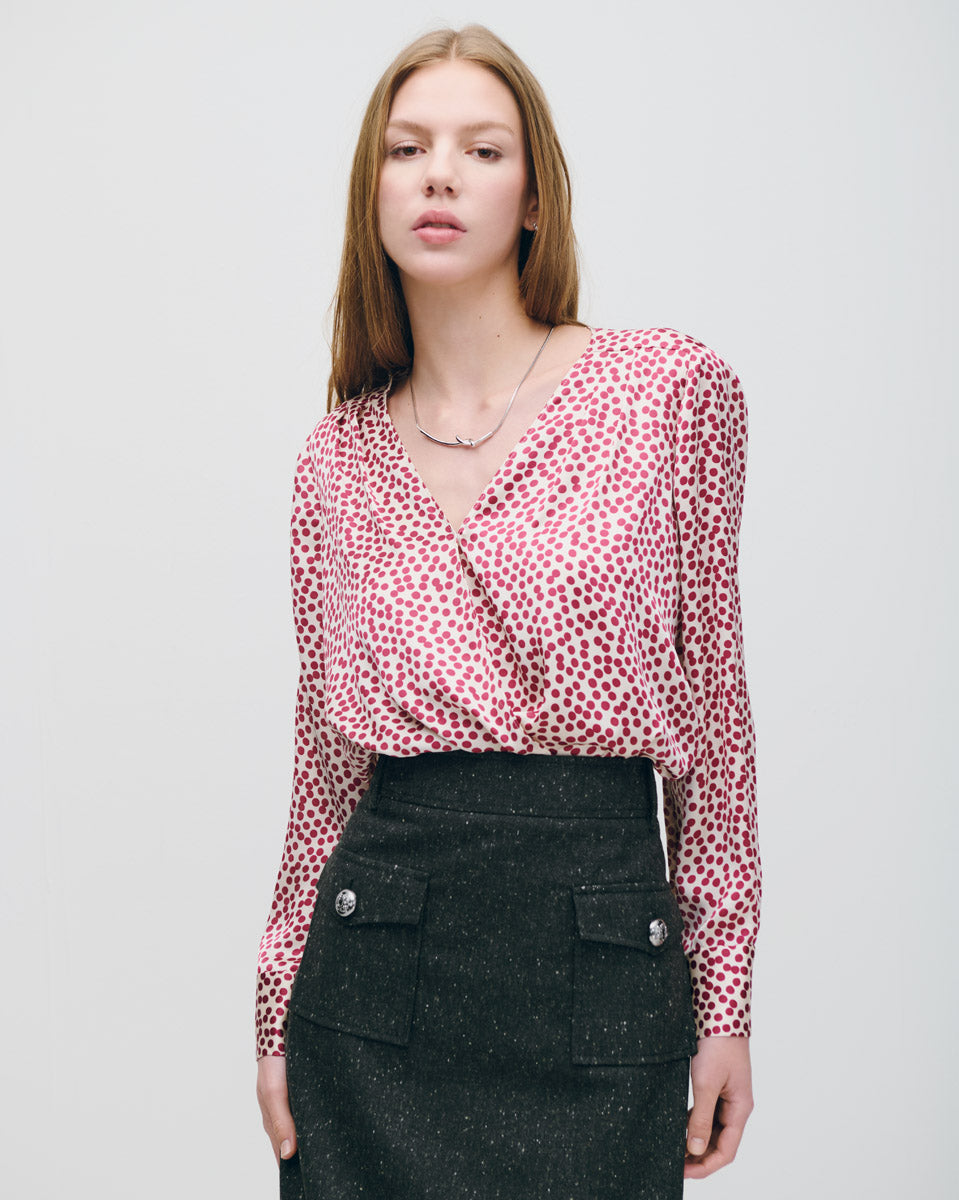 Blusa De Satín Envolvente Lunares Burdeos Con Alforzas
