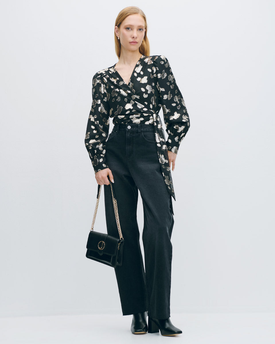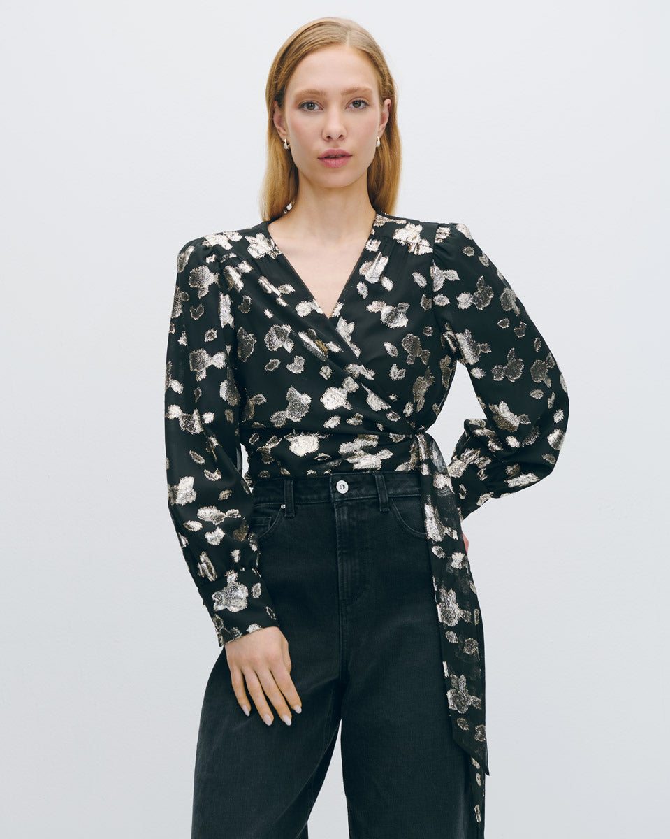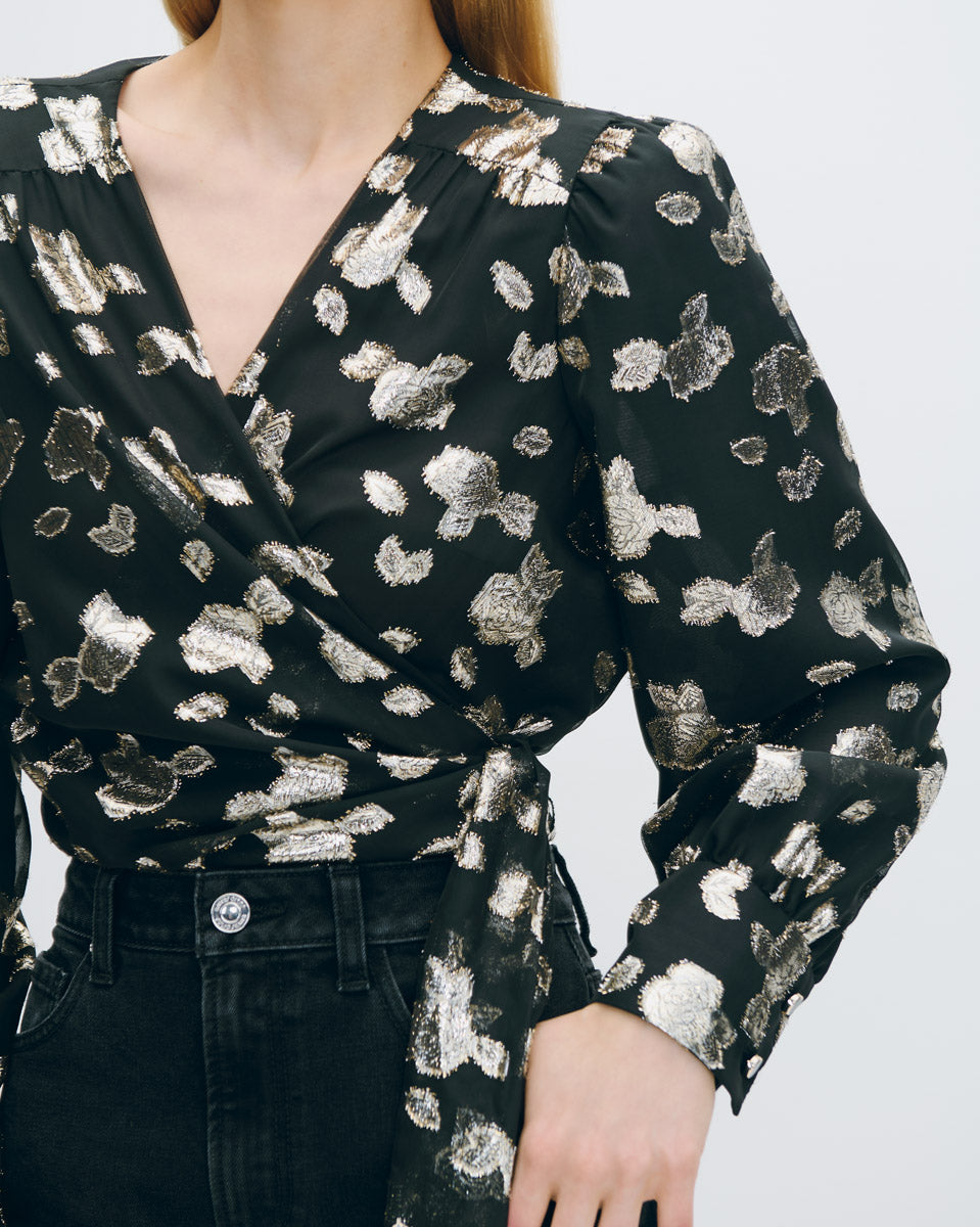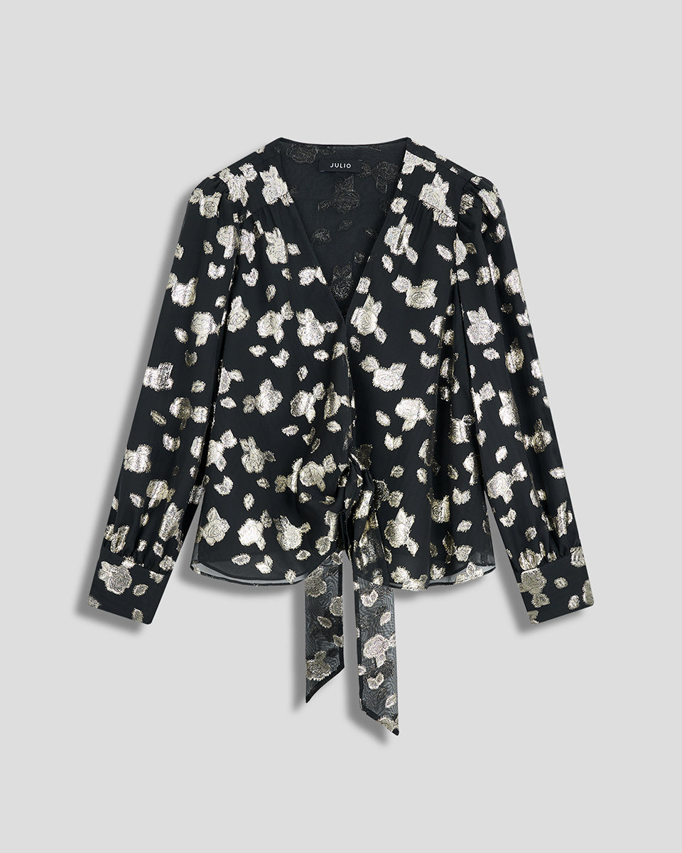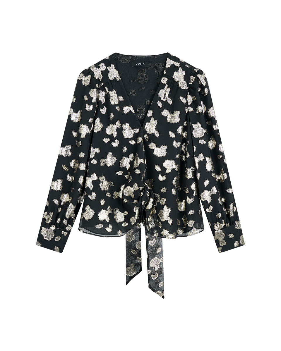 Con silueta envolvente y tejido jacquard floral dorado, esta blusa negra con amarre destaca por su brillo. Perfecta con pantalones de satín o faldas plisadas.