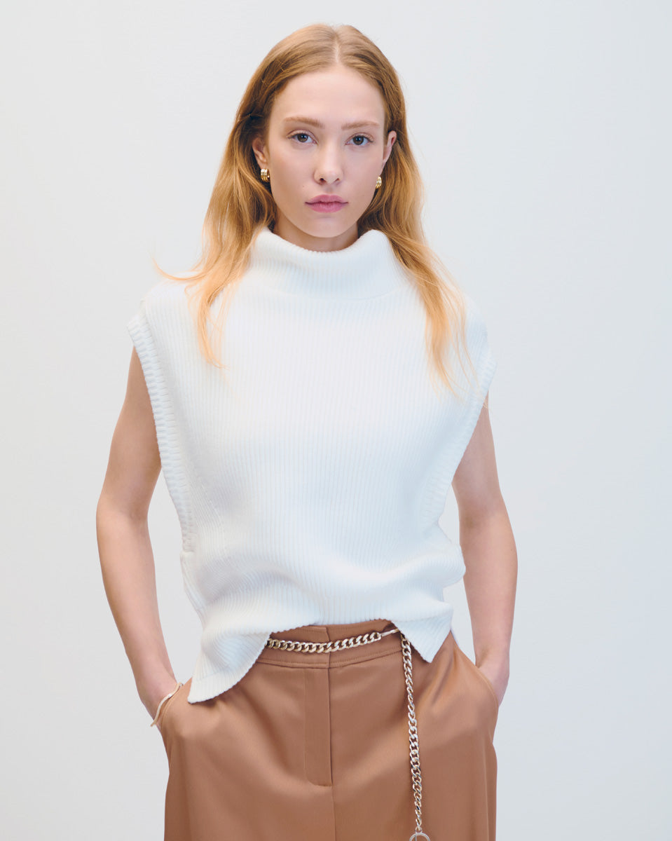 Un diseño versátil y actual: chaleco blanco en tejido canalé con cuello tortuga. Perfecto para layering, combina con camisas estampadas o vestidos ajustados para un look trendy.