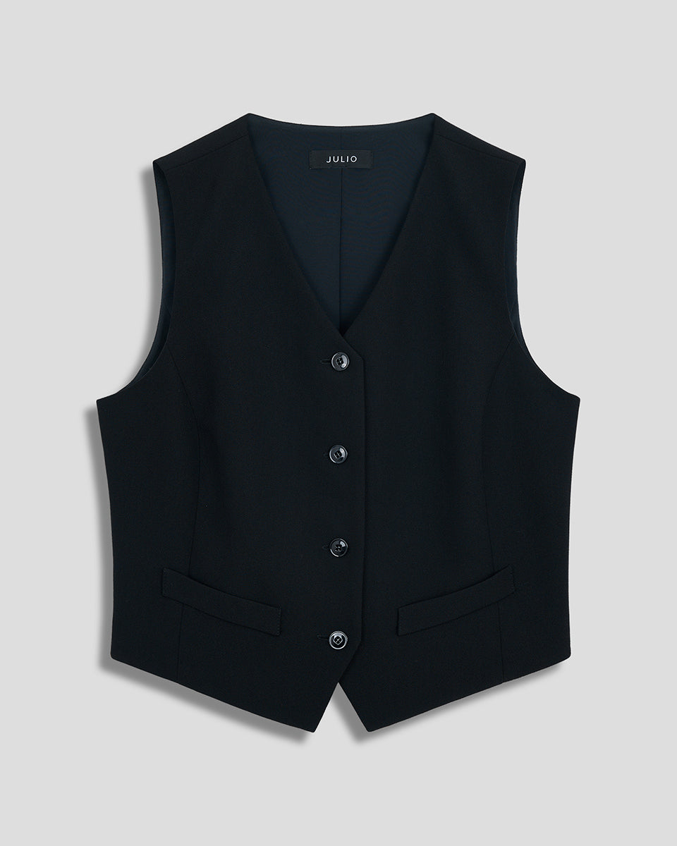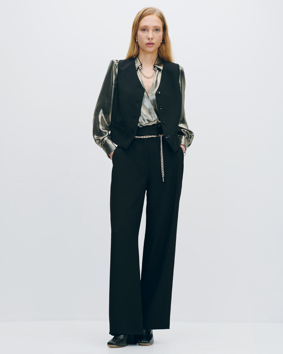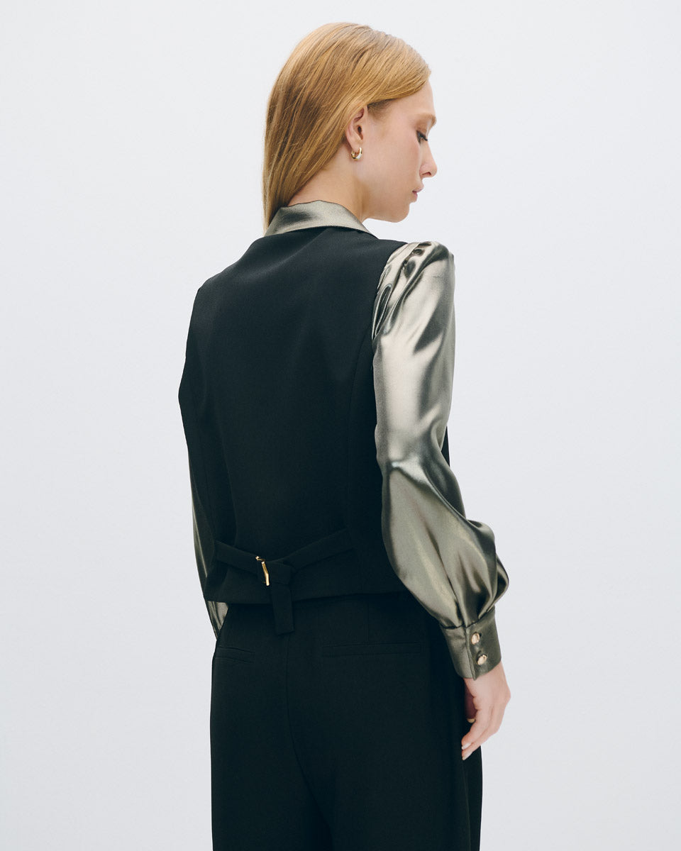 Sofisticación y estructura en una sola prenda. Este chaleco sastre negro destaca por su corte francés, que estiliza la silueta de forma elegante, y una martingala en la parte trasera que aporta ajuste y carácter. Perfecto para looks de oficina, layering con blusas o trajes coordinados.