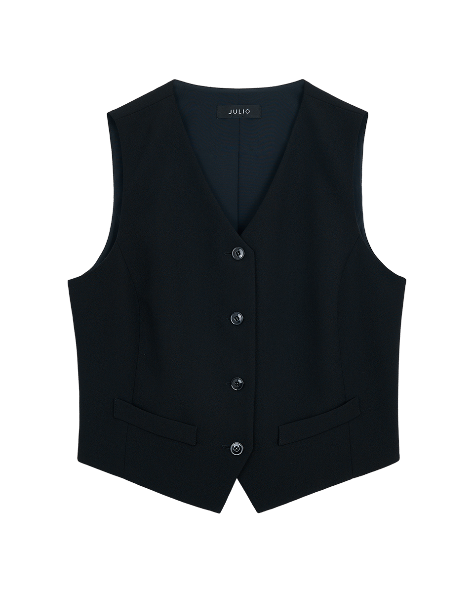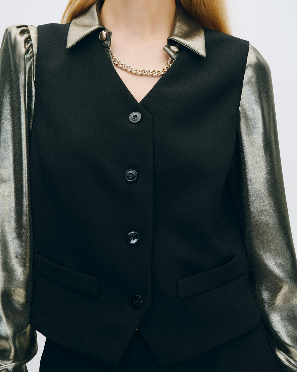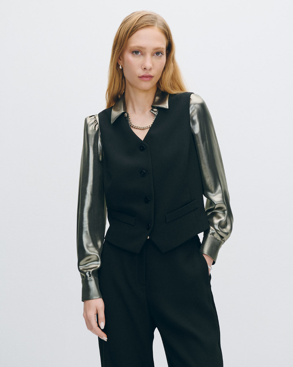 Sofisticación y estructura en una sola prenda. Este chaleco sastre negro destaca por su corte francés, que estiliza la silueta de forma elegante, y una martingala en la parte trasera que aporta ajuste y carácter. Perfecto para looks de oficina, layering con blusas o trajes coordinados.