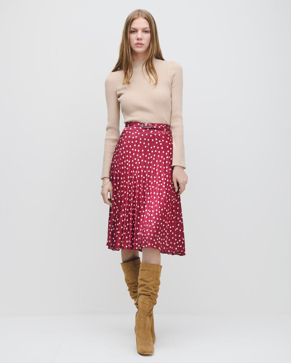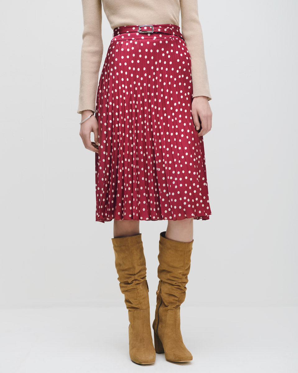 La falda midi satín en burdeos con estampado de lunares plisados ofrece movimiento femenino y sofisticado. Su brillo suave resalta con tops básicos y botas o tenis. Una pieza romántica y versátil que lleva el print clásico hacia un look moderno.