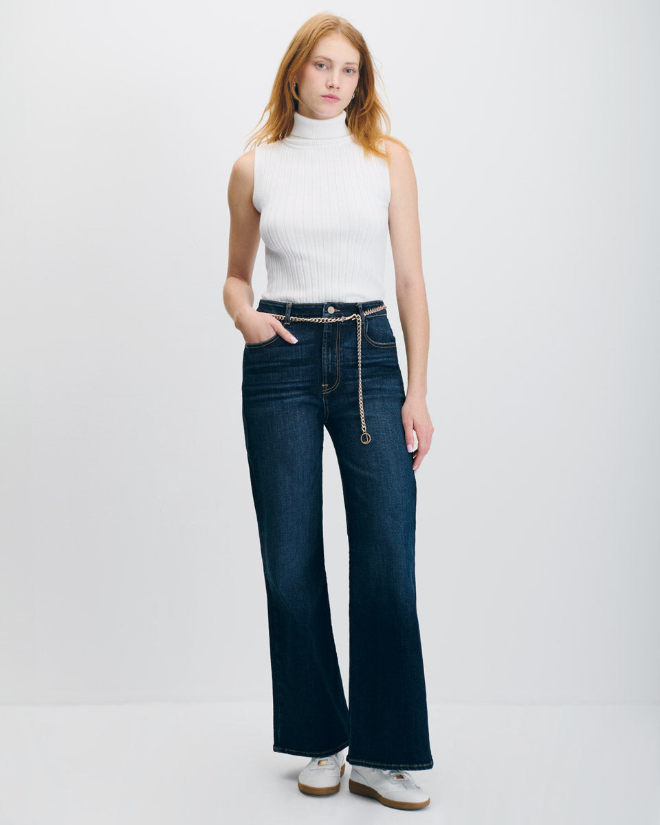 Jeans Flare Tiro Alto Índigo Con Cadena