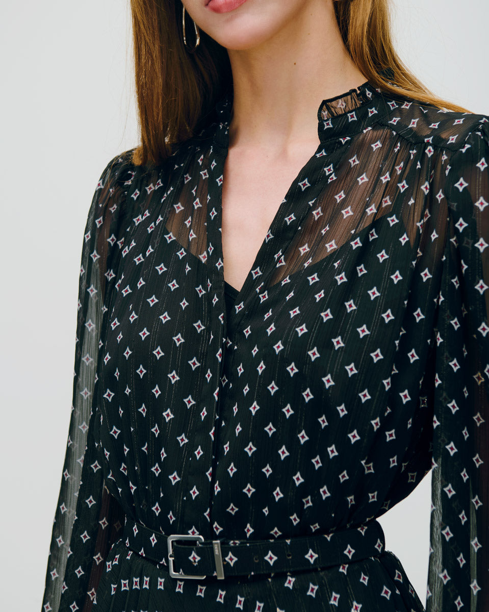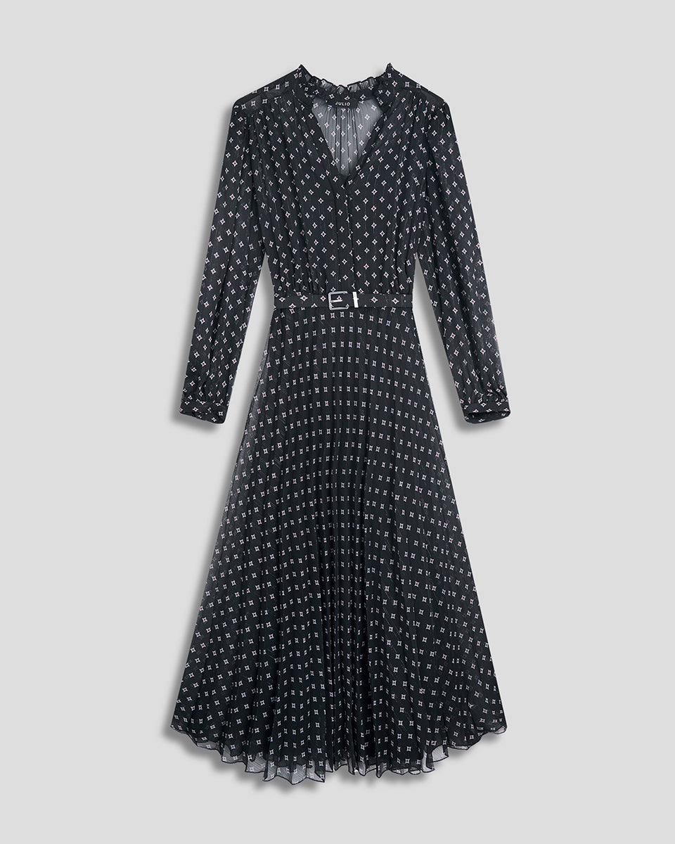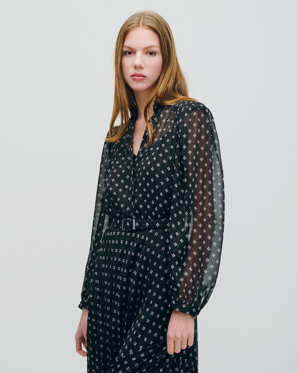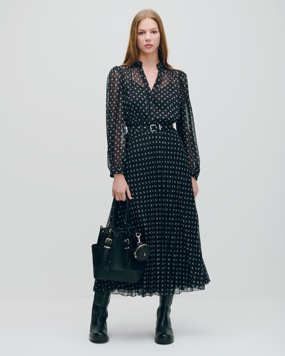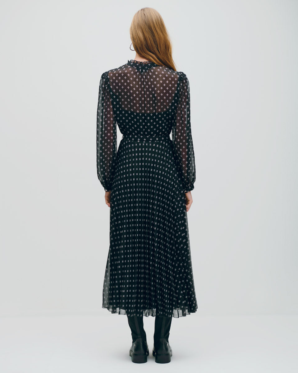 Ligereza y sofisticación se unen en este maxi vestido negro de chifón plisado con mini print. Su silueta fluida cae con elegancia. Perfecto para eventos o salidas nocturnas. Acompáñalo con sandalias de tiras o tacón bajo, y accesorios minimalistas para balancear.