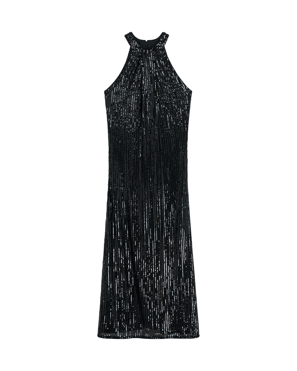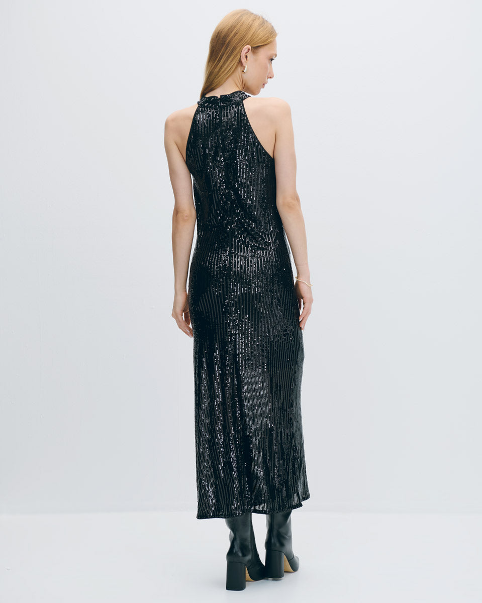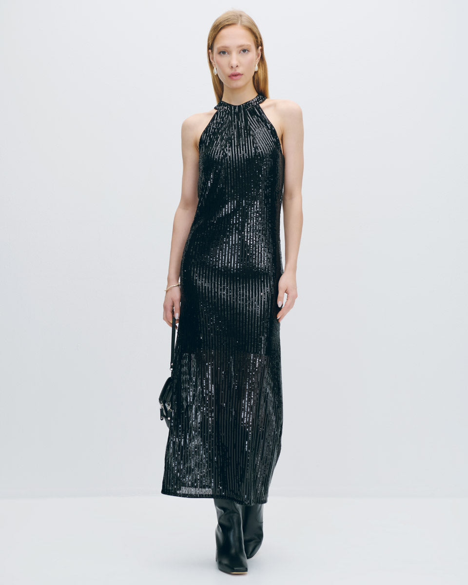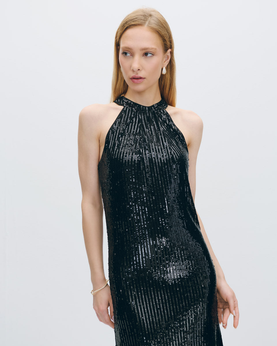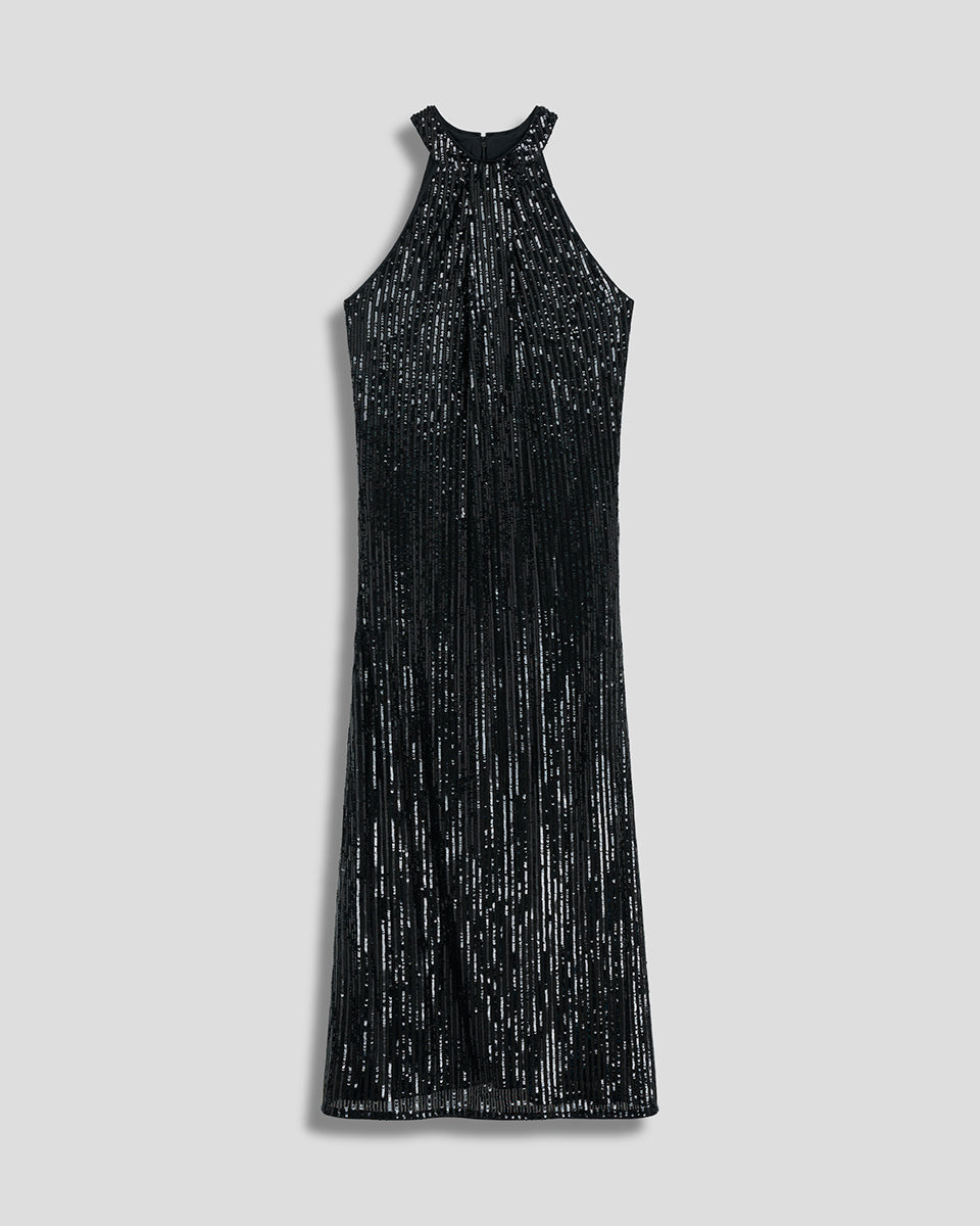Impactante y festivo, este vestido halter maxi en negro con lentejuelas es la pieza estrella de la temporada. Perfecto para celebraciones invernales con tacones finos y accesorios dorados.