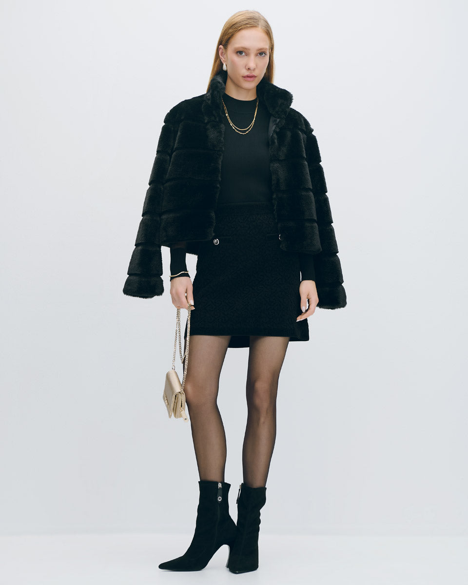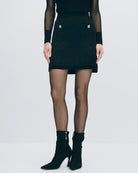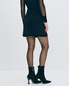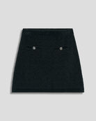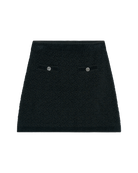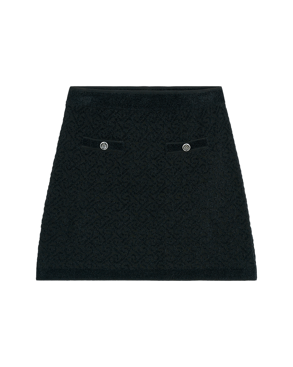Juvenil y chic, esta mini falda en jacquard mosaico negro aporta textura y diseño. Perfecta con medias negras, botas largas y sweaters de punto.