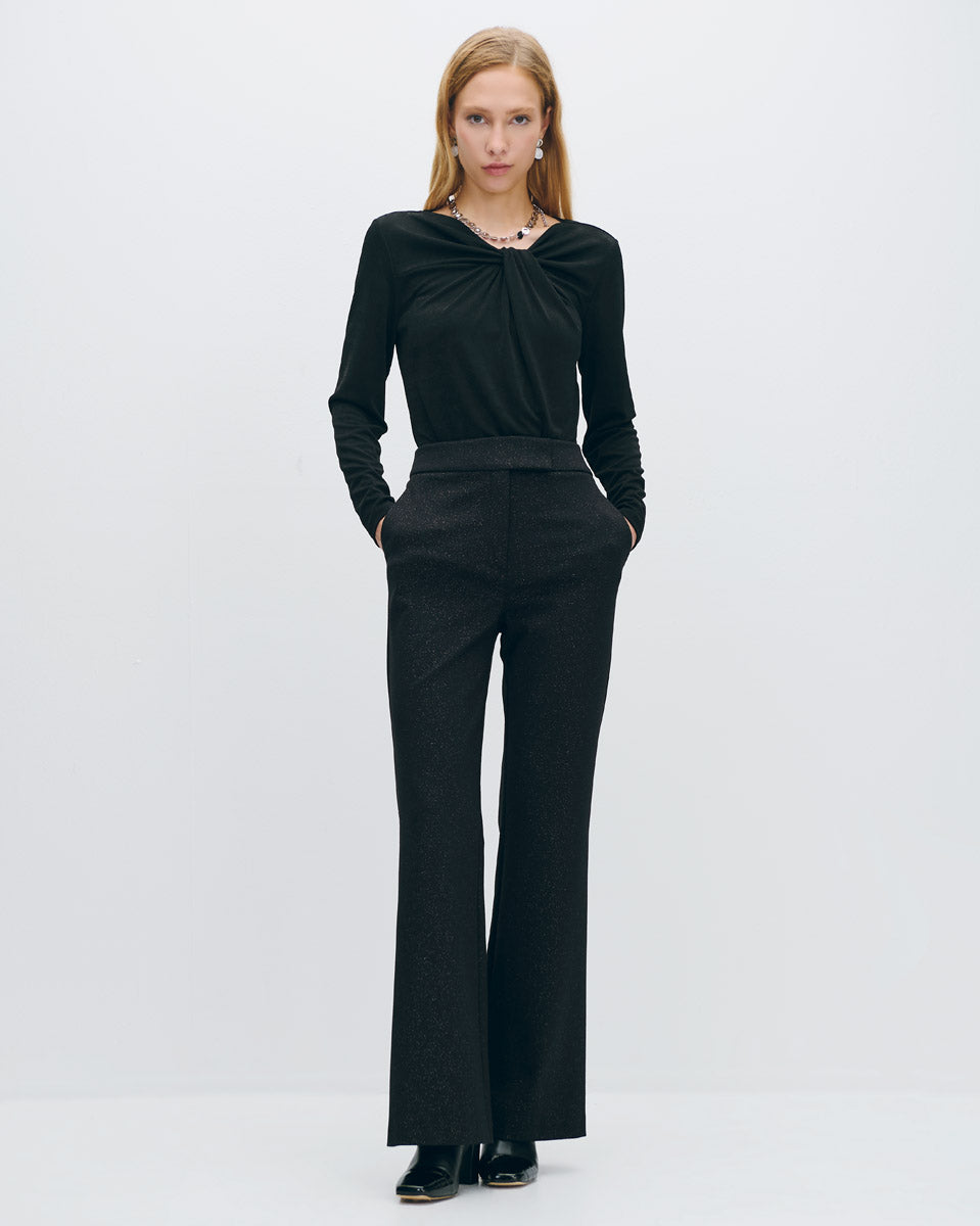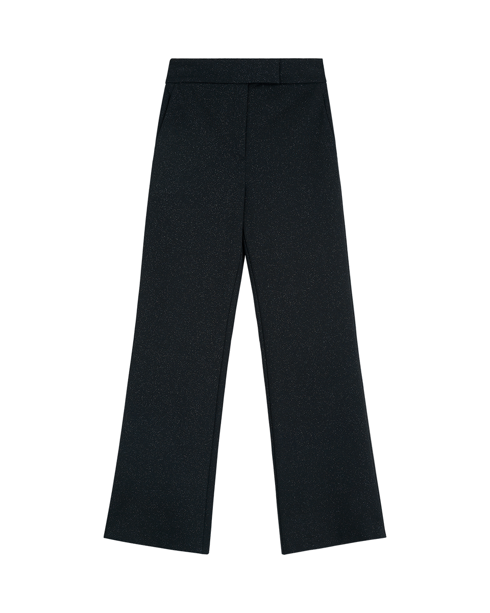 El tejido con destellos sutiles transforma este pantalón acampanado en una prenda ideal para la noche. Combina glamour y confort, perfecto para destacar en cenas invernales.