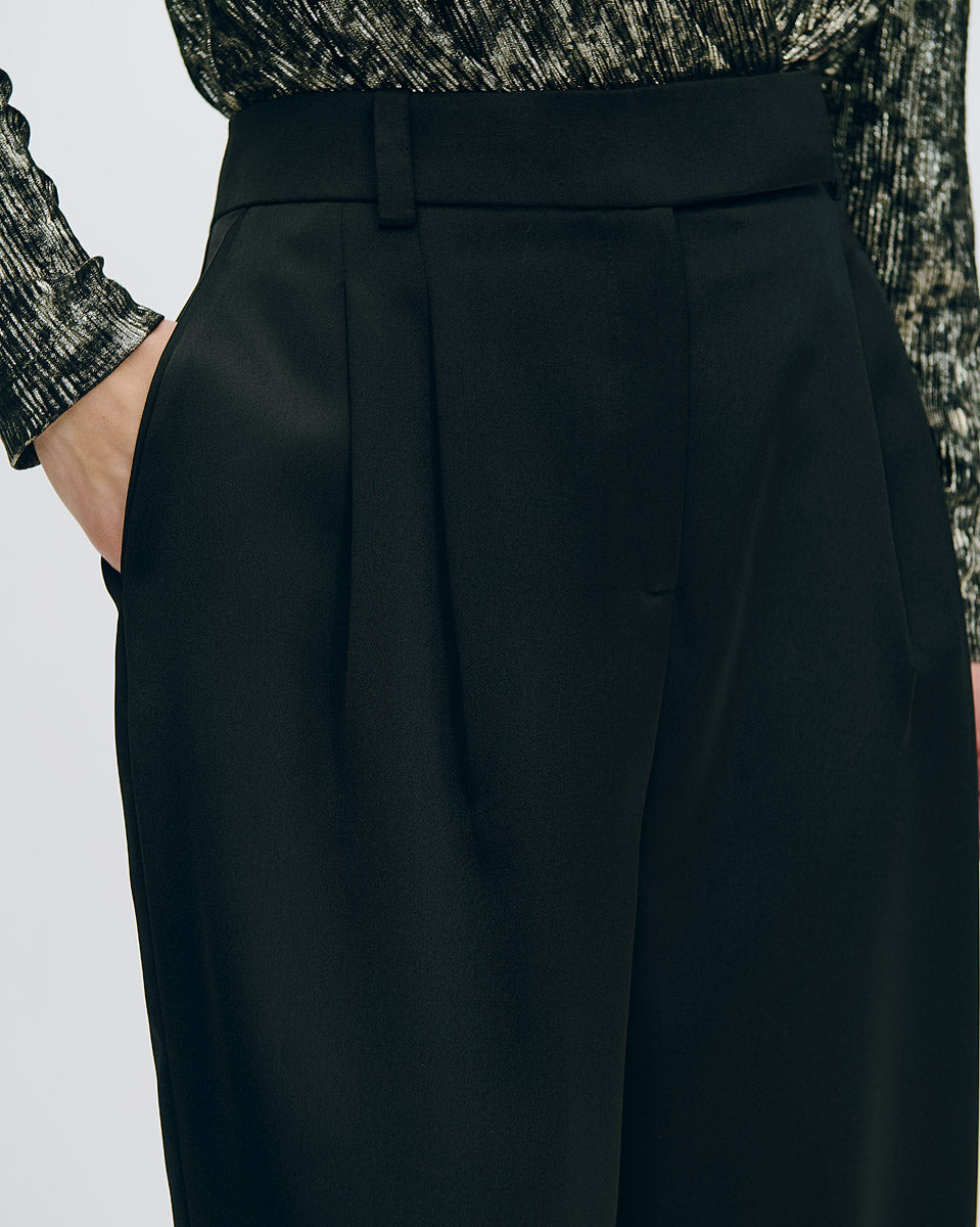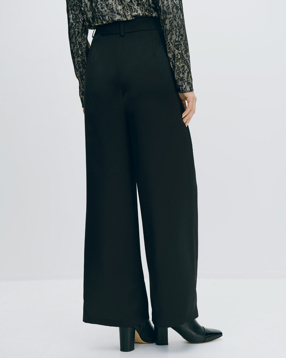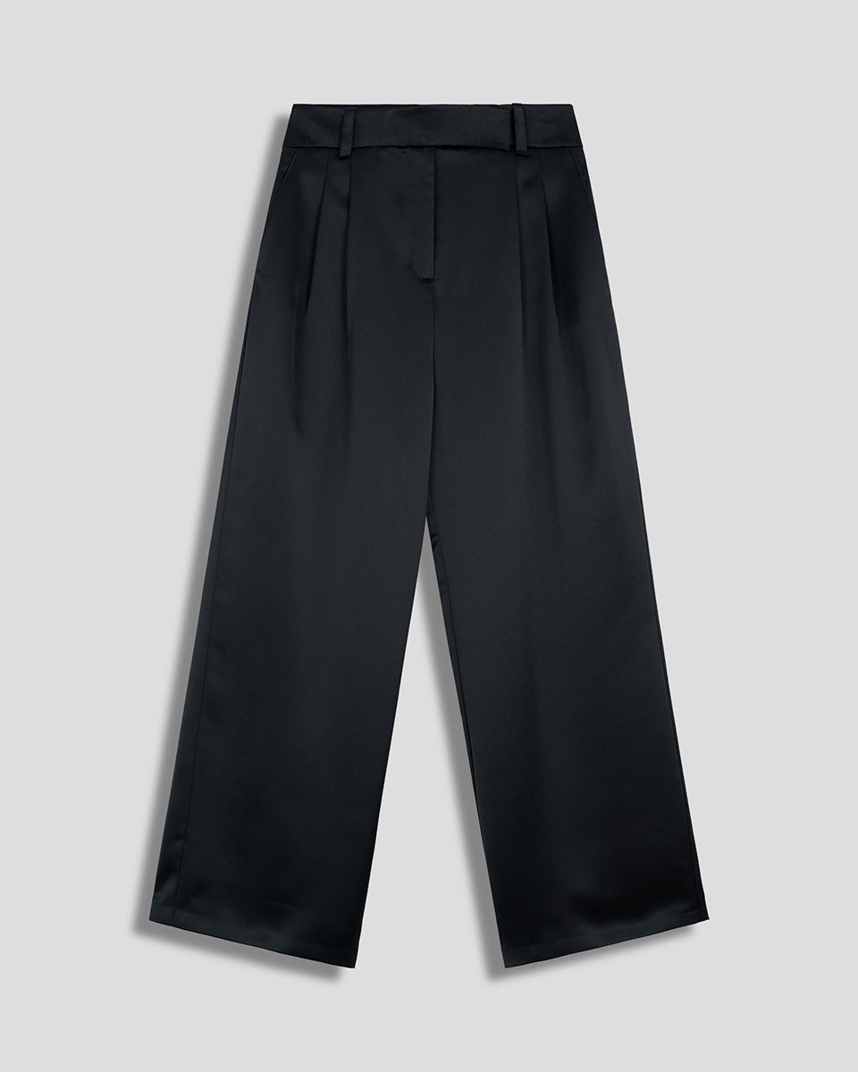 Fluido y sofisticado, este pantalón wide leg negro en satín con pinzas estiliza la silueta. Ideal para combinar con blusas metalizadas o tops de fiesta en invierno.