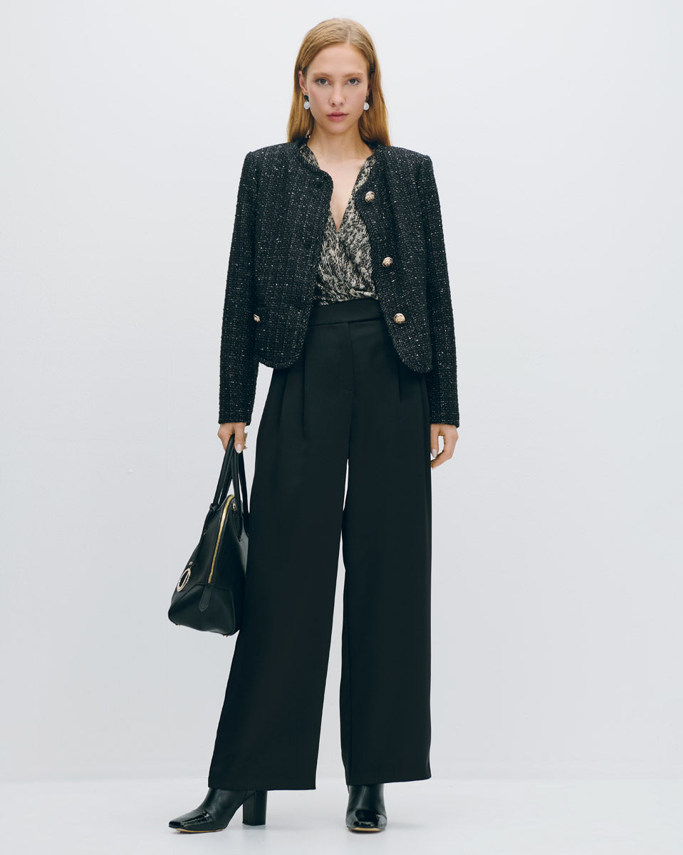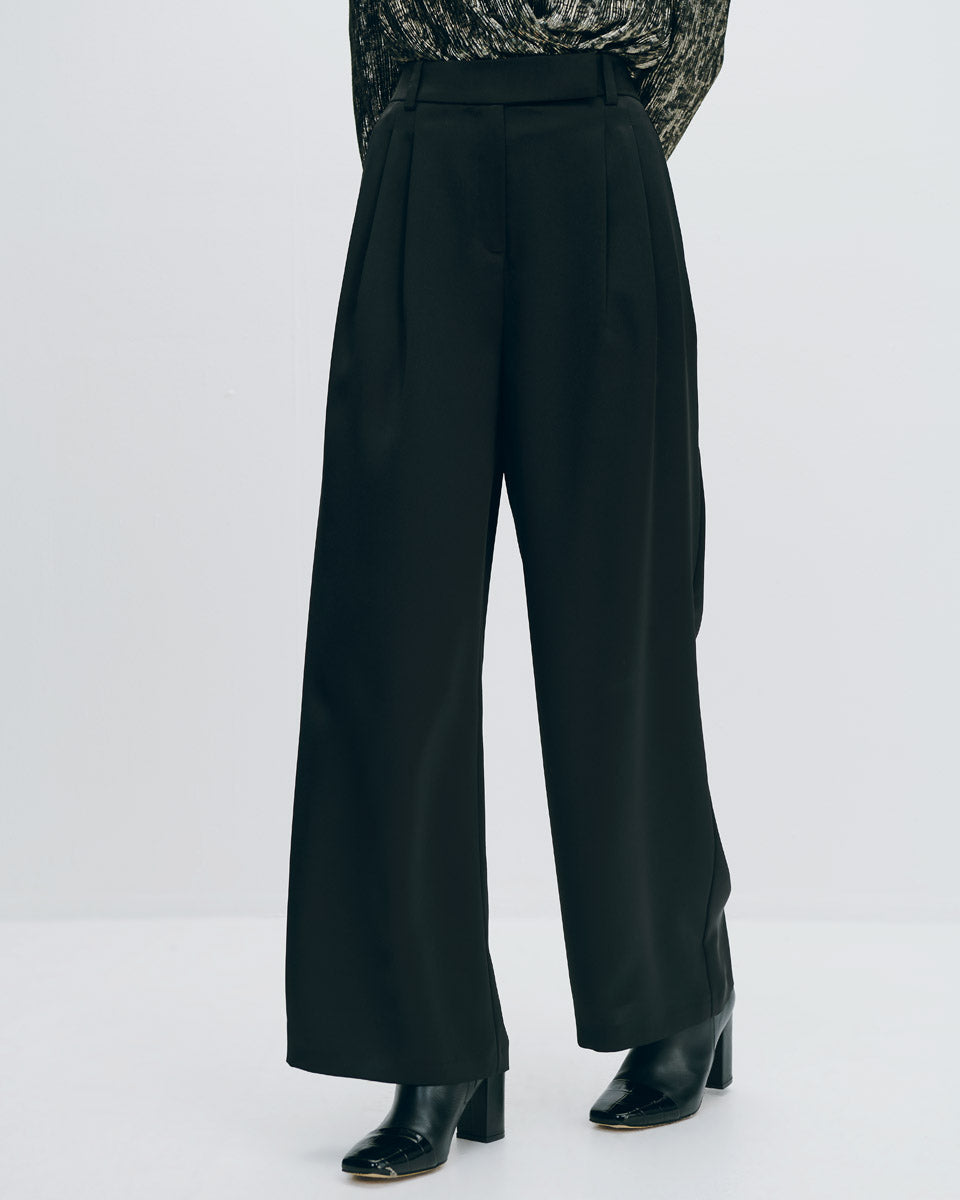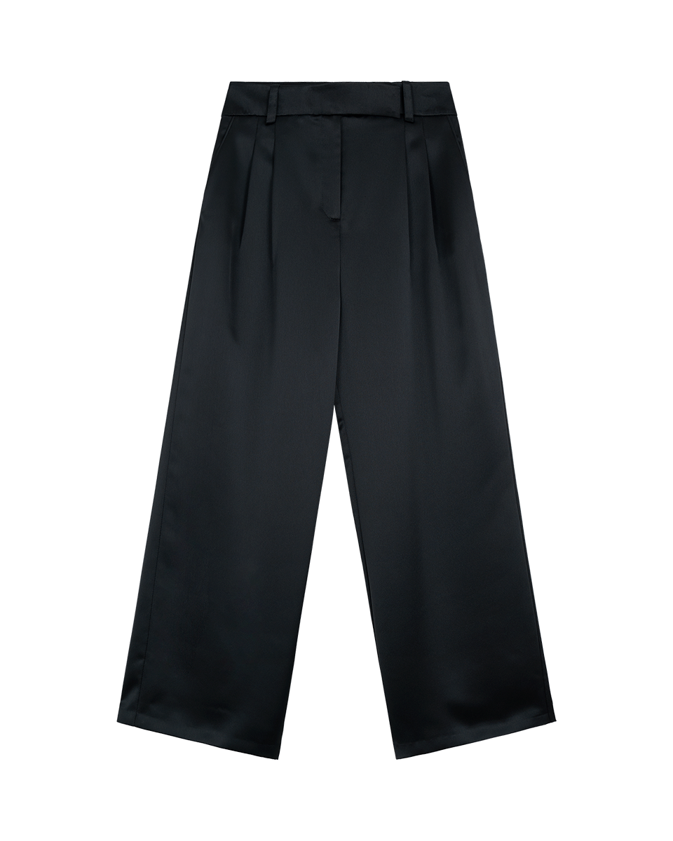 Fluido y sofisticado, este pantalón wide leg negro en satín con pinzas estiliza la silueta. Ideal para combinar con blusas metalizadas o tops de fiesta en invierno.