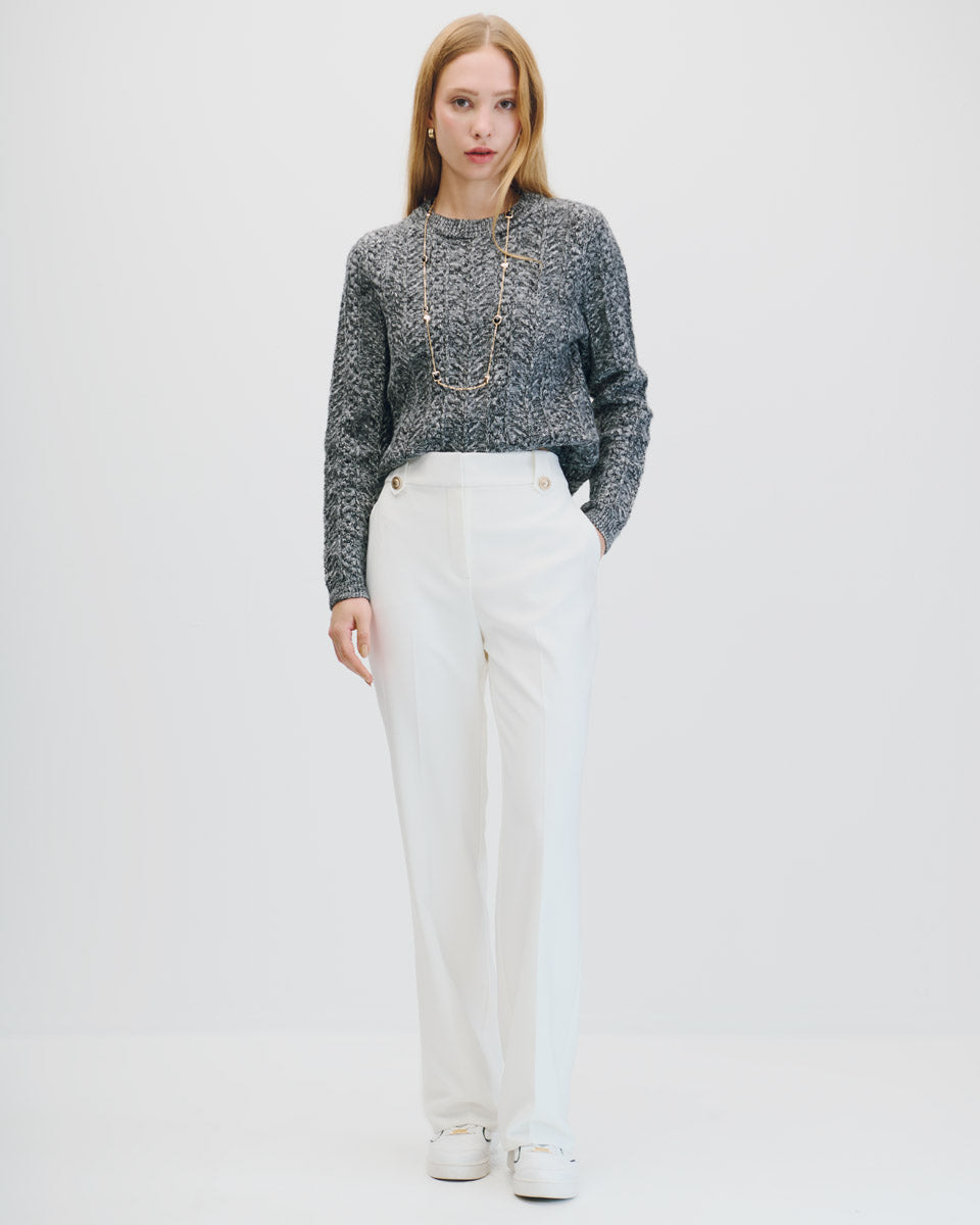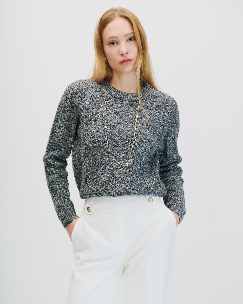 Este suéter corto gris jaspeado con tejido trenzado es cómodo, combinable y moderno. Su cuello redondo lo hace ideal para estilismos relajados pero cuidados.