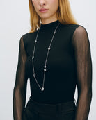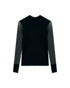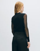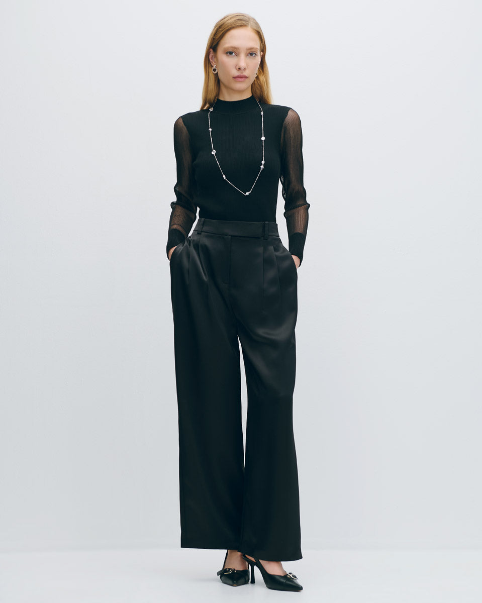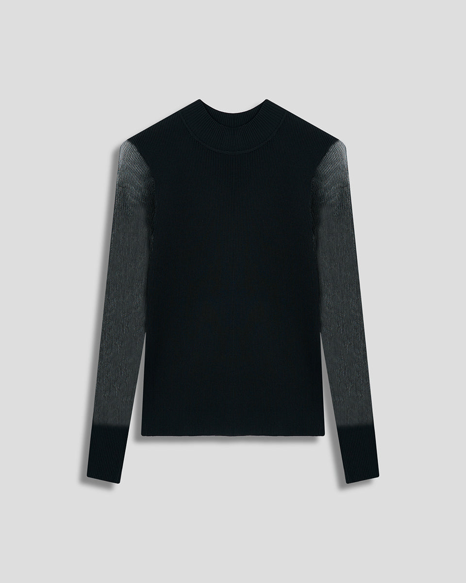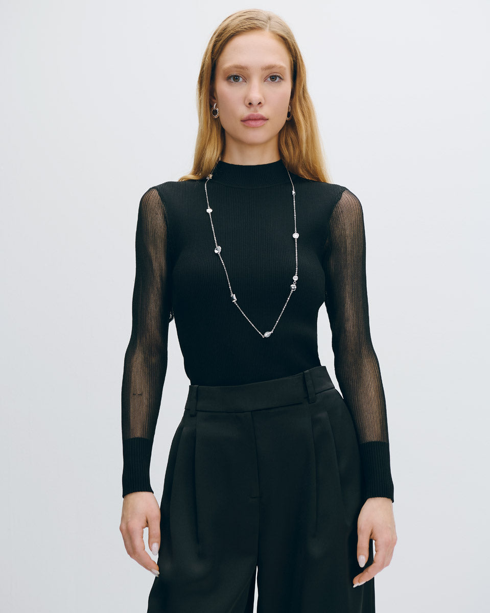 Un detalle inesperado: este suéter negro canalé incorpora mangas con transparencias que aportan sensualidad. Ideal para ocasiones nocturnas, combínalo con pantalones entallados y tacones.