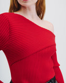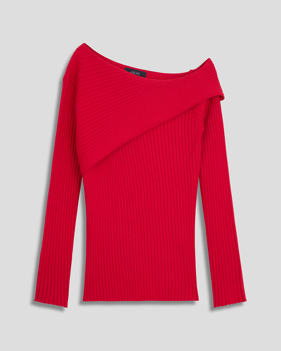 Suéter Tejido Canalé Rojo Escote Asimétrico Con Solapa