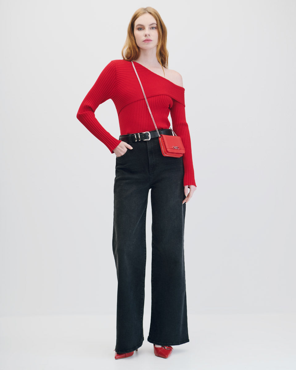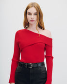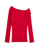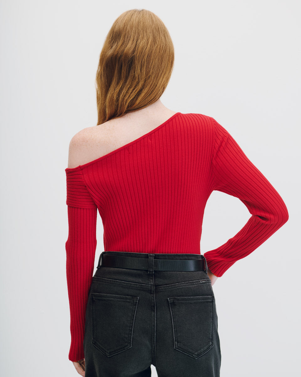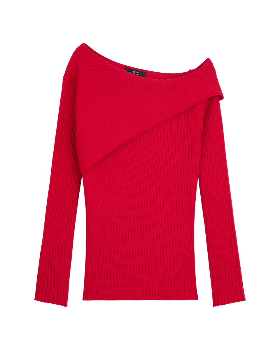 Este suéter rojo canalé con escote asimétrico y solapa incorpora un diseño único que estiliza la parte superior y añade un toque fashion a tu look.