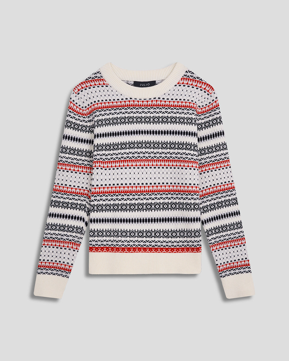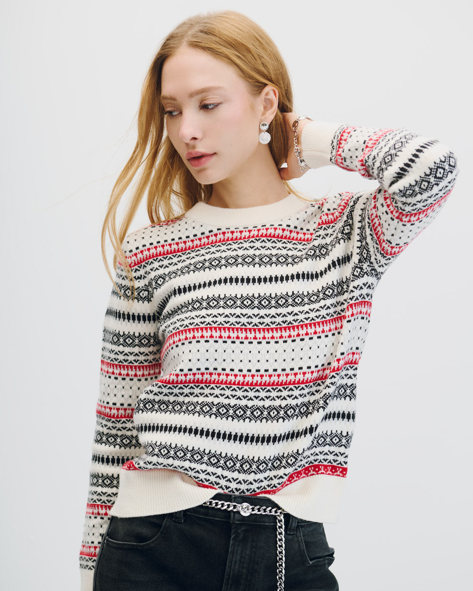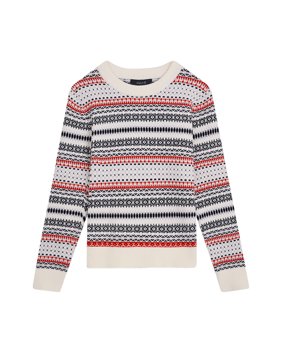Inspirado en el tradicional tejido nórdico, este suéter rojo con motivos Fair Isle es ideal para la temporada invernal. Su diseño clásico con acentos contemporáneos lo hace perfecto para días festivos o looks acogedores con personalidad.