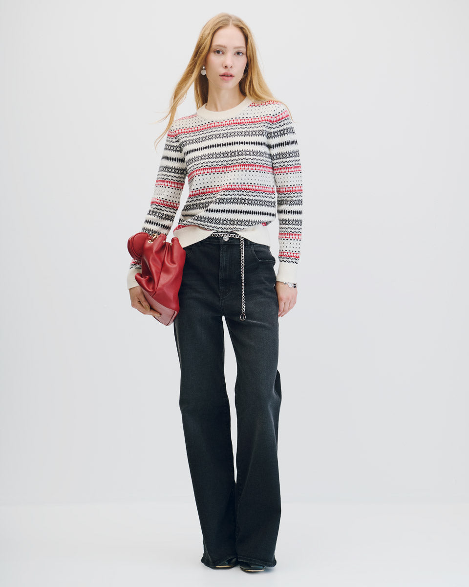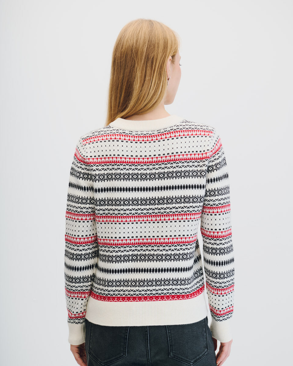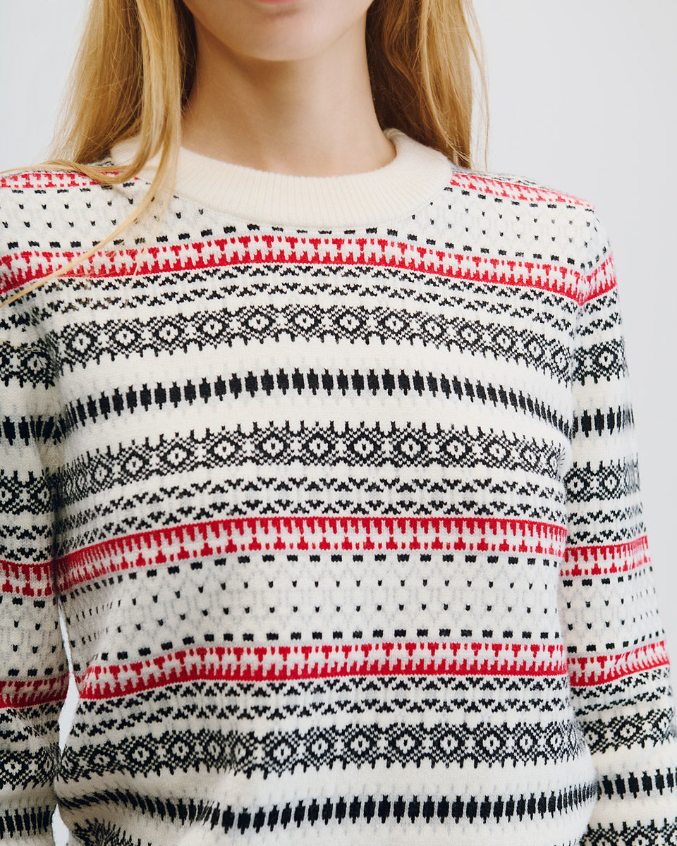 Inspirado en el tradicional tejido nórdico, este suéter rojo con motivos Fair Isle es ideal para la temporada invernal. Su diseño clásico con acentos contemporáneos lo hace perfecto para días festivos o looks acogedores con personalidad.