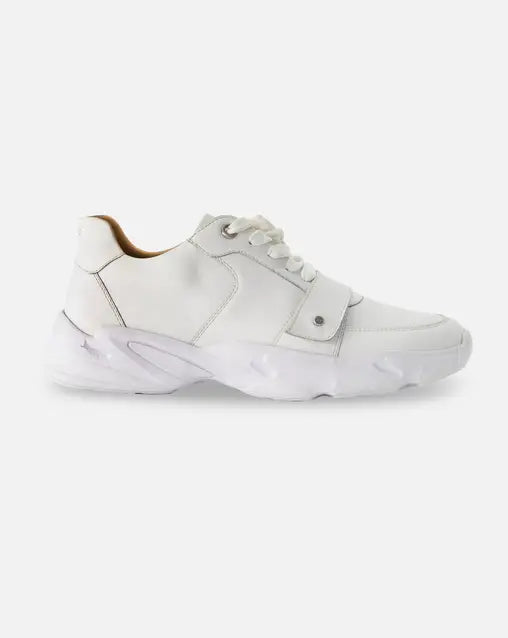 Tenis blancos con suela estilo running. Agujetas y detalle ajustable de velcro.