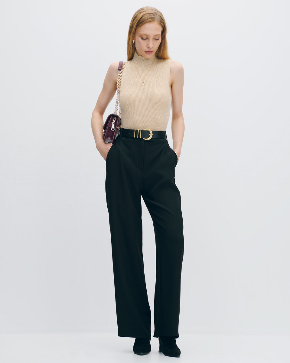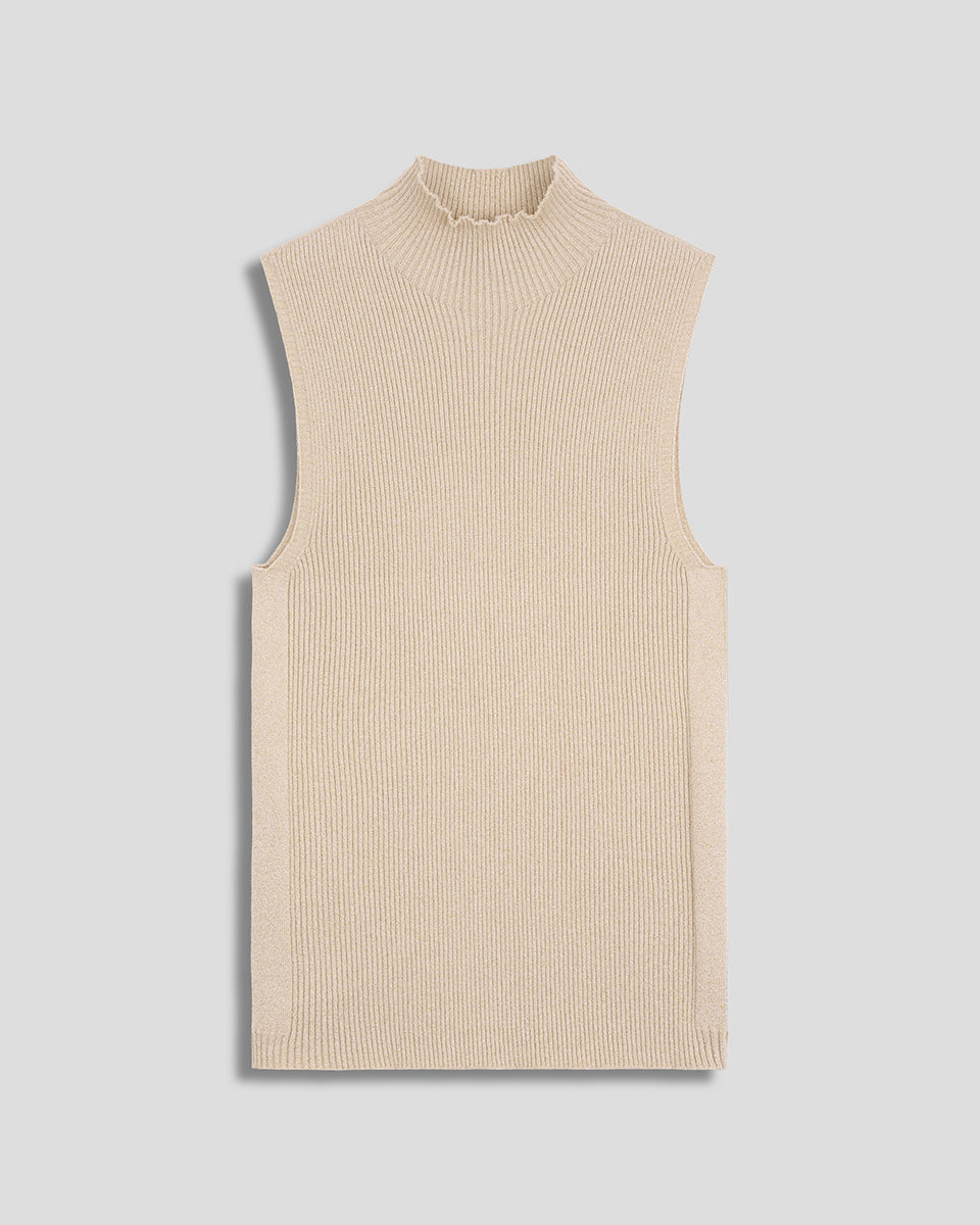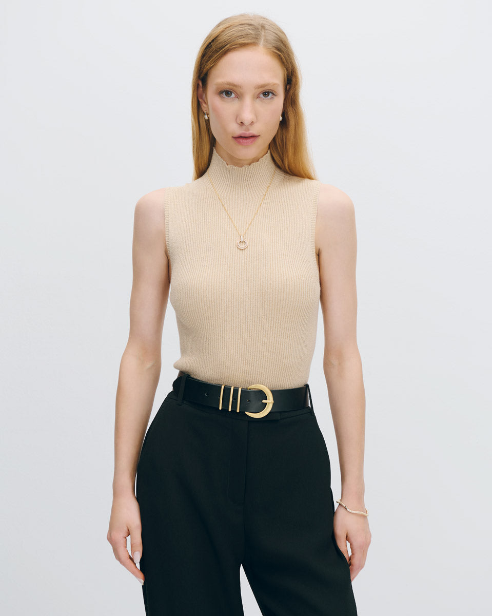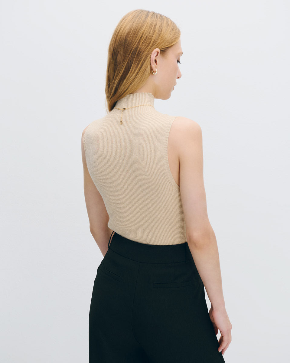 Este top canalé beige con hilos de lúrex dorado brilla con discreción. El cuello Perkins aporta elegancia, ideal para usar bajo blazers o cardigans largos en invierno.