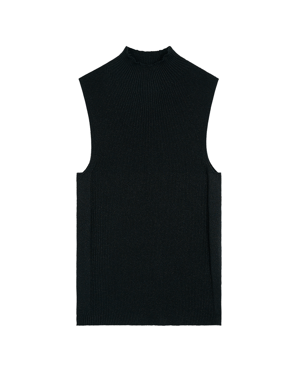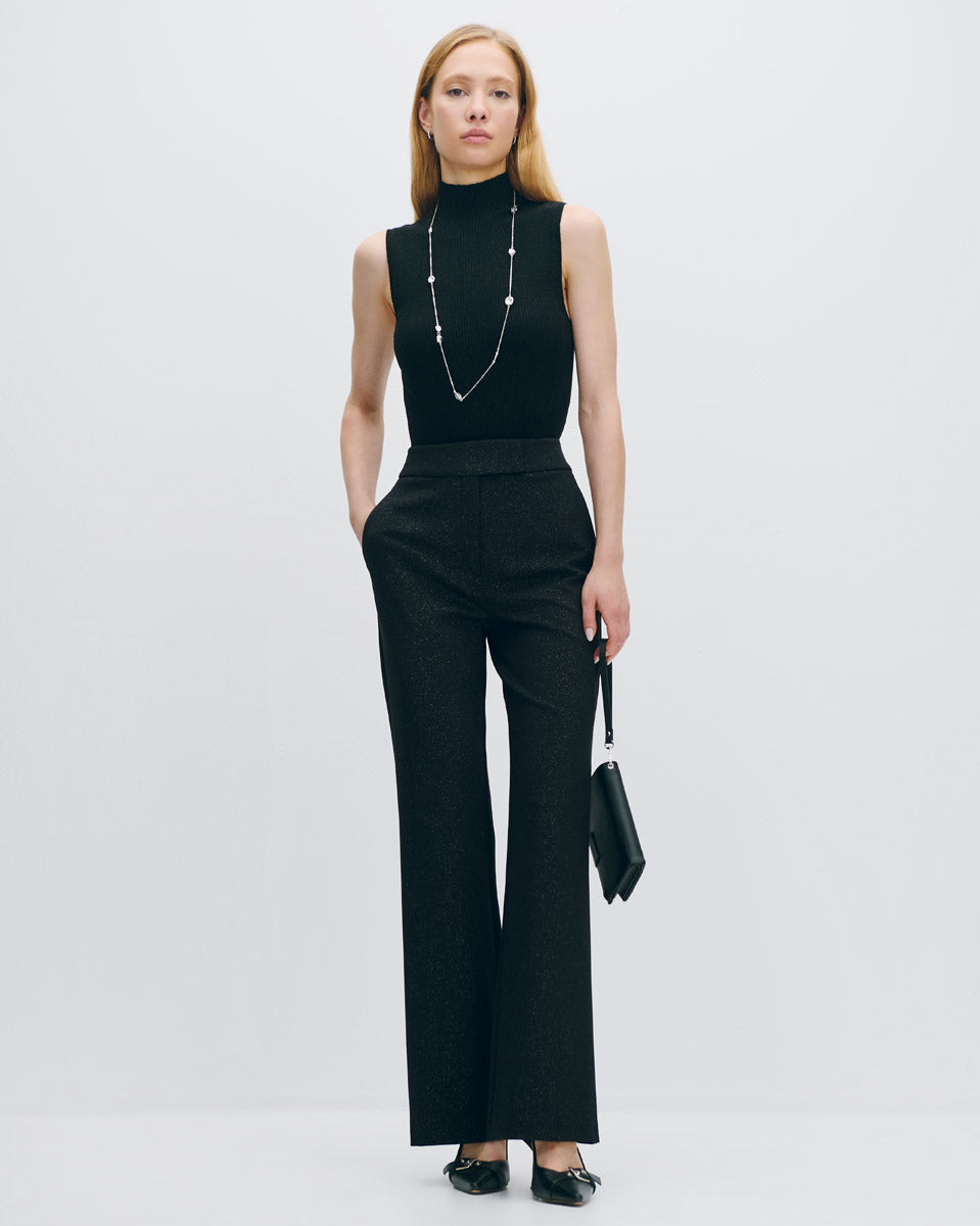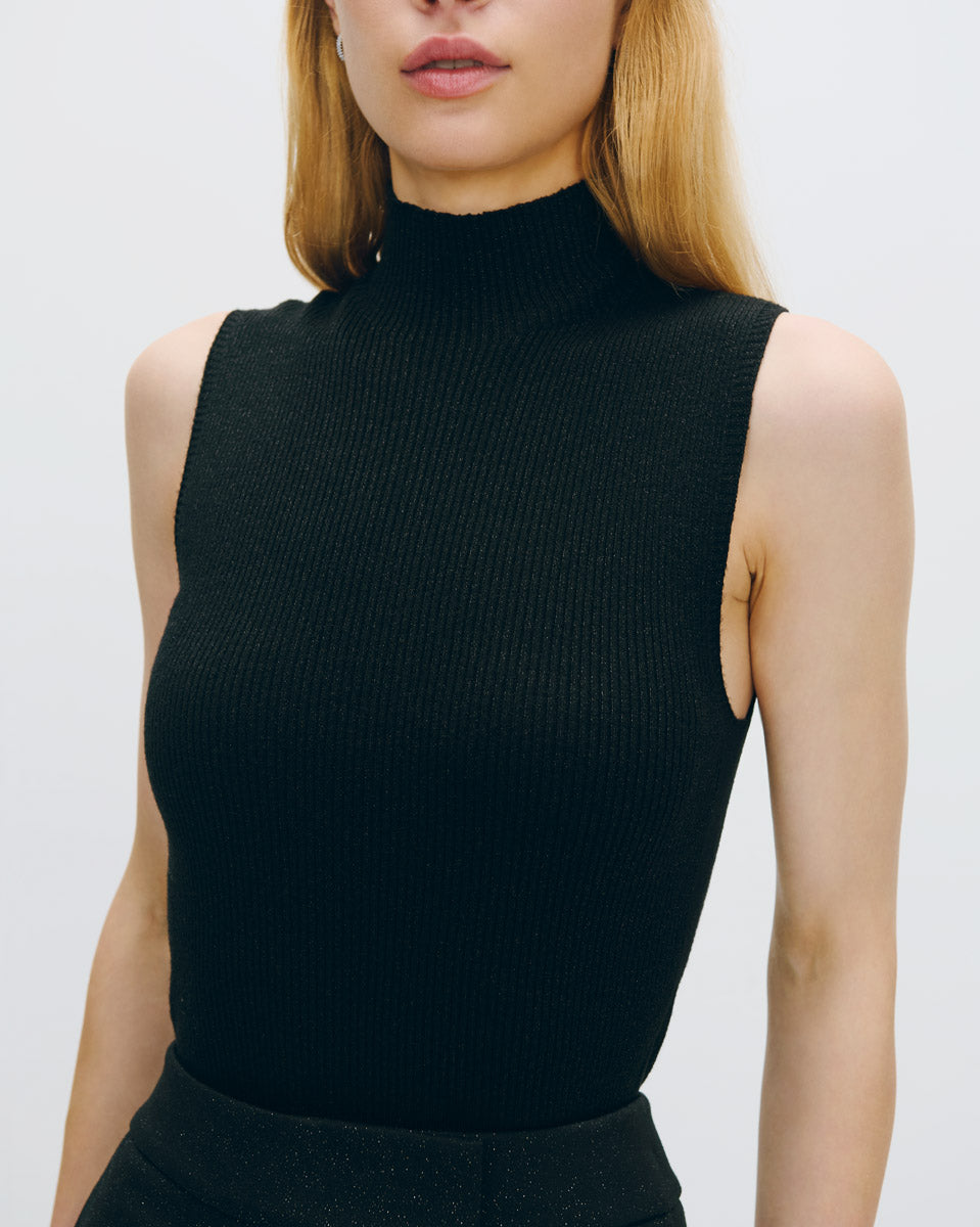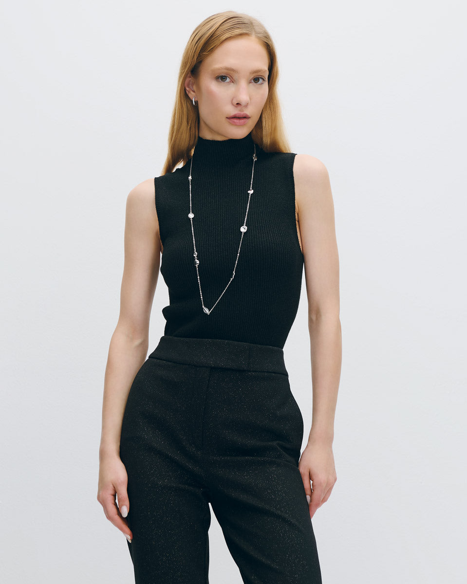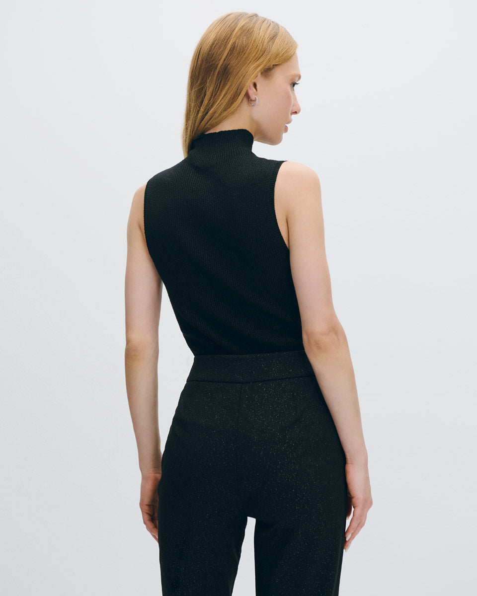 Con un diseño versátil, este top canalé negro con destellos dorados y cuello Perkins aporta sofisticación. Ideal para outfits de noche con pantalones de vinipiel o jeans rectos.