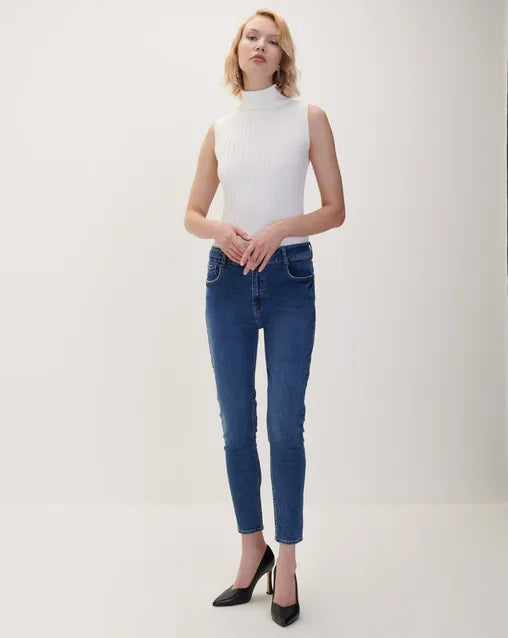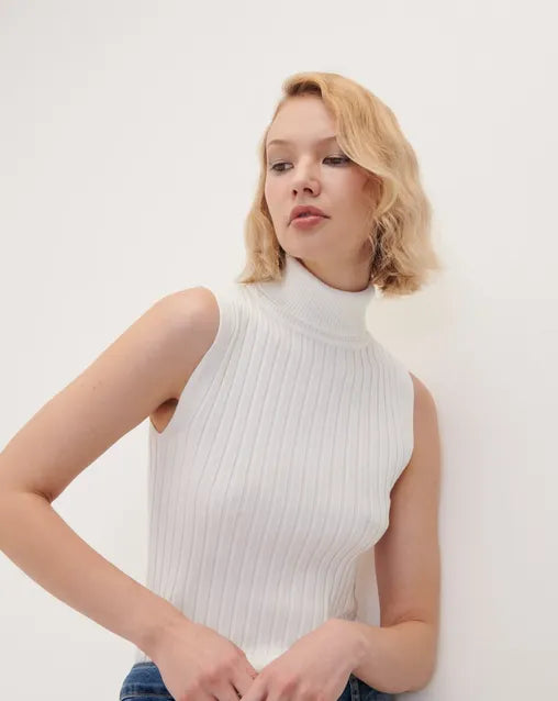 Un top tejido sin mangas y con cuello de tortuga es un esencial que podrás usar durante todo el año. En invierno úsalo debajo de un blazer JULIO para lograr un look clean y elevado.