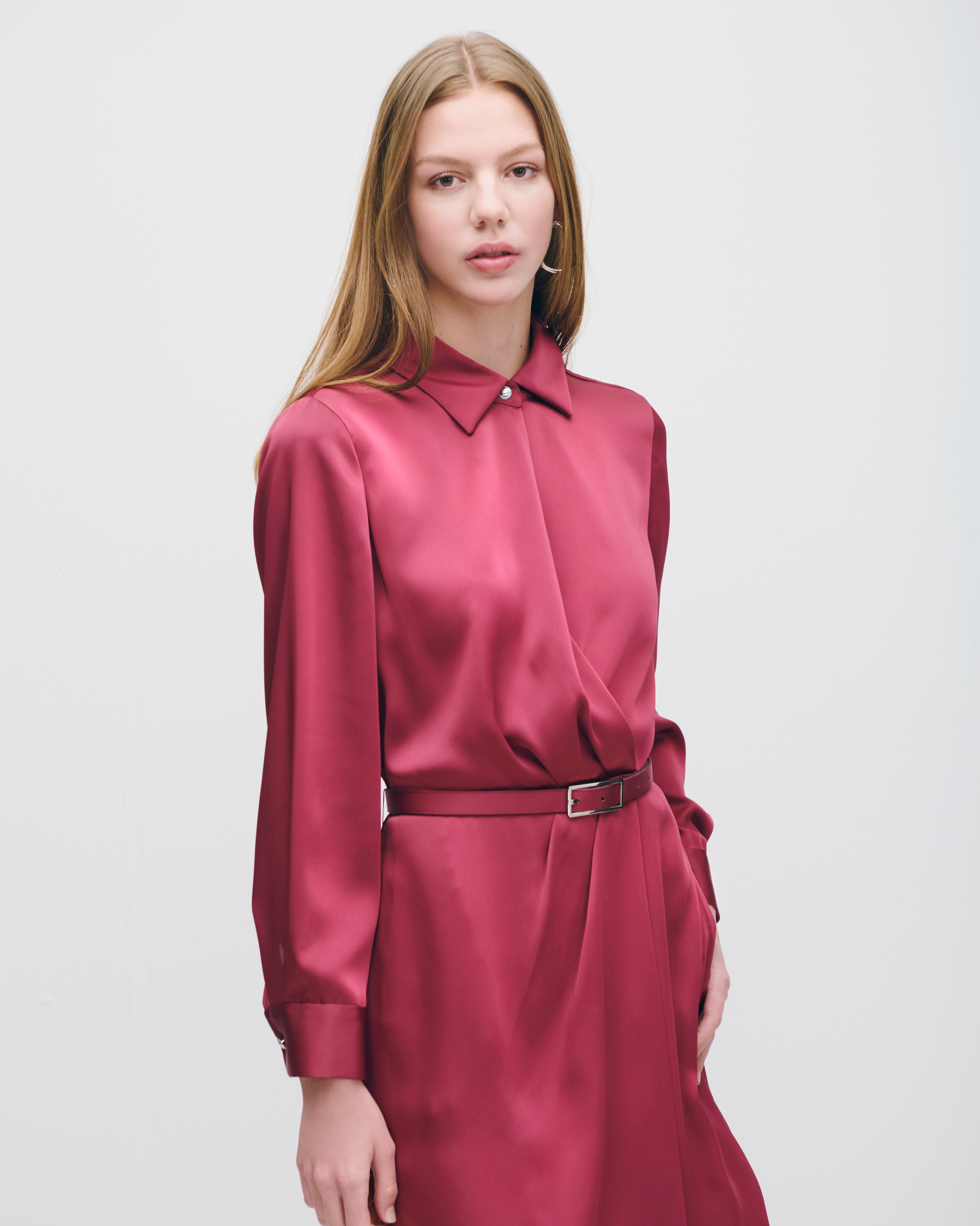 Este vestido de satín burdeos con cierre envolvente y cuello camisero combina fluidez y definición. El contraste del tejido lujoso con un corte estructurado estiliza la cintura. Muy elegante con tacones o botines, ideal con accesorios dorados o minimalistas para lograr un look sofisticado sin complicaciones.