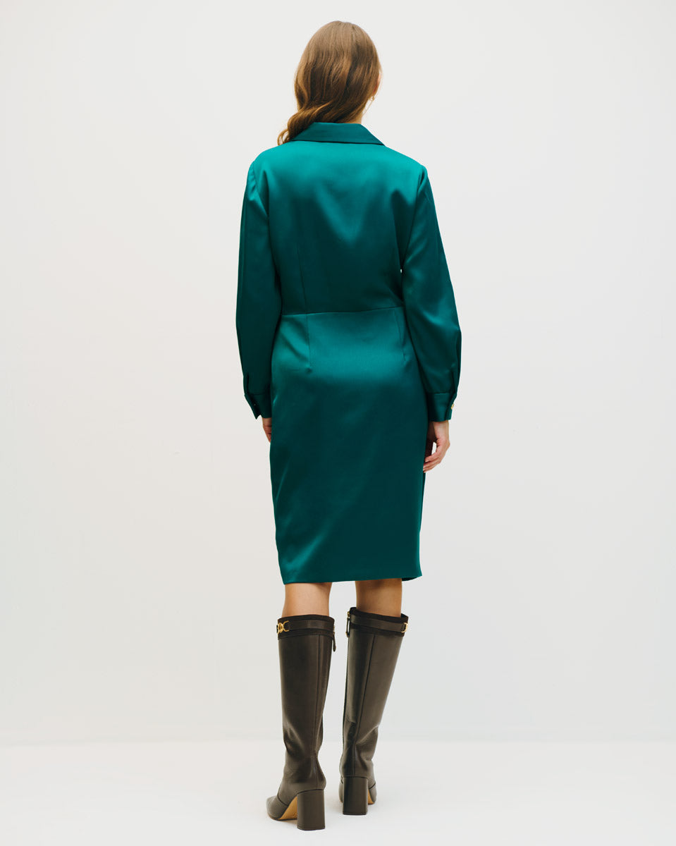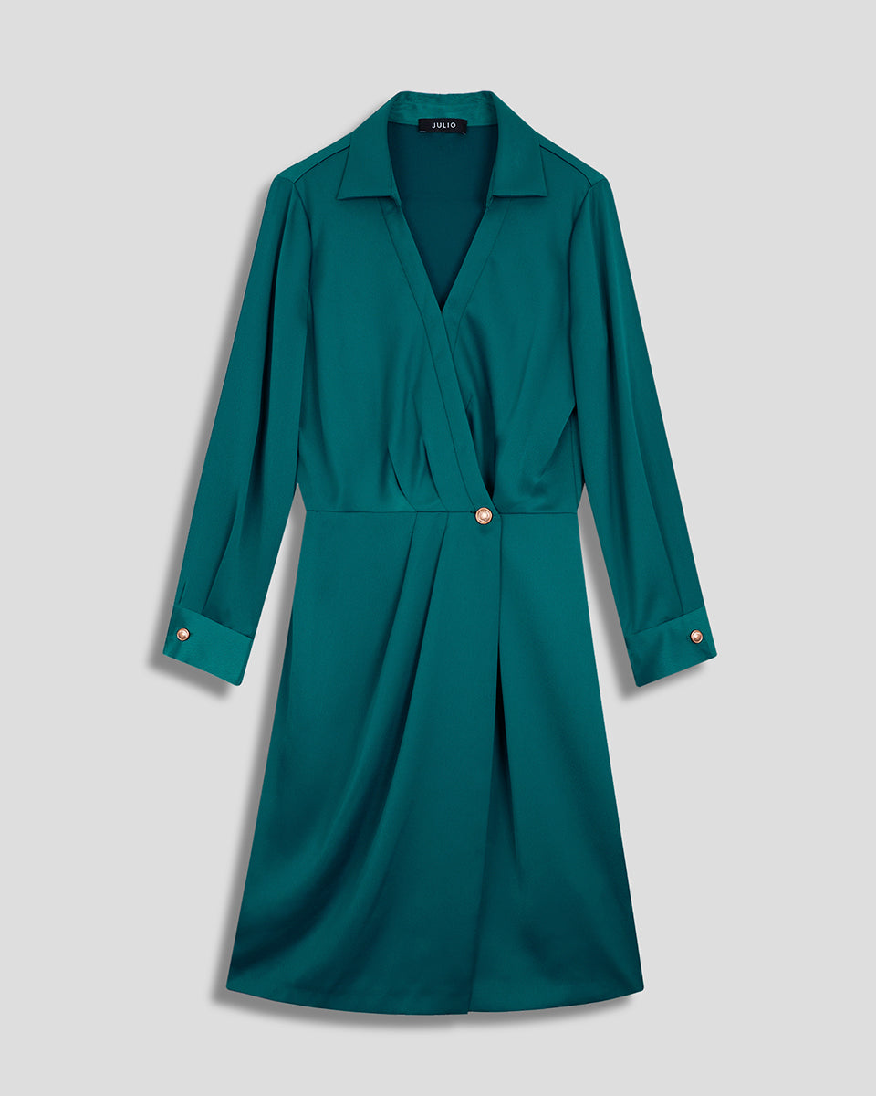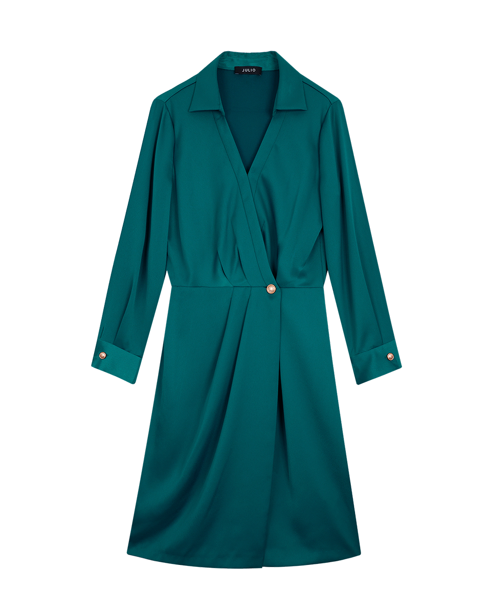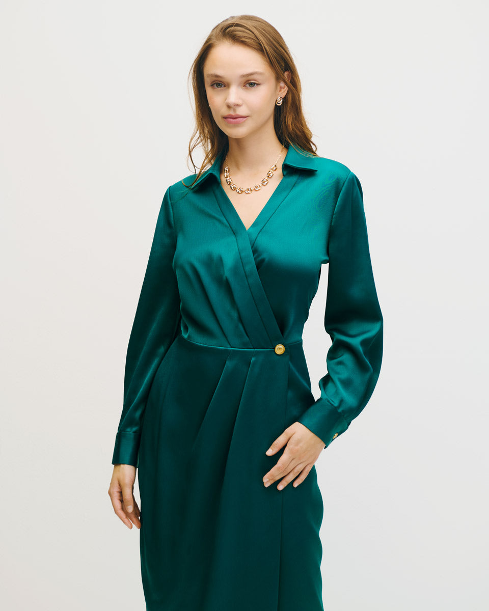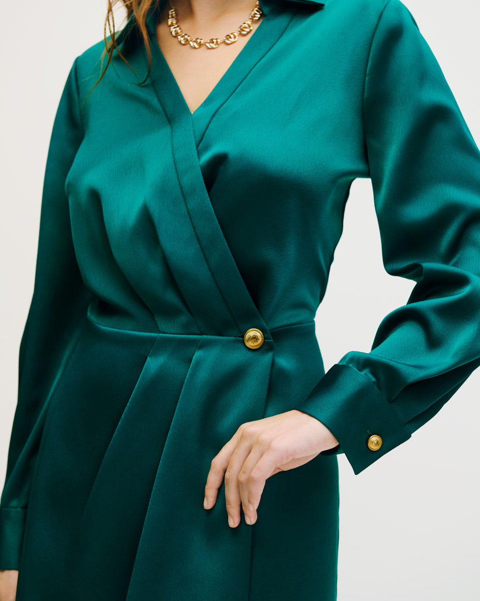 Vestido De Satín Envolvente Esmeralda Con Alforzas