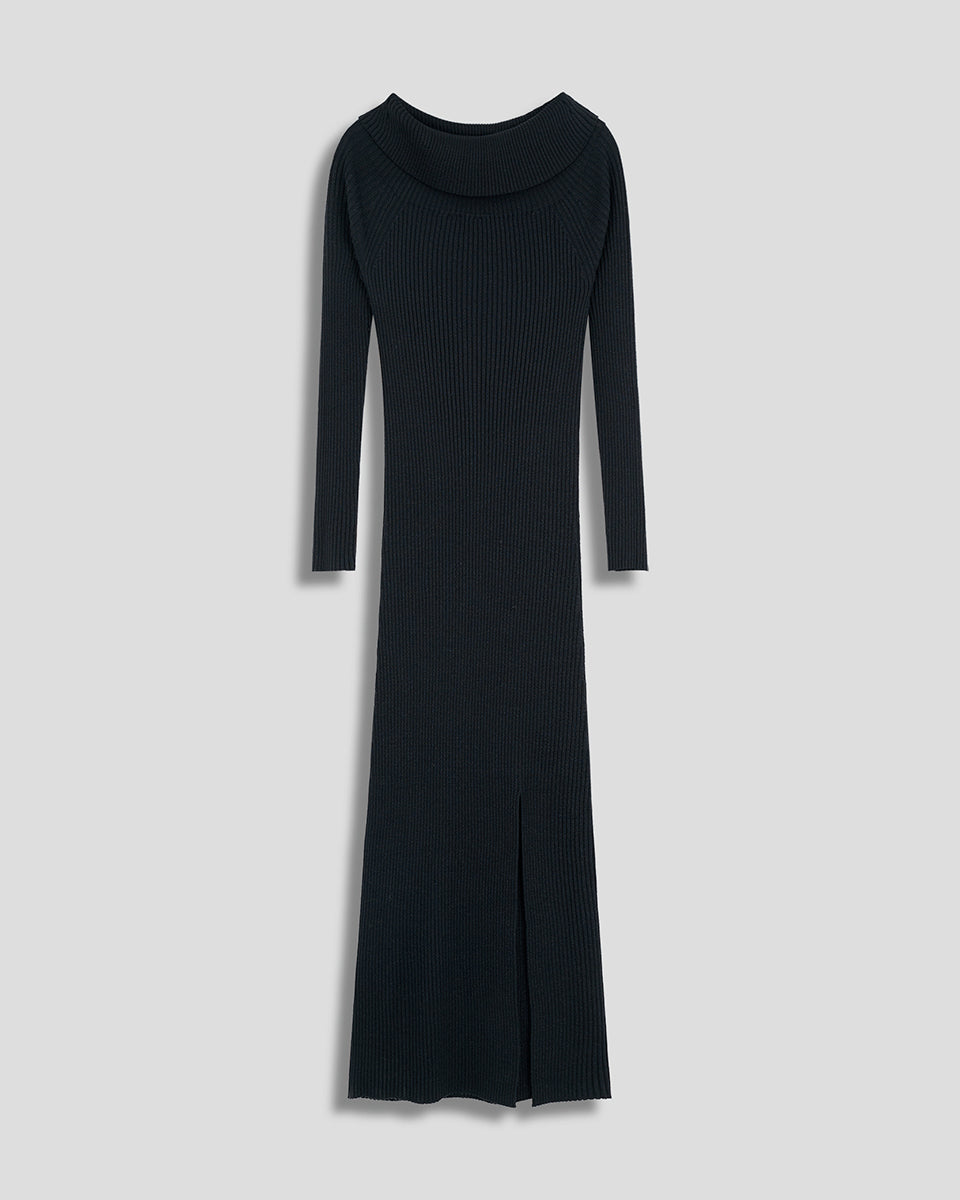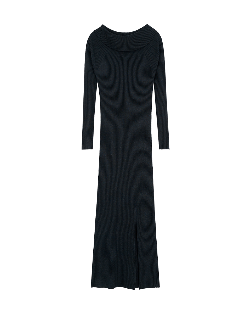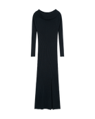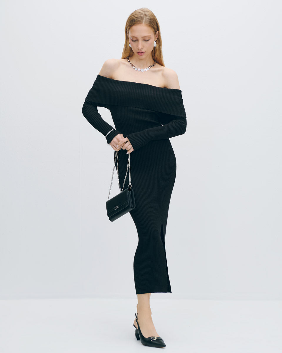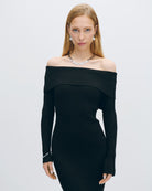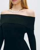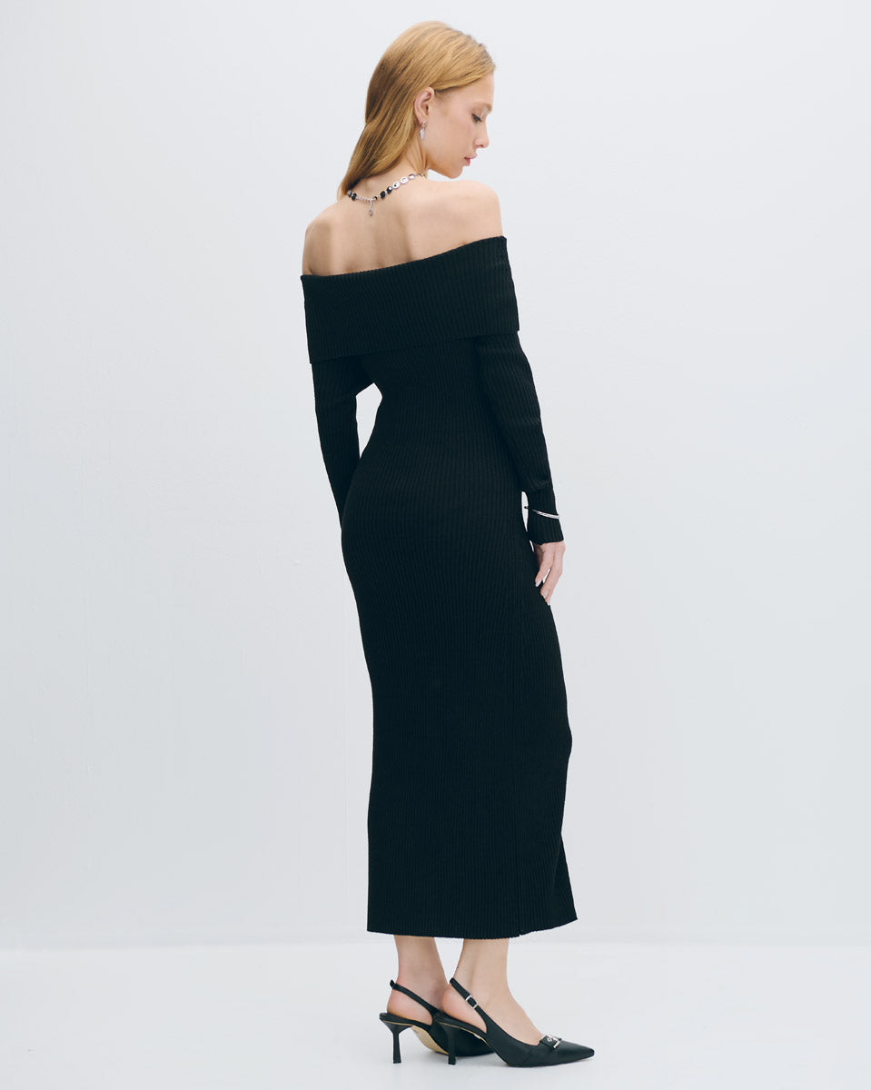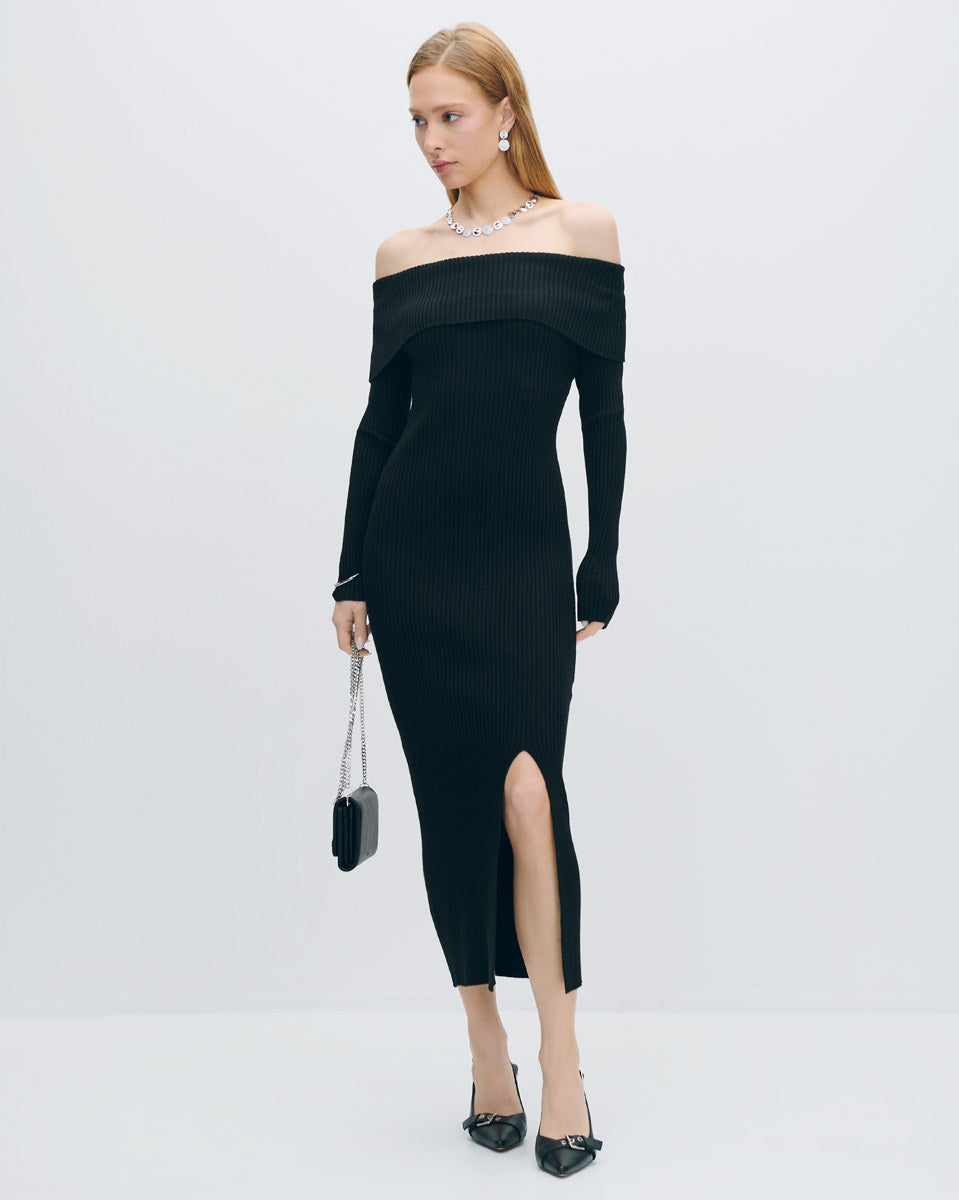Vestido Midi Negro Entallado Tejido Canalé Escote Bardot