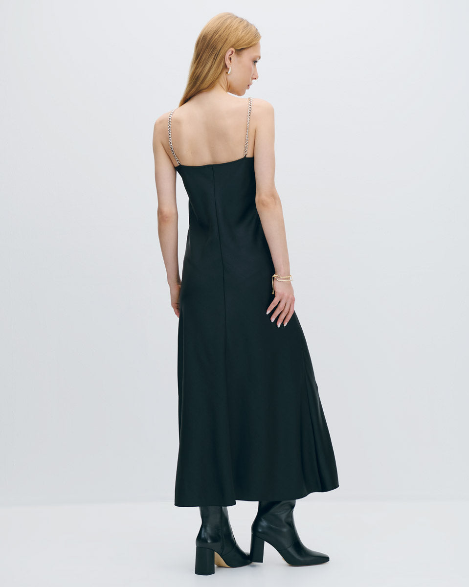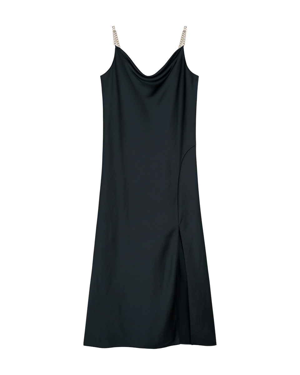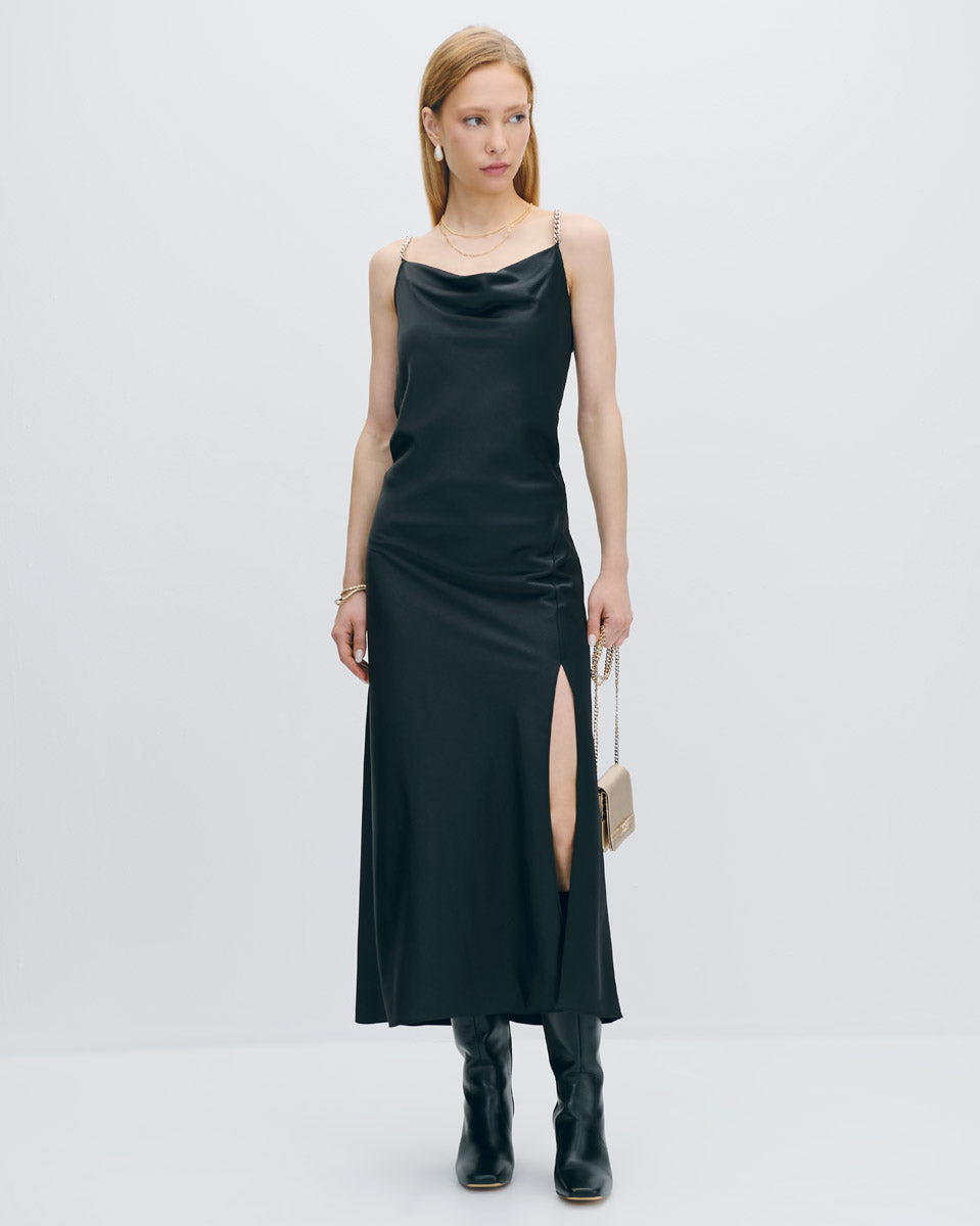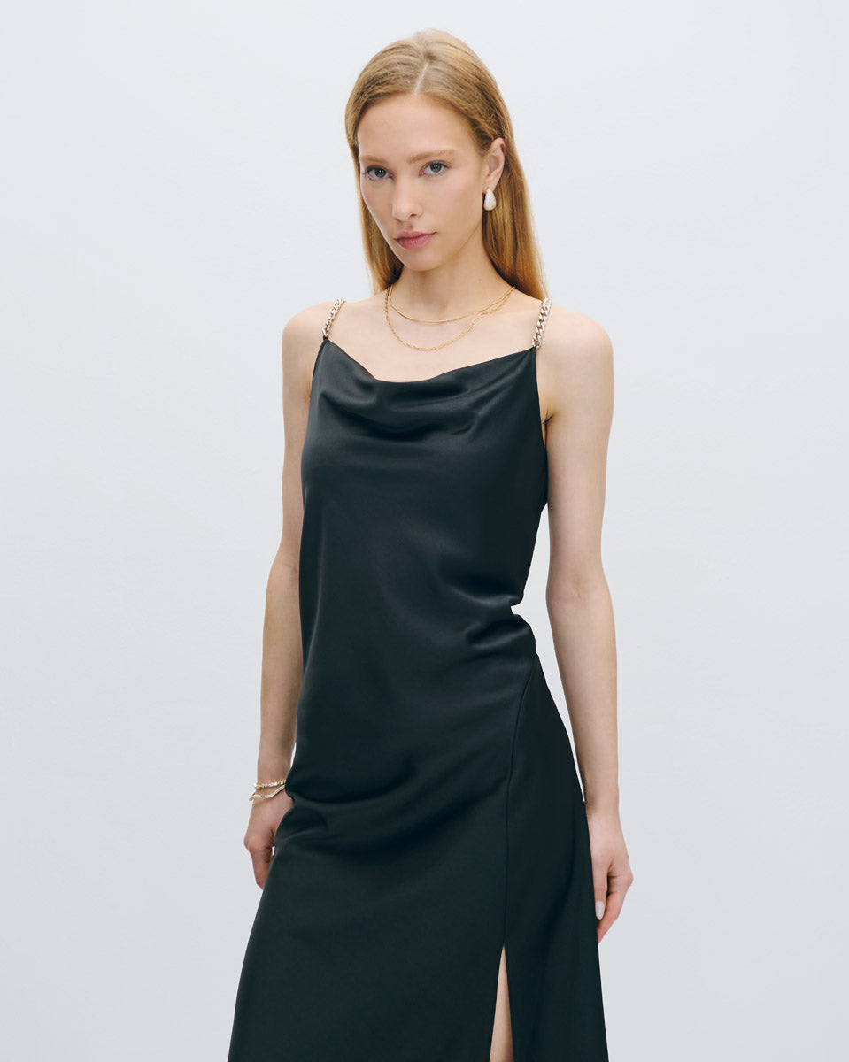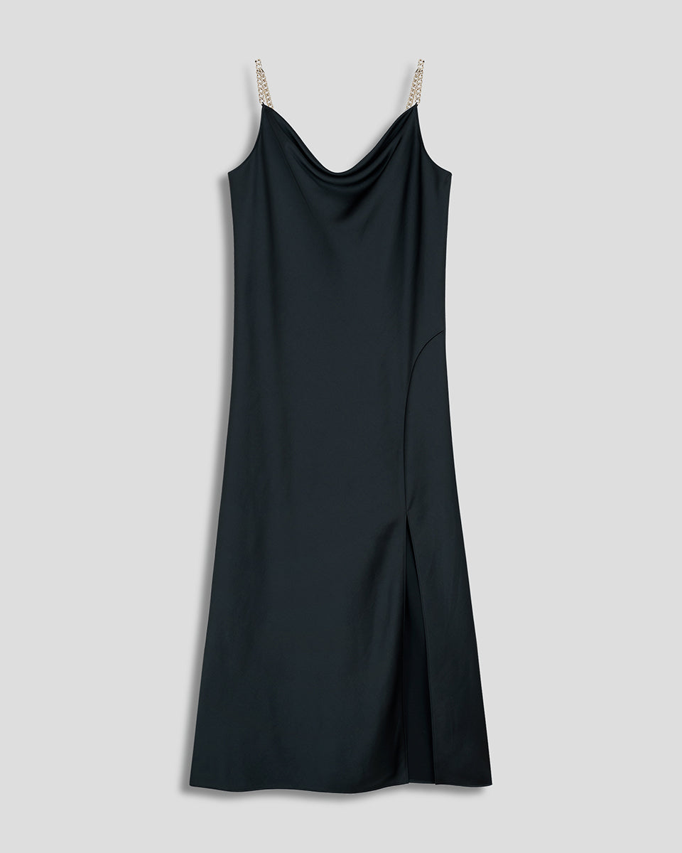 Vestido Negro De Satín Escote Drapeado Tirante Cadena Y Abertura