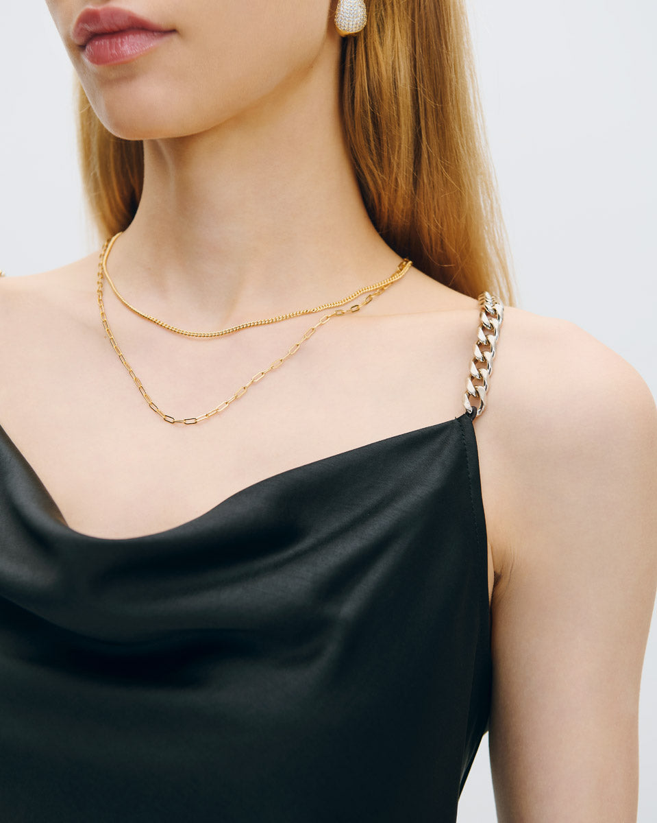 Este vestido largo juega con el contraste entre la suavidad del satín y el brillo de las cadenas en los tirantes. Su abertura aporta un aire seductor sin perder sofisticación.