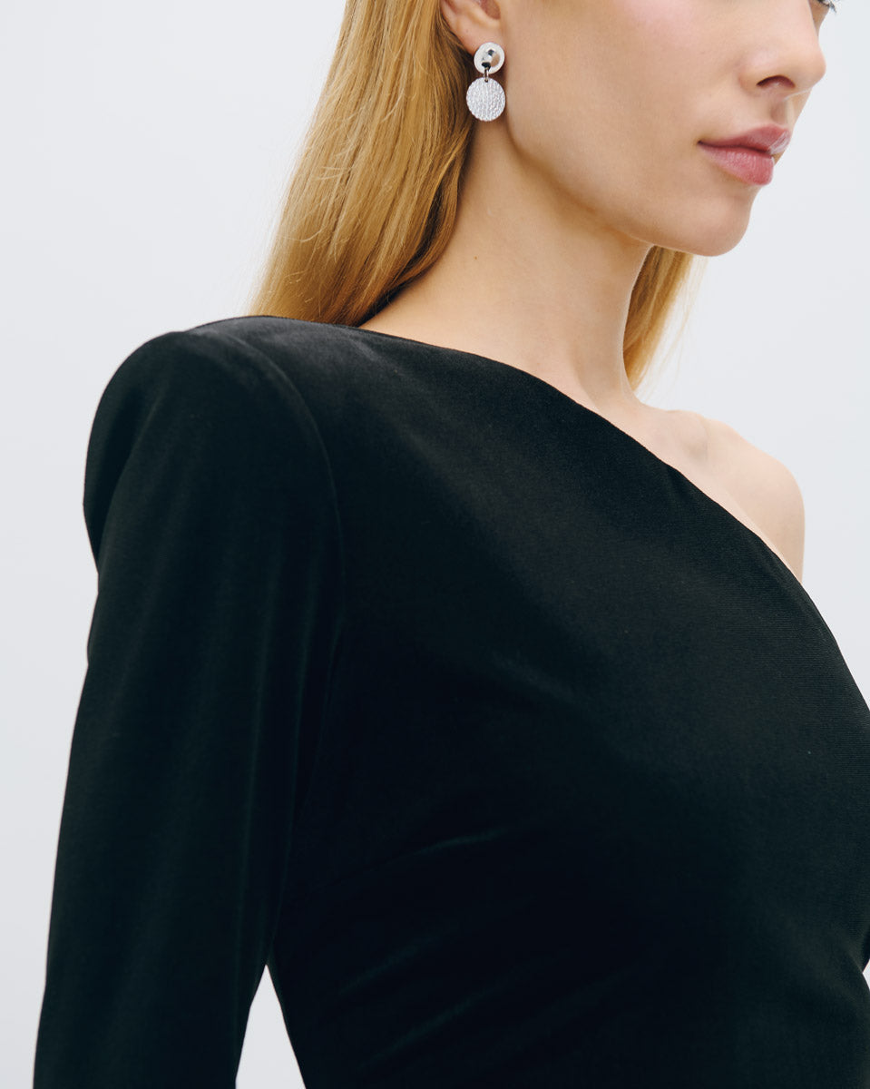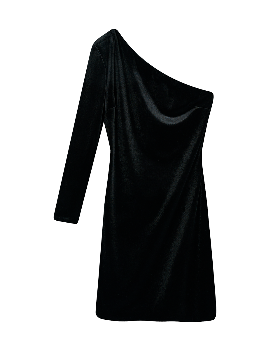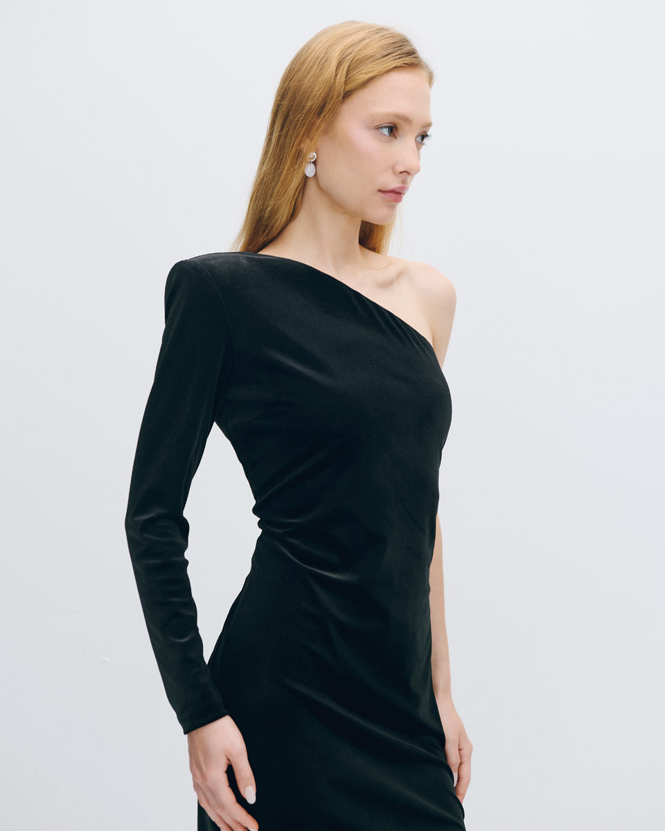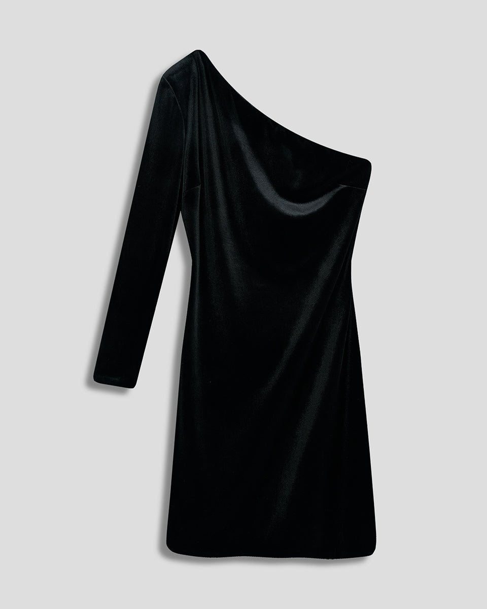 El terciopelo se convierte en protagonista en este vestido entallado. Su escote asimétrico con hombrera aporta dramatismo y un aire de sofisticación teatral.