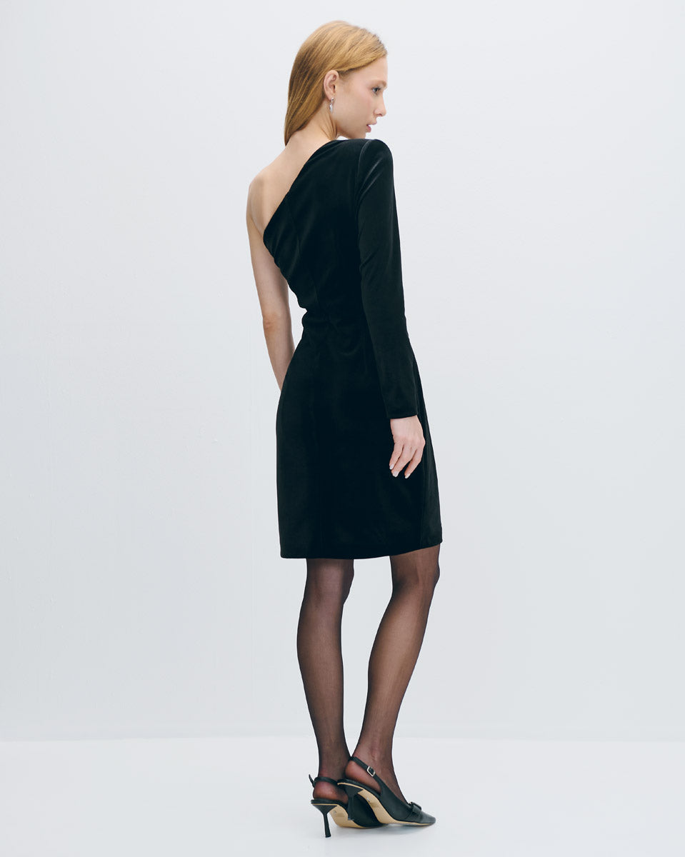 Vestido Negro Entallado Terciopelo Escote Asimétrico Con Hombrera
