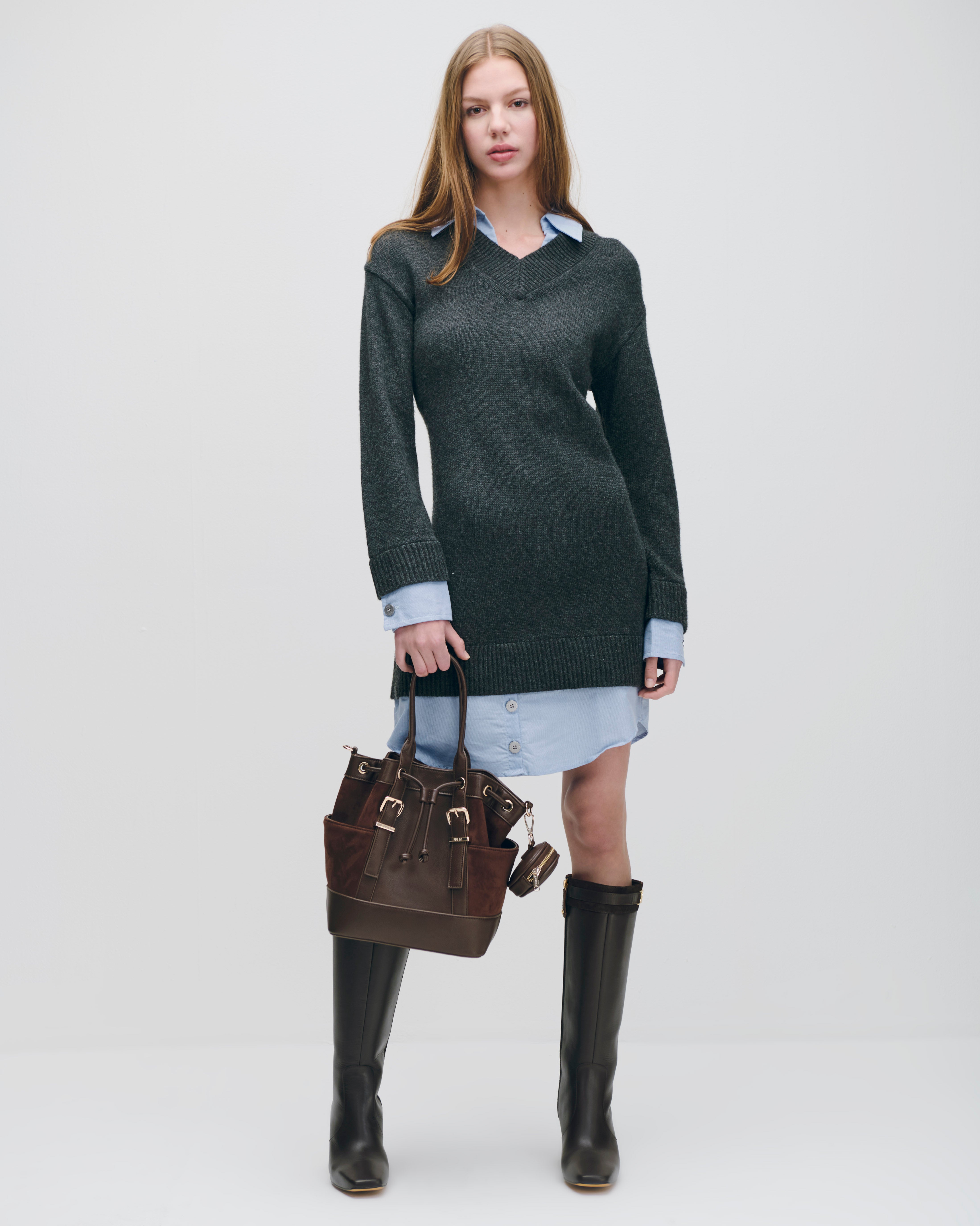 Este vestido suéter combina tejido de punto con una camisa simulada en escote V. Ideal para looks cozy con presencia. Aporta estructura y abrigo ligero. Llévalo con botas y cinturón fino para marcar cintura. Una opción cálida, cómoda y juvenil.