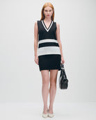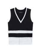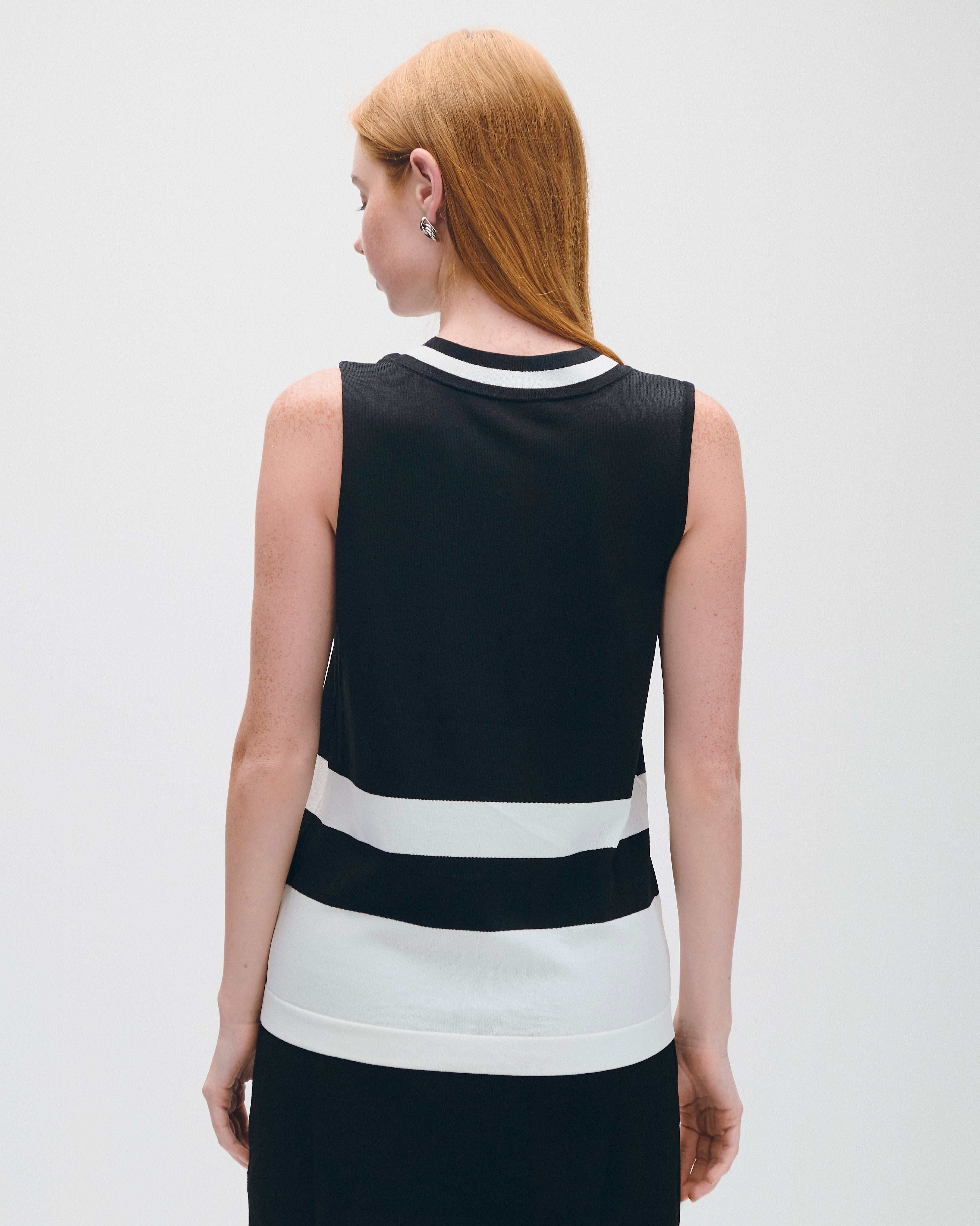 Esta blusa de punto negra incorpora franjas contrastantes que crean un efecto visual moderno. El escote V favorece el cuello y funciona perfecto con jeans rectos o faldas negras.