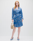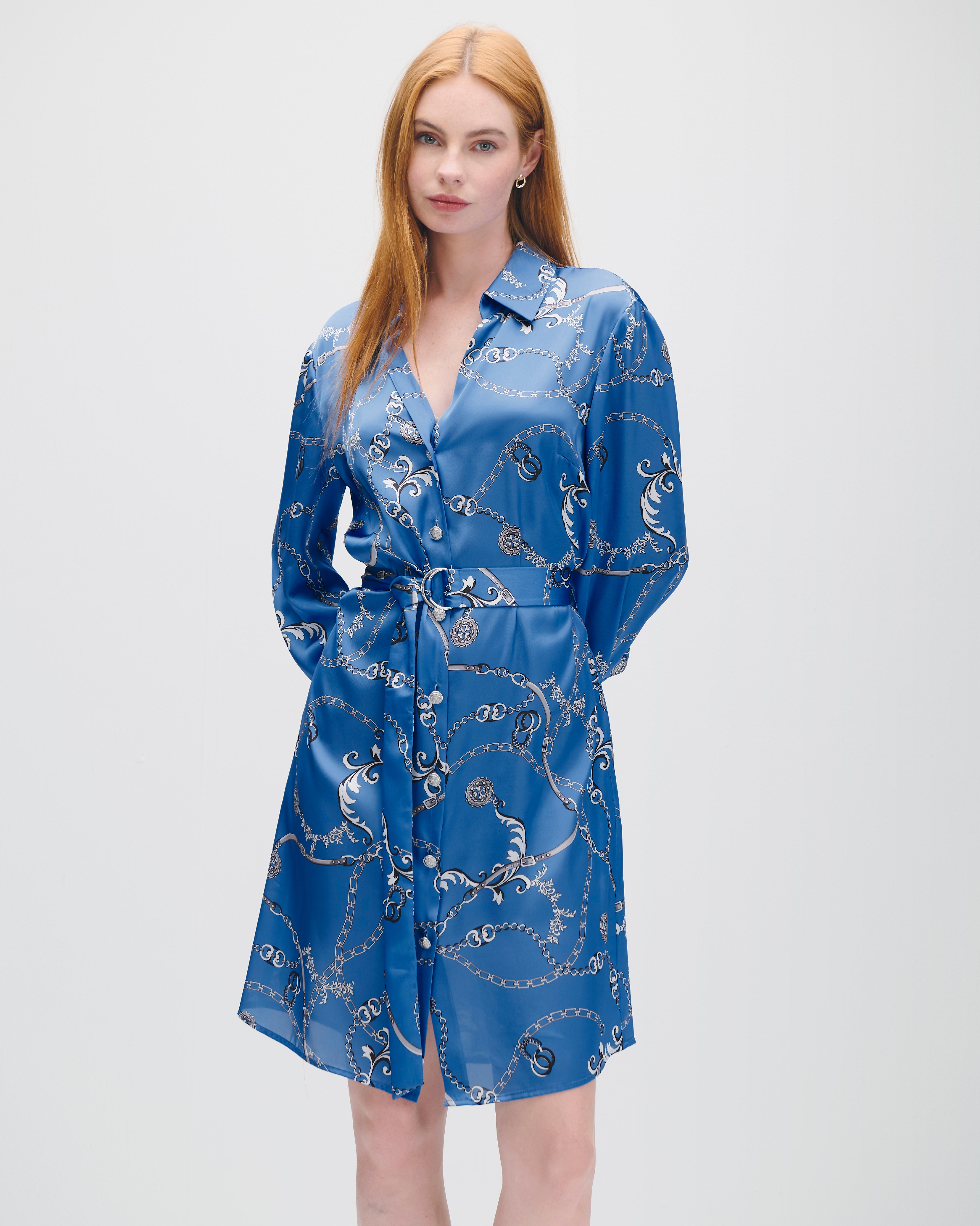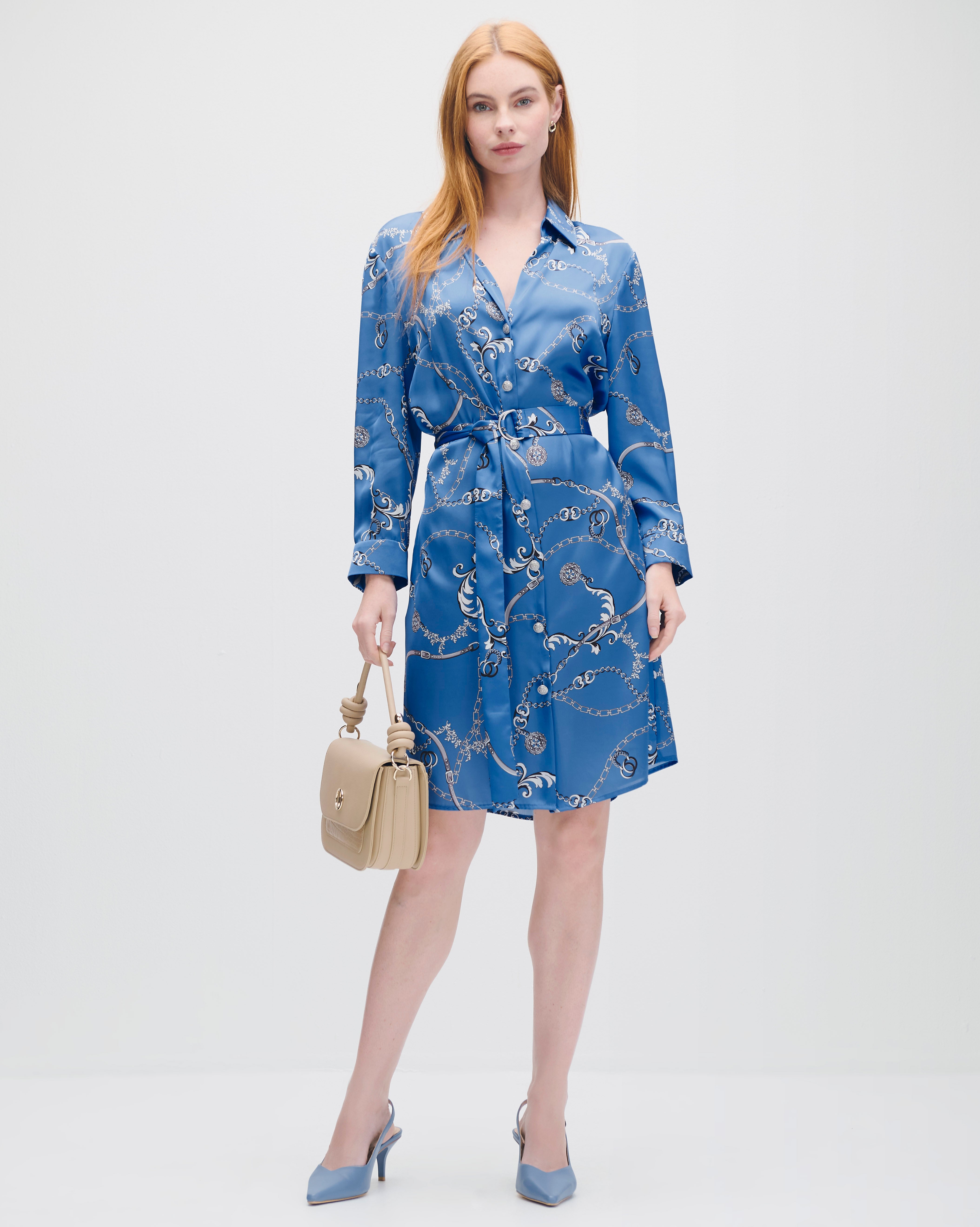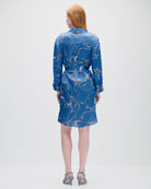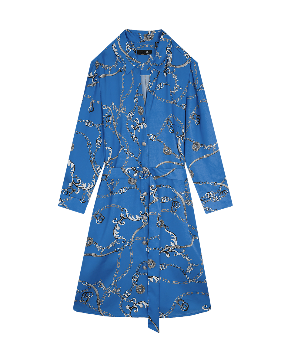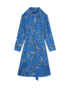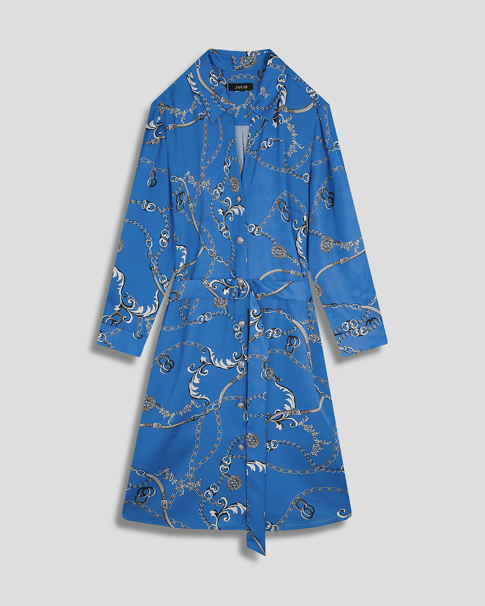 Vestido Camisero De Satín Azul Azulino Estampado Cadenas Manga 3/4