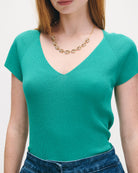 La blusa verde trébol aporta frescura con un color que lidera las tendencias naturales de primavera. Su escote V alarga visualmente el cuello, mientras el contraste en mangas moderniza el diseño. Ideal con jeans rectos, pantalones crema o shorts tweed para un look relajado y actual.
