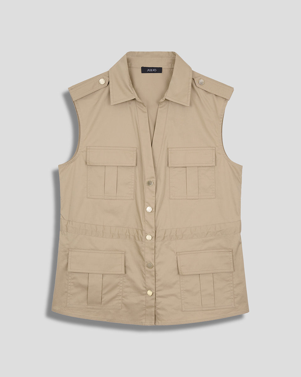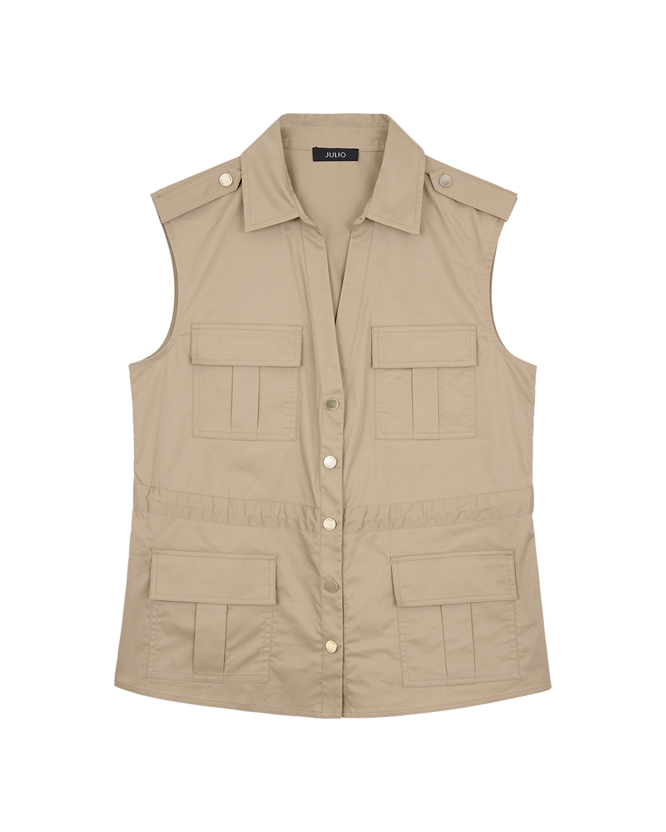 Este chaleco largo estilo safari en tono kaki es ideal para sumar capas con elegancia. Su silueta alargada estiliza la figura y aporta un aire sofisticado de inspiración utilitaria. Perfecto para combinar con blusas ligeras, vestidos o pantalones sastre.