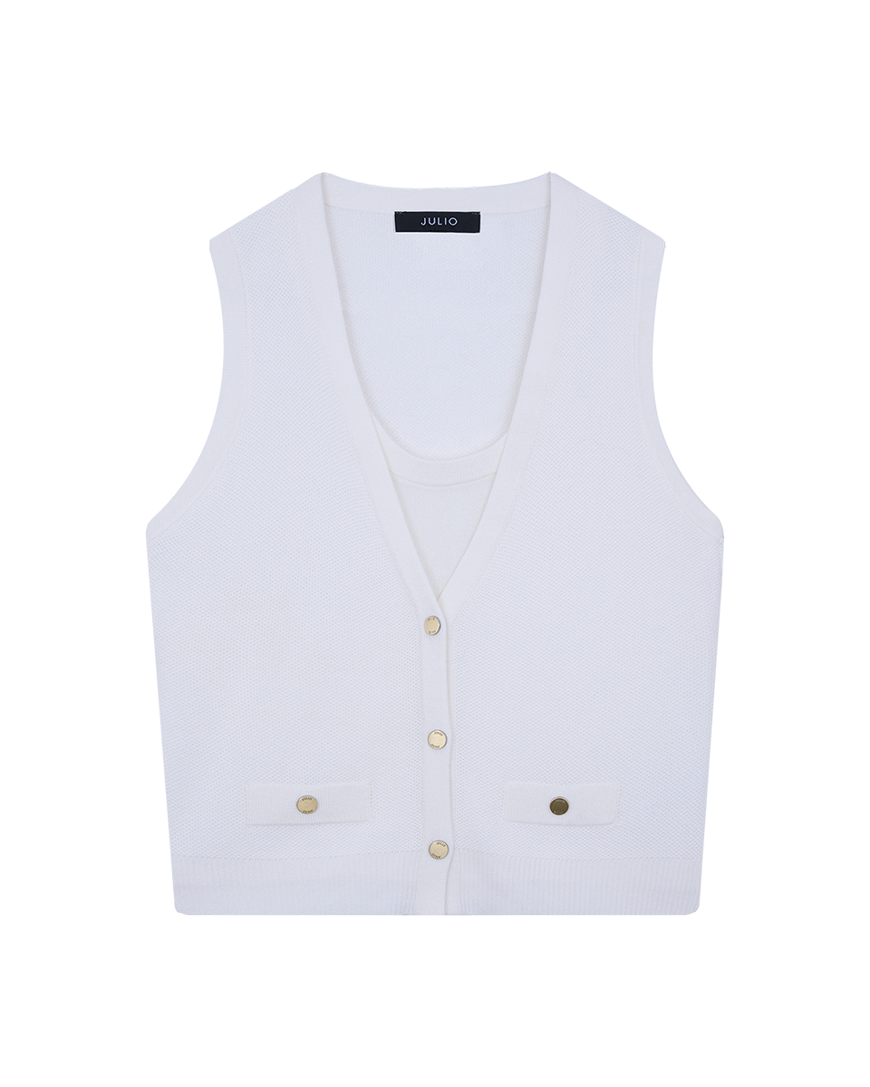 Este chaleco tejido en color blanco con efecto top simulado se distingue por su diseño limpio y su acabado con lúrex, que aporta un brillo delicado. Ideal para llevar solo o en layering.