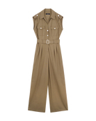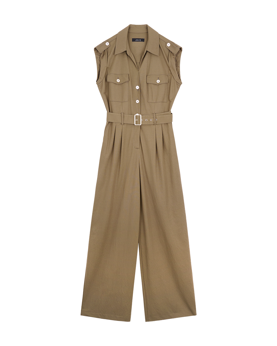 Este jumpsuit estilo safari en color verde olivo es una pieza protagonista pensada para mujeres que buscan elegancia práctica. Su diseño de líneas limpias se complementa con una banda que ajusta la cintura.
