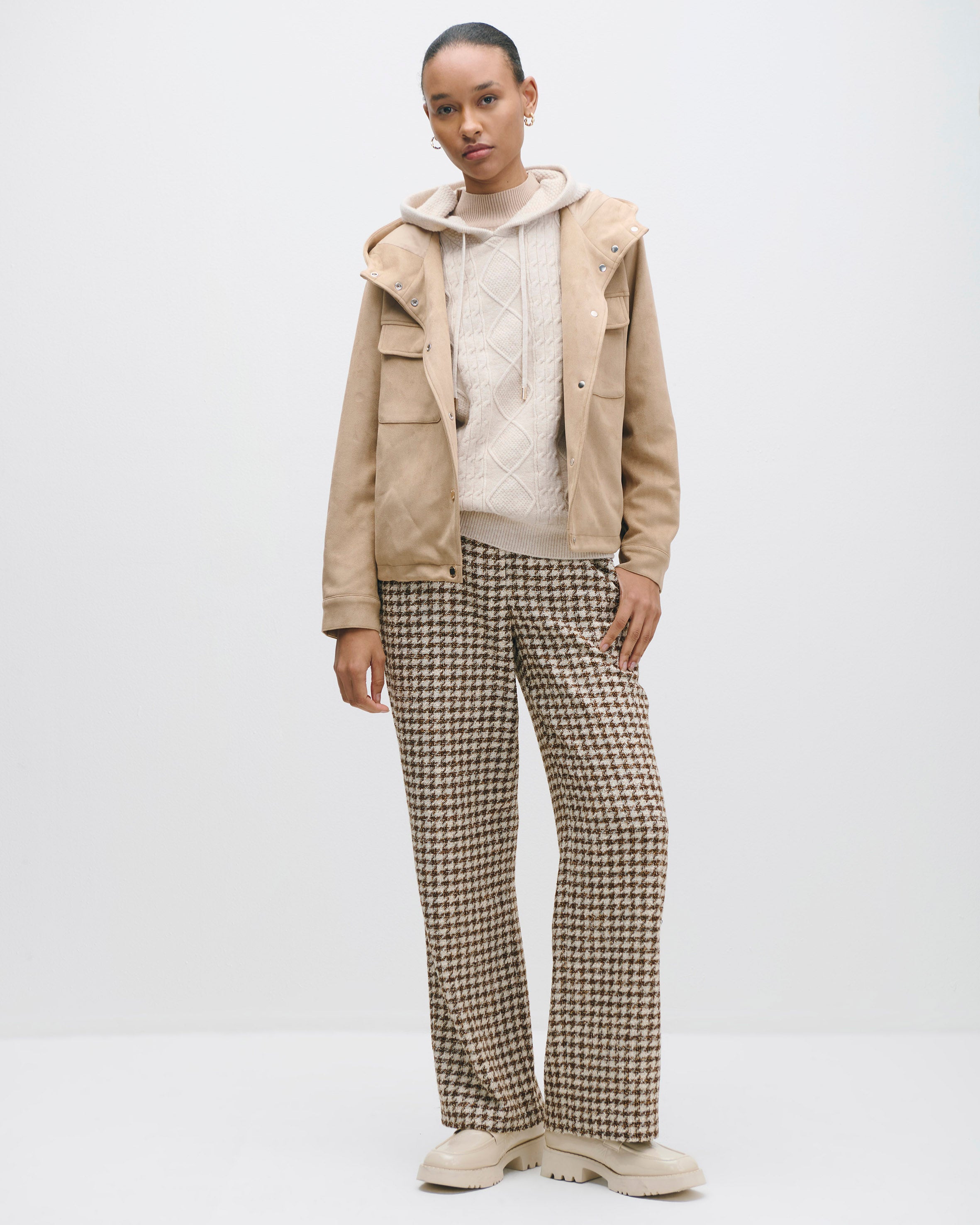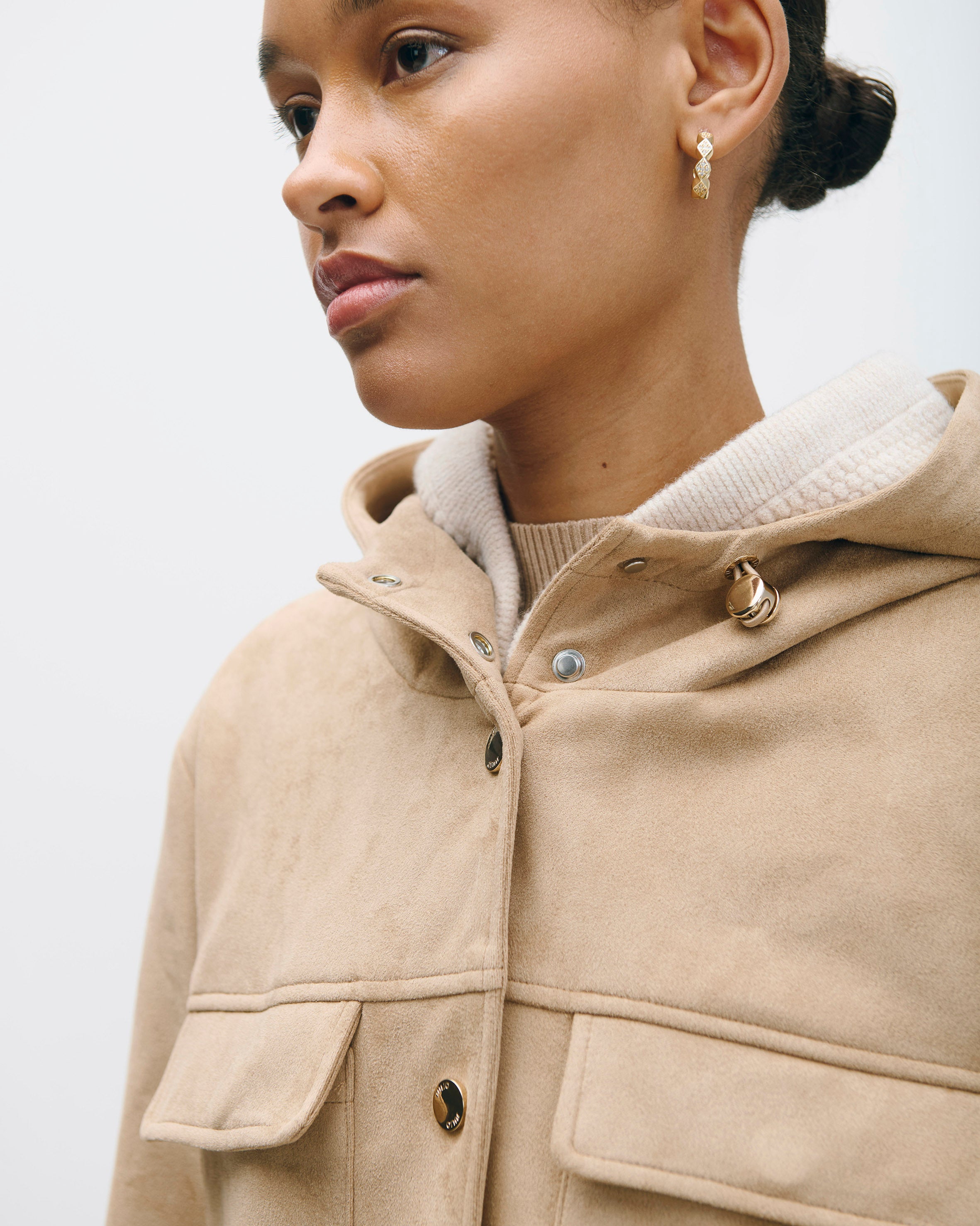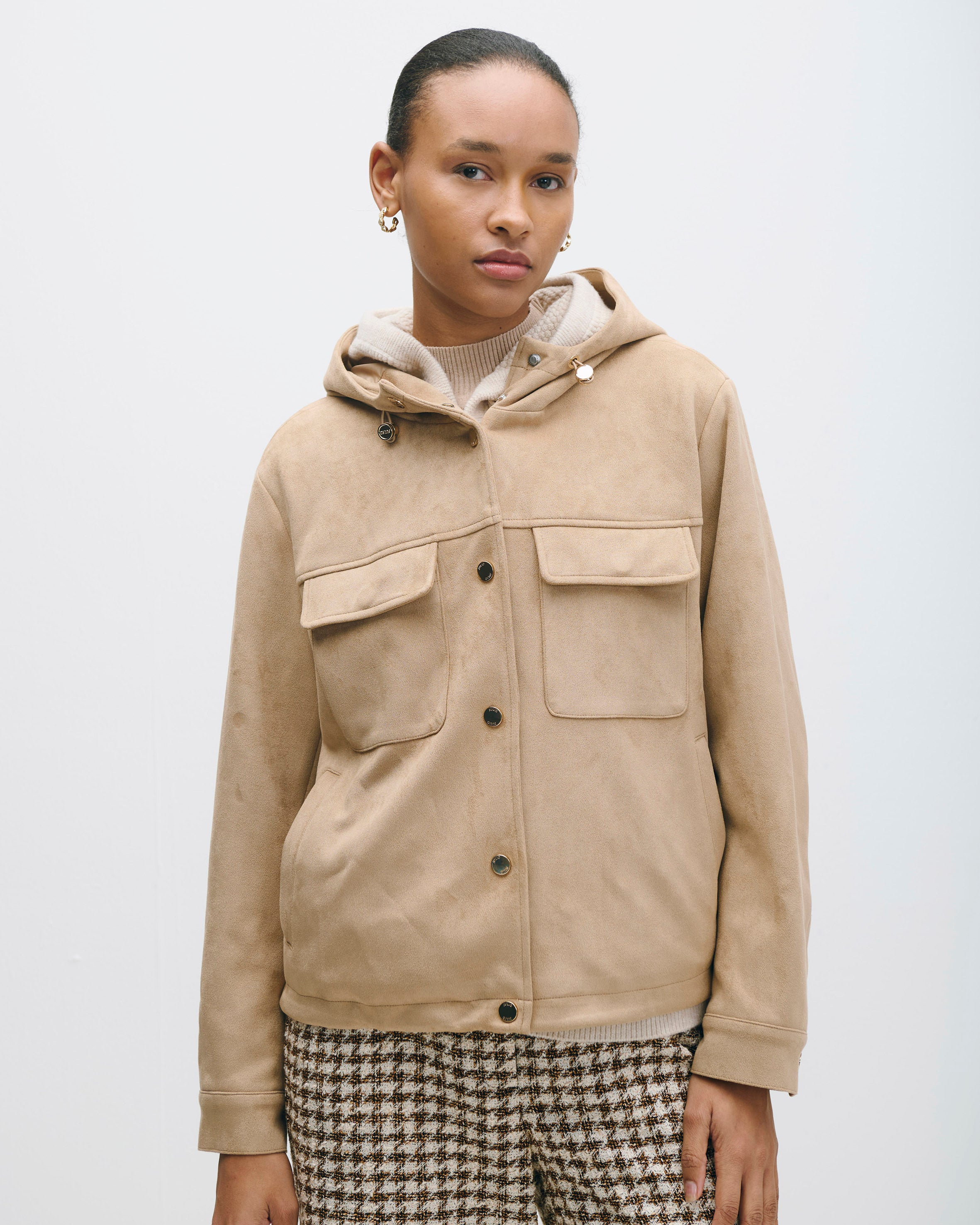 Esta chumpa en gamuza tono arena incluye capucha para un estilo relajado y moderno. Su textura suave la hace perfecta para looks casuales. Combina con jeans, leggings o vestidos de punto.