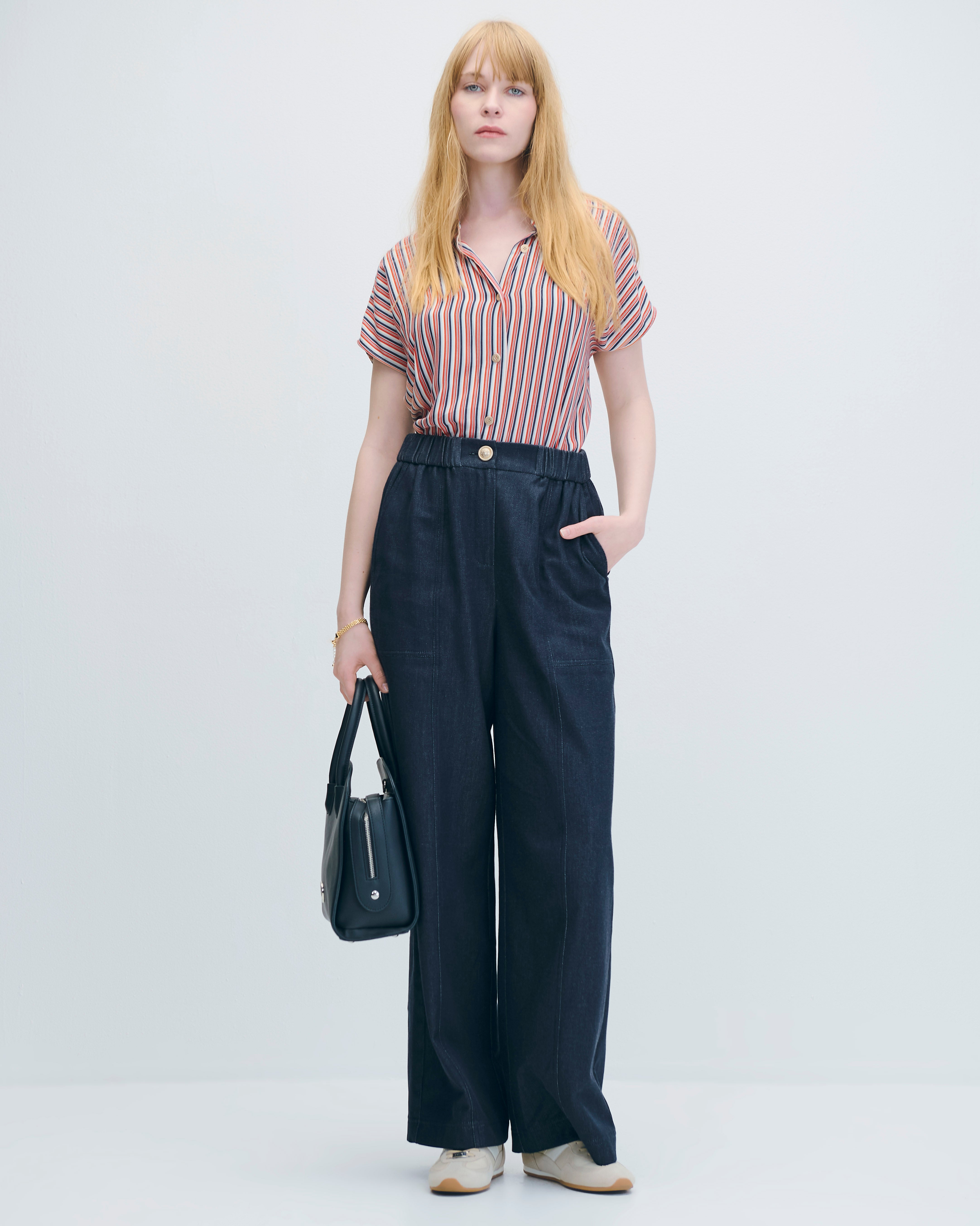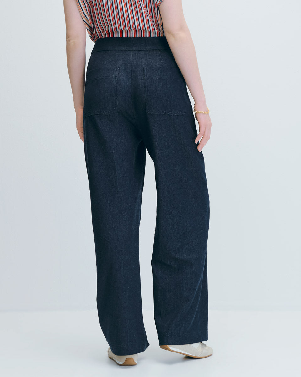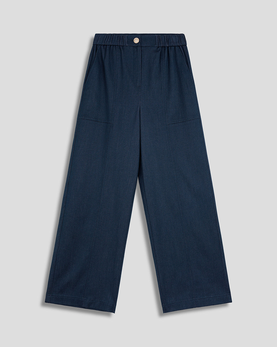 Pantalón Tipo Denim Wide Leg Tiro Alto Pretina Enresortada