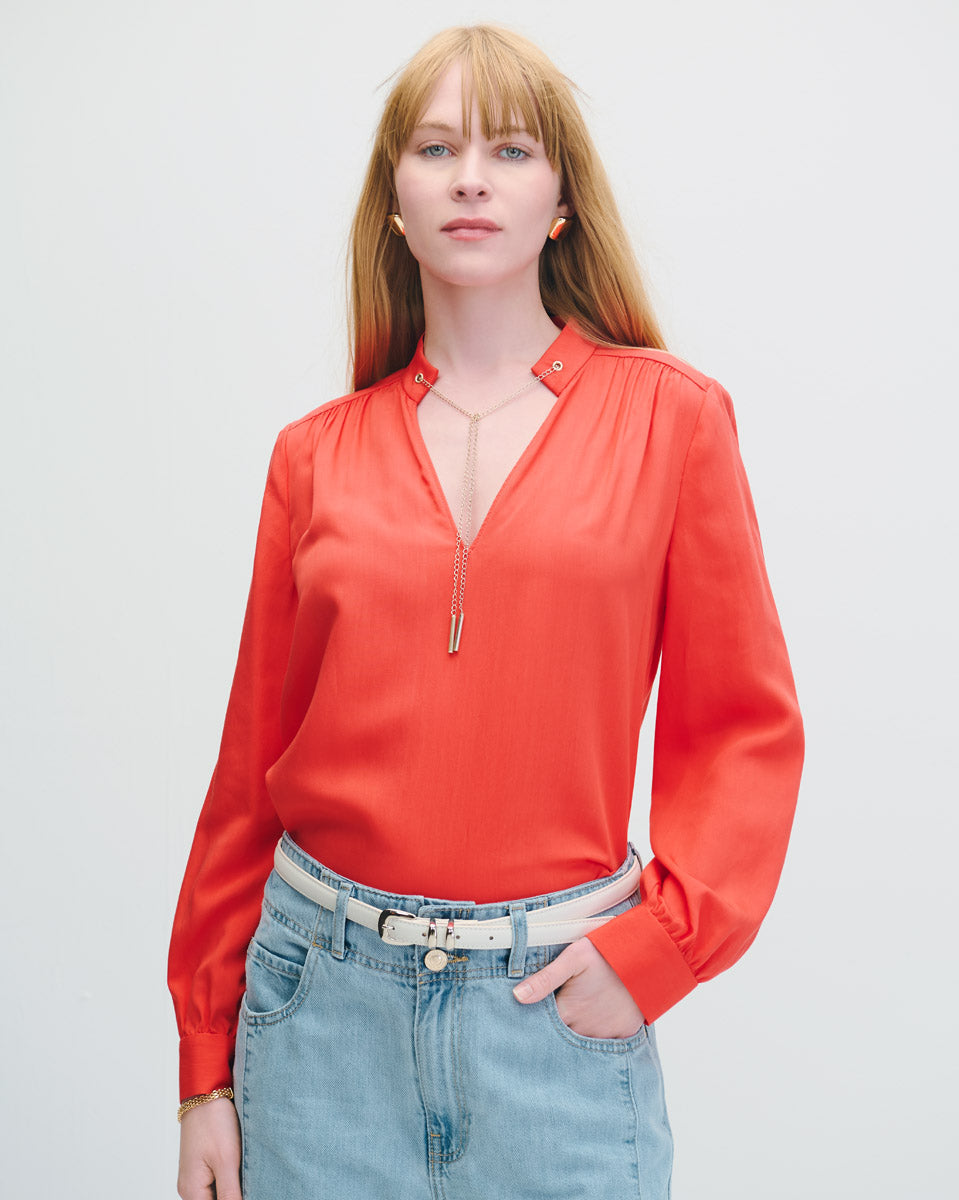 Blusa Rojo Escarlata Efecto Corrugado Escote V Jaretas Metálicas
