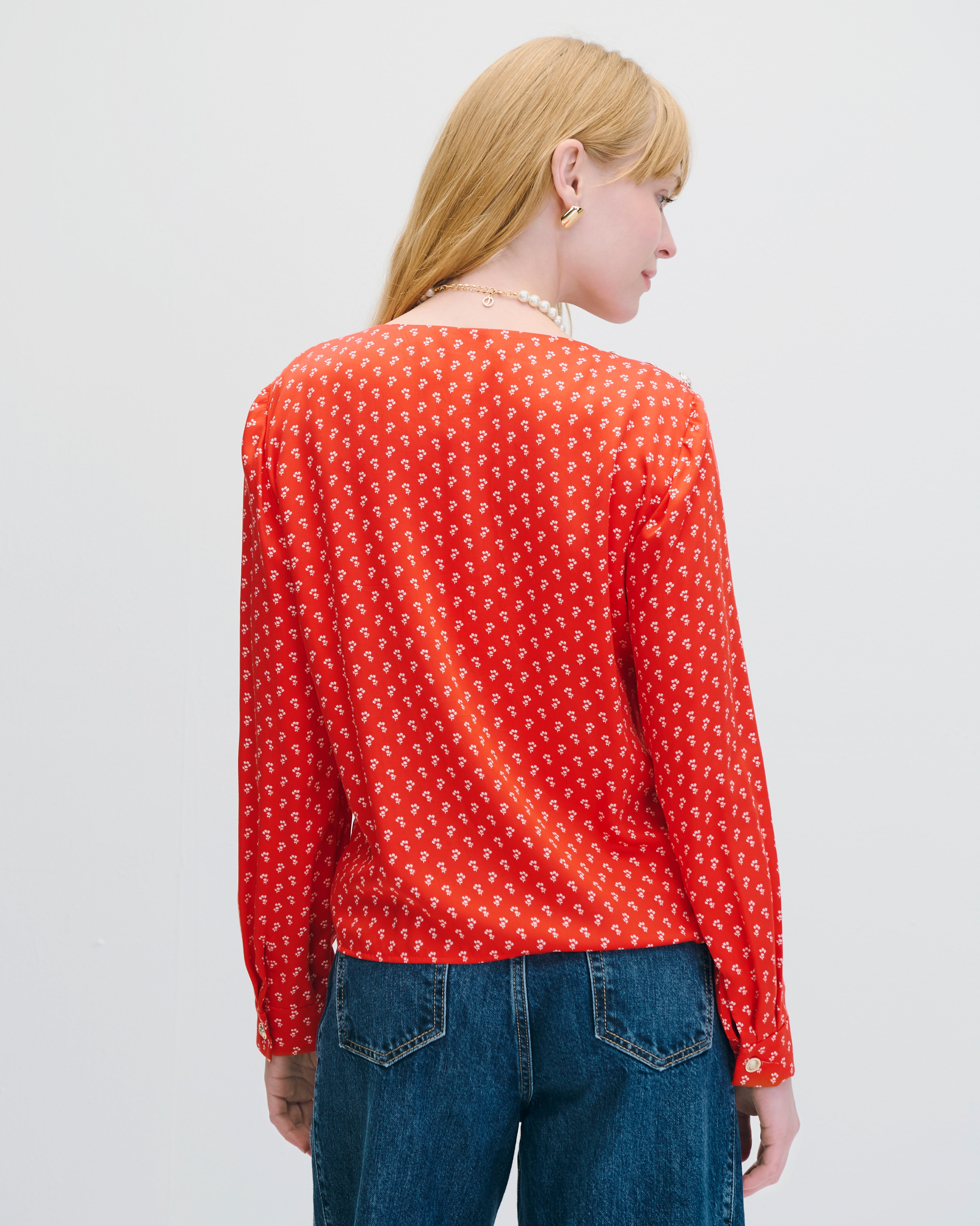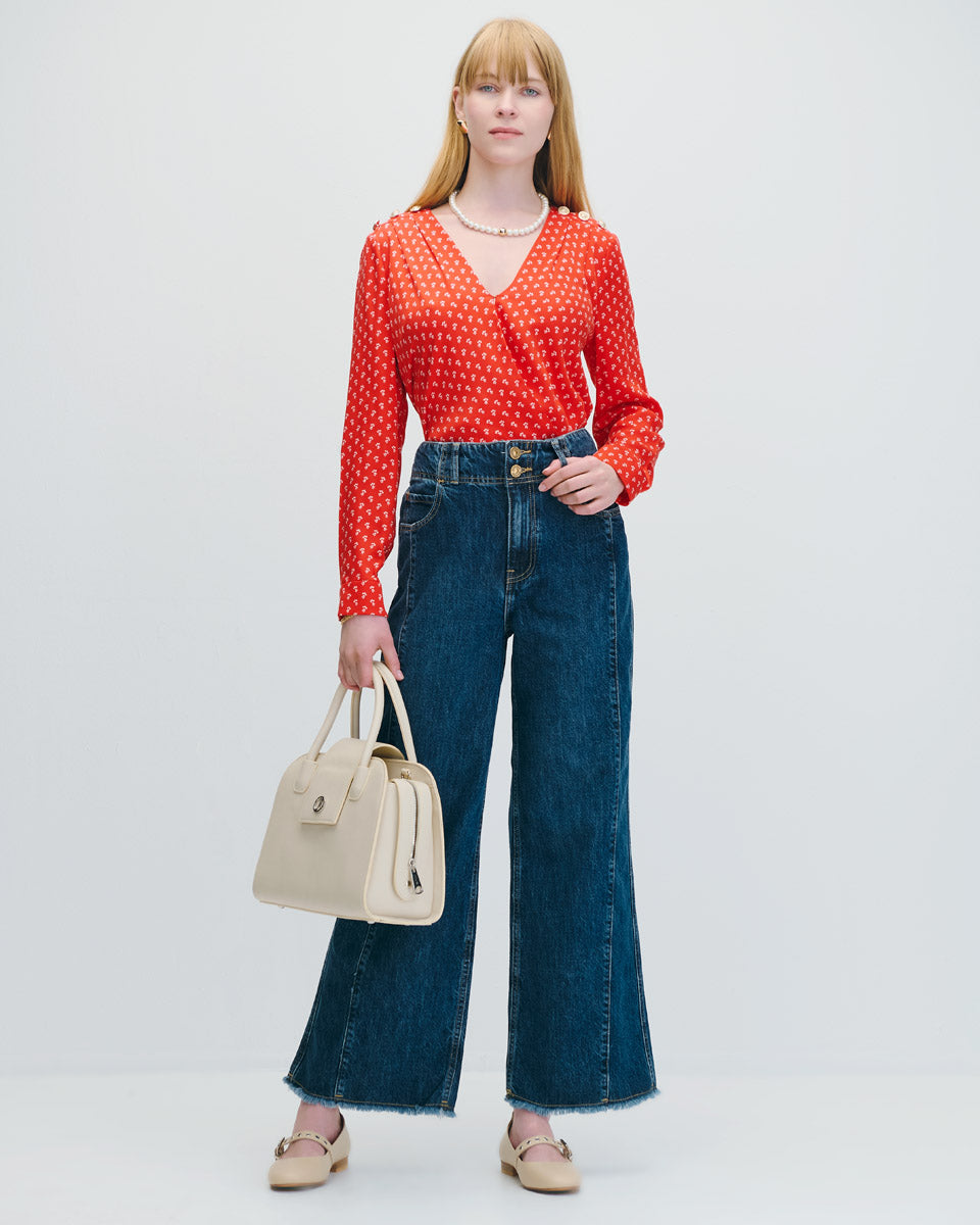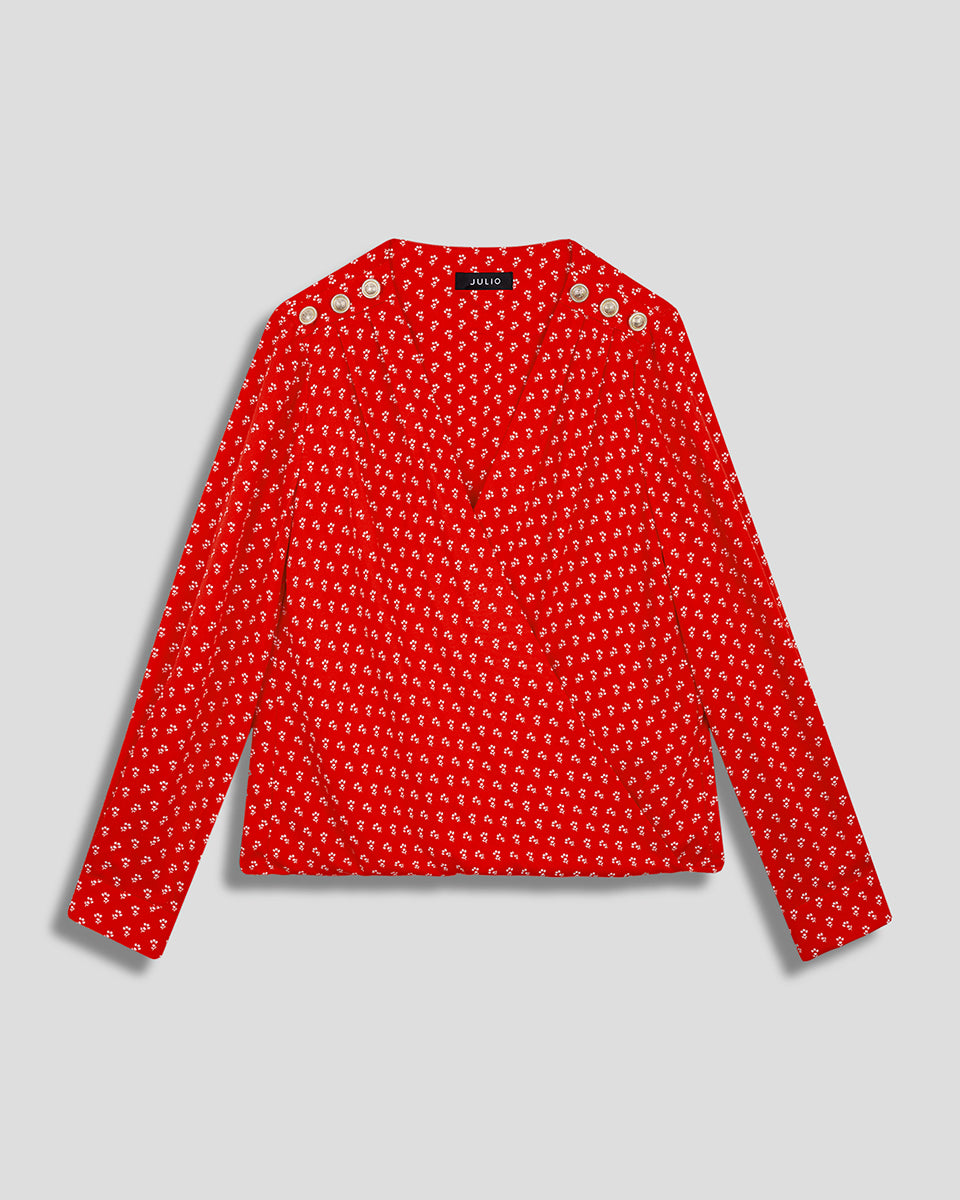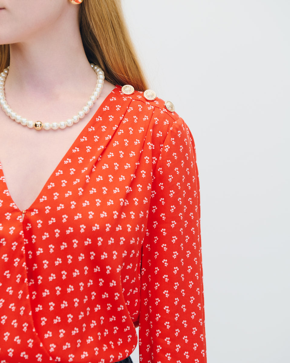 Blusa Envolvente Rojo Escarlata Mini Print Floral Botones Dorados Y Alforzas En Hombro